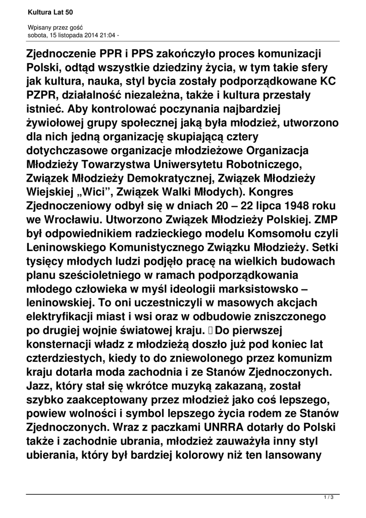 Kultura Lat 50 Wpisany przez gość sobota, 15 listopada 2014 21:04 - Zjednoczenie PPR i PPS zakończyło proces komunizacji Polski, odtąd wszystkie dziedziny życia, w tym takie sfery jak kultura, nauka, styl bycia zostały podporządkowane KC PZPR, działalność niezależna, także i kultura przestały istnieć. Aby kontrolować poczynania najbardziej żywiołowej grupy społecznej jaką była młodzież, utworzono dla nich jedną organizację skupiającą cztery dotychczasowe organizacje młodzieżowe Organizacja Młodzieży Towarzystwa Uniwersytetu Robotniczego, Związek Młodzieży Demokratycznej, Związek Młodzieży Wiejskiej „Wici”, Związek Walki Młodych). Kongres Zjednoczeniowy odbył się w dniach 20 – 22 lipca 1948 roku we Wrocławiu. Utworzono Związek Młodzieży Polskiej. ZMP był odpowiednikiem radzieckiego modelu Komsomołu czyli Leninowskiego Komunistycznego Związku Młodzieży. Setki tysięcy młodych ludzi podjęło pracę na wielkich budowach planu sześcioletniego w ramach podporządkowania młodego człowieka w myśl ideologii marksistowsko – leninowskiej. To oni uczestniczyli w masowych akcjach elektryfikacji miast i wsi oraz w odbudowie zniszczonego po drugiej wojnie światowej kraju. Do pierwszej konsternacji władz z młodzieżą doszło już pod koniec lat czterdziestych, kiedy to do zniewolonego przez komunizm kraju dotarła moda zachodnia i ze Stanów Zjednoczonych. Jazz, który stał się wkrótce muzyką zakazaną, został szybko zaakceptowany przez młodzież jako coś lepszego, powiew wolności i symbol lepszego życia rodem ze Stanów Zjednoczonych. Wraz z paczkami UNRRA dotarły do Polski także i zachodnie ubrania, młodzież zauważyła inny styl ubierania, który był bardziej kolorowy niż ten lansowany 1/3 Kultura Lat 50 Wpisany przez gość sobota, 15 listopada 2014 21:04 - choćby przez organizacje młodzieżową. ZMP lansował zupełnie inny styl mianowicie z braku materiału wzorcowy aktywista ZMP ubrany był w zieloną koszulę i czerwony krawat. Na ulicach pojawili się młodzi ubrani zupełnie inaczej. Określani mianem bikiniarzy nosili szerokie marynarki, najczęściej w kratę, kolorową koszulę i kolorowy krawat, spodnie zwężające się u nogawki i sławne, jakże charakterystyczne kolorowe skarpety, w tym czasie zupełnie gryzące się z kanonami szaro – burej mody. Każdy bikiniarz był fanem muzyki jazz a przede wszystkim zafascynowany był kulturą zachodnią. Bikiniarstwo było zakazane łącznie ze wspomnianym jazzem i coca colą. Do całości propagandy dorzucono później stonkę, którą wywiad amerykański miał eksportować w celu zmniejszenia plonów ziemniaka w krajach socjalistycznych. Milicja Obywatelska urządzała „polowanie” na nowe zjawisko kulturalne w Polsce. Na prywatkach, tam gdzie słuchano kolejnej „złej eksportowej” muzyki boogie -woogie, MO atakowała bawiących się. Dochodziło do absurdalnych sytuacji, kiedy to bikiniarz chcący oglądnąć film w kinie, była na siłę wyciągany z siedzenia i bity przez milicjanta. Bikiniarski problem ucichł po śmierci Stalina, gdy w 1953 roku nastąpiła tzw. „odwilż”. Całe zjawisko zanikło pod koniec lat pięćdziesiątych. W latach sześćdziesiątych pojawiła się inna nowa kontestacja o zabarwieniu antykomunistycznym. Jazz wkrótce stał się muzyką „legalną”. Pierwszym znanym polskim zespołem jazzowym był zespół „Melomani”, który grał jeszcze w podziemiu. W 1954 roku w Krakowie sławny polski jazzman Andrzej Kurylewicz zorganizował tzw. 2/3 Kultura Lat 50 Wpisany przez gość sobota, 15 listopada 2014 21:04 - Zaduszki Jazzowe, a w 1956 roku odbył się w Sopocie I Ogólnopolski Festiwal Muzyki Jazzowej. W 1958 roku odbył się pierwszy Festiwal Jazz Jamboree. 3/3