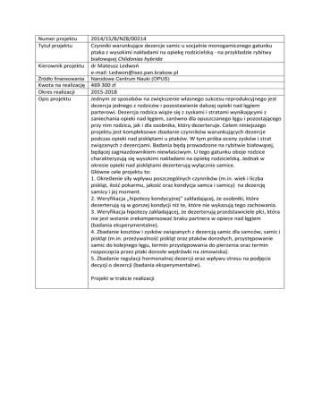 Numer projektu Tytuł projektu Kierownik projektu 2014/15/B/NZ8/00214 Czynniki warunkujące dezercje samic u socjalnie monogamicznego gatunku ptaka z wysokimi nakładami na opiekę rodzicielską - na przykładzie rybitwy białowąsej Chlidonias hybrida dr Mateusz Ledwoń e-mail: [email protected] Źródło finansowania Narodowe Centrum Nauki (OPUS) Kwota na realizację Okres realizacji Opis projektu 469 300 zł 2015-2018 Jednym ze sposobów na zwiększenie własnego sukcesu reprodukcyjnego jest dezercja jednego z rodziców i pozostawienie dalszej opieki nad lęgiem parterowi. Dezercja rodzica wiąże się z zyskami i stratami wynikającymi z zaniechania opieki nad lęgiem, zarówno dla opuszczanego lęgu i pozostającego przy nim rodzica, jak i dla osobnika, który dezerteruje. Celem niniejszego projektu jest kompleksowe zbadanie czynników warunkujących dezercje podczas opieki nad pisklętami u ptaków. W tym próba oceny zysków i strat związanych z dezercjami. Badania będą prowadzone na rybitwie białowąsej, będącej zagniazdownikiem niewłaściwym. U tego gatunku oboje rodzice charakteryzują się wysokimi nakładami na opiekę rodzicielską. Jednak w okresie opieki nad pisklętami dezerterują wyłącznie samice. Główne cele projektu to: 1. Określenie siły wpływu poszczególnych czynników (m.in. wiek i liczba piskląt, ilość pokarmu, jakość oraz kondycja samca i samicy) na dezercję samicy i jej moment. 2. Weryfikacja „hipotezy kondycyjnej” zakładającej, że osobniki, które dezerterują są w gorszej kondycji niż te, które nie wykazują tego zachowania. 3. Weryfikacja hipotezy zakładającej, że dezerterują przedstawiciele płci, która nie jest wstanie zrekompensować braku partnera w opiece nad lęgiem (badania eksperymentalne). 4. Zbadanie kosztów i zysków związanych z dezercją samic dla samców, samic i piskląt (m.in. przeżywalność piskląt oraz ptaków dorosłych, przystępowanie samic do kolejnego lęgu, termin przystępowania do pierzenia oraz termin rozpoczęcia przez ptaki dorosłe wędrówki na zimowiska). 5. Zbadanie regulacji hormonalnej dezercji oraz wpływu stresu na podjęcie decyzji o dezercji (badania eksperymentalne). Projekt w trakcie realizacji