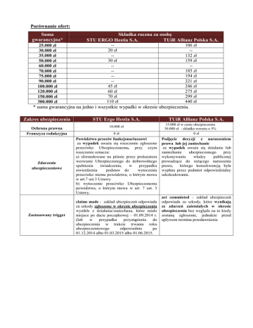Porównanie ofert: Suma gwarancyjna* 25.000 zł 30.000 zł 35.000 zł 50.000 zł 60.000 zł 70.000 zł 75.000 zł 90.000 zł 100.000 zł 120.000 zł 150.000 zł 300.000 zł Składka roczna za osobę STU ERGO Hestia S.A. TUiR Allianz Polska S.A. -20 zł -30 zł ----45 zł 60 zł 70 zł 110 zł 106 zł -132 zł 159 zł -185 zł 194 zł 221 zł 246 zł 275 zł 299 zł 440 zł * suma gwarancyjna na jedno i wszystkie wypadki w okresie ubezpieczenia. Zakres ubezpieczenia Ochrona prawna Franszyza redukcyjna Zdarzenie ubezpieczeniowe Zastosowany trigger STU Ergo Hestia S.A. 10.000 zł 0 zł Powództwo przeciw funkcjonariuszowi za wypadek uważa się roszczenie zgłoszone przeciwko Ubezpieczonemu, przy czym roszczenie oznacza: a) sformułowane na piśmie przez prokuratora wezwanie Ubezpieczonego do dobrowolnego spełnienia świadczenia, w przypadku stwierdzenia podstaw do wytoczenia przeciwko niemu powództwa, o którym mowa w art.7 ust.3 Ustawy b) wytoczenie przeciwko Ubezpieczonemu powództwa, o którym mowa w art. 7 ust. 3 Ustawy, claims made - zakład ubezpieczeń odpowiada za szkody zgłoszone w okresie ubezpieczenia wynikłe z działania/zaniechana, które miało miejsce po dacie początkowej – 01.09.2014 r. (lub w przypadku przystąpienia do ubezpieczenia w trakcie trwania roku ubezpieczeniowego odpowiednio po 01.12.2014 albo 01.03.2015 albo 01.06.2015. TUiR Allianz Polska S.A. 15.000 zł w cenie ubezpieczenia 30.000 zł - składka wzrasta o 5% 0 zł Podjęcie decyzji z naruszeniem prawa lub jej zaniechanie za wypadek uważa się działanie lub zaniechanie ubezpieczonego przy wykonywaniu władzy publicznej prowadzące do rażącego naruszenia prawa, którego konsekwencją była wypłata przez podmiot odpowiedzialny odszkodowania. act commieted – zakład ubezpieczeń odpowiada za szkody, które wynikają ze zdarzeń zaistniałych w okresie ubezpieczenia bez względu na to kiedy zostaną zgłoszone, jednakże przed upływem terminu przedawnienia • Wina umyślna • Odpowiedzialność Ubezpieczonego niewynikająca z Ustawy • Wina umyślna • Odpowiedzialność Ubezpieczonego niewynikająca z Ustawy • Szkody wyrządzone osobom bliskim względem Ubezpieczonego • Szkody związane z wykonywaniem władzy publicznej w okresie wojny, wojny domowej, stanu wojennego, rewolucji, rozruchów, zamieszek społecznych • Szkody za które Ubezpieczony jest odpowiedzialny wskutek umownego przejęcia odpowiedzialności innej osoby • Okres roczny od 1 września 2014 roku • Przystąpienie do ubezpieczenia odbywa się w okresach kwartalnych. Nowa grupa osób, które wypełniły deklarację do 15 listopada albo 15 lutego albo 15maja przystąpi do ubezpieczenia odpowiednio z dniem 1 grudnia, 1 maca, 1 czerwca (składka pobierana w wysokości proporcjonalnej do okresu ubezpieczenia. • Gwarancja odnowienia ubezpieczenia na kolejny rok (1 września 2015 do 31 sierpnia 2016r) – nowe warunki ubezpieczenia będą dostępne wraz ze zbliżającym się końcem okresu ubezpieczenia • Ubezpieczenie dla pracowników służb celnych oraz izb skarbowych podlega 20% zwyżce • Okres roczny od 17 maja 2014 roku • Możliwość przystąpienia do ubezpieczenia w dowolnym momencie od 17 maja 2014 do 16 maja 2015 r. (okres ubezpieczenia: od dnia wypełnienia wniosku do 16 maja 2015r – składka pobierana w wysokości proporcjonalnej do okresu ubezpieczenia) Wyłączenia odpowiedzialności Okres ubezpieczenia/ przystąpienie do ubezpieczenia Inne • Ochrona ubezpieczenia z tytułu roszczeń dochodzonych na podstawie Kodeksu Pracy. Suma gwarancyjna – 50 000 zł • Możliwość podwojenia sumy ubezpieczenia na wszystkie wypadki (suma ubezpieczenia na jeden wypadek pozostaje wówczas bez zmian) – 20% wzrostu składki • Możliwość potrojenia sumy ubezpieczenia na wszystkie wypadki (suma ubezpieczenia na jeden wypadek pozostaje wówczas bez zmian) – 30% wzrostu składki