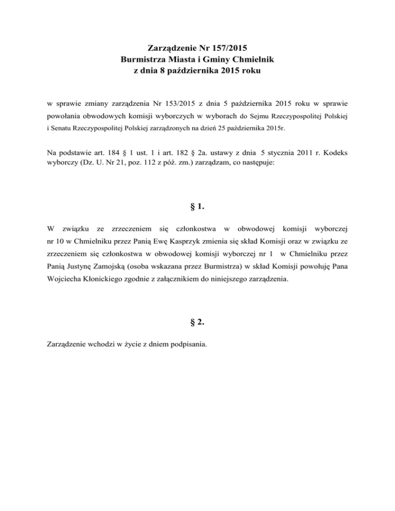 Zarządzenie Nr 157/2015 Burmistrza Miasta i Gminy Chmielnik z dnia 8 października 2015 roku w sprawie zmiany zarządzenia Nr 153/2015 z dnia 5 października 2015 roku w sprawie powołania obwodowych komisji wyborczych w wyborach do Sejmu Rzeczypospolitej Polskiej i Senatu Rzeczypospolitej Polskiej zarządzonych na dzień 25 października 2015r. Na podstawie art. 184 § 1 ust. 1 i art. 182 § 2a. ustawy z dnia 5 stycznia 2011 r. Kodeks wyborczy (Dz. U. Nr 21, poz. 112 z póź. zm.) zarządzam, co następuje: § 1. W związku ze zrzeczeniem się członkostwa w obwodowej komisji wyborczej nr 10 w Chmielniku przez Panią Ewę Kasprzyk zmienia się skład Komisji oraz w związku ze zrzeczeniem się członkostwa w obwodowej komisji wyborczej nr 1 w Chmielniku przez Panią Justynę Zamojską (osoba wskazana przez Burmistrza) w skład Komisji powołuję Pana Wojciecha Kłonickiego zgodnie z załącznikiem do niniejszego zarządzenia. § 2. Zarządzenie wchodzi w życie z dniem podpisania. Załącznik do Zarządzenia Nr 157/2015 z dnia 8 października 2015r. Składy obwodowych komisji wyborczych na terenie Miasta i Gminy Chmielnik w wyborach zarządzonych na dzień 25 października 2015 roku: Obwodowa Komisja Wyborcza Nr 1 w Chmielniku - Gimnazjum im. Gen. K. Tańskiego w Chmielniku ul. Szkolna 7: L.p. Imię i Nazwisko Miejsce Zamieszkania Zgłaszający 1. Anetta Mazur Chmielnik KW KORWiN 2. Joanna Długosz Chmielnik KKW Zjednoczona Lewica SLD+TR+PPS+UP+Zieloni 3. Małgorzata Jabłońska Chmielnik Komitet Wyborczy PSL 4. Marta Musiał Chmielnik KW Platforma Obywatelska RP 5. Beata Mleczko Chmielnik KW Prawo i Sprawiedliwość 6. Anna Lesiak Ługi KWW Grzegorza Brauna „Szczęść Boże!” 7. Krystyna Przeździk Chmielnik KWW JOW Bezpartyjni 8. Małgorzata Stępień Chmielnik KWW „Kukiz’15” 9. Wojciech Kłonicki Chmielnik Osoba wskazana przez Burmistrza Obwodowa Komisja Wyborcza Nr 2 w Chmielniku – Biblioteka Publiczna w Chmielniku, ul. Wspólna 13: L.p. Imię i Nazwisko Miejsce Zamieszkania Zgłaszający 1. Jolanta Rzadkowska Chmielnik 2. Justyna Doroz Chmielnik 3. Waldemar Ślusarski 4. Maria Borek Chmielnik KW KORWiN KWW Bezpartyjny i Niezależny Kamil Suchański KKW Zjednoczona Lewica SLD+TR+PPS+UP+Zieloni Komitet Wyborczy PSL 5. Ewa Kwiecień Chmielnik KW Prawo i Sprawiedliwość 6. Anna Michalczyk Suchowola 7. Dawid Raczyński Chmielnik KWW Grzegorza Brauna „Szczęść Boże!” KW Nowoczesna Ryszarda Petru 8. Łukasz Śliwa Chmielnik KWW „Kukiz’15” 9. Bożena Trela Zrecze Duże Osoba wskazana przez Burmistrza Celiny Obwodowa Komisja Wyborcza Nr 3 w Chmielniku – Szkoła Podstawowa im. Stefana Żeromskiego w Chmielniku ul. Szkolna 7: L.p. Imię i Nazwisko Miejsce Zamieszkania Zgłaszający Śladków Mały KW KORWiN 1. Mariola Badura 2. Dorota Skrzypczyk Celiny KKW Zjednoczona Lewica SLD+TR+PPS+UP+Zieloni 3. Barbara Milewicz Śladków Mały Komitet Wyborczy PSL 4. Barbara Szymańska Chmielnik KW Platforma Obywatelska RP 5. Magdalena Piwowarska Ługi KWW Grzegorza Brauna „Szczęść Boże!” 6. Dominik Stradowski Chmielnik KW Nowoczesna Ryszarda Petru 7. Teresa Stradomska Śladków Mały KWW JOW Bezpartyjni 8. Mateusz Wojtas Ługi KWW „Kukiz’15” 9. Renata Łukawska Chmielnik Osoba wskazana przez Burmistrza Obwodowa Komisja Wyborcza Nr 4 w Kotlicach - Świetlica w Kotlicach, Kotlice 24: 1. Agnieszka Knapczyk Borzykowa 2. Milena Wójcik Chmielnik 3. Jolanta Pietryka Piotrkowice Zgłaszający KWW Bezpartyjny i Niezależny Kamil Suchański KKW Zjednoczona Lewica SLD+TR+PPS+UP+Zieloni Komitet Wyborczy PSL 4. Urszula Nowak Szyszczyce KW Platforma Obywatelska RP 5. Jowita Mikuśkiewicz Chmielnik KW Prawo i Sprawiedliwość 6. Anna Kalita 7. Małgorzata Kaczmarczyk Ciecierze KWW Grzegorza Brauna „Szczęść Boże!” KWW JOW Bezpartyjni 8. Justyna Wójcik Chmielnik KWW „Kukiz’15” 9. Jolanta Bogacz Kotlice Osoba wskazana przez Burmistrza L.p. Imię i Nazwisko Miejsce Zamieszkania Ługi Obwodowa Komisja Wyborcza Nr 5 w Lubani - Szkoła Podstawowa im. Stefana Żeromskiego w Chmielniku Filia w Lubani, Lubania 12: L.p. Imię i Nazwisko Miejsce Zamieszkania Zgłaszający Chmielnik KW KORWiN 1. Grzegorz Wesołowski 2. Wioletta Bębas Celiny KWW Bezpartyjny i Niezależny Kamil Suchański 3. Anna Lewicka Przededworze Komitet Wyborczy PSL 4. Iwona Sabat Lipy KW Platforma Obywatelska RP 5. Ireneusz Wojtas Ługi KW Prawo i Sprawiedliwość 6. Anna Raczyńska Chmielnik KW Nowoczesna Ryszarda Petru 7. Magdalena Bielecka Chmielnik KWW JOW Bezpartyjni 8. Katarzyna Janus Chmielnik KWW „Kukiz’15” 9. Robert Wójcik Chmielnik Osoba wskazana przez Burmistrza Obwodowa Komisja Wyborcza Nr 6 w Suchowoli - Szkoła Podstawowa im. Stefana Żeromskiego w Chmielniku Filia w Suchowoli, Suchowola 102: 1. Martyna Wolska Chmielnik 2. Zofia Styczeń Chmielnik 3. Monika Turlińska Chmielnik Zgłaszający KWW Bezpartyjny i Niezależny Kamil Suchański KKW Zjednoczona Lewica SLD+TR+PPS+UP+Zieloni Komitet Wyborczy PSL 4. Paweł Rzadkowski Piotrkowice KW Platforma Obywatelska RP 5. Aneta Wojtas Ługi KW Prawo i Sprawiedliwość 6. Karolina Stradowska Chmielnik KW Nowoczesna Ryszarda Petru 7. Patrycja Piras Suchowola KWW JOW Bezpartyjni 8. Anita Jabłońska Śladków Mały KWW „Kukiz’15” 9. Jolanta Pisarczyk Chmielnik Osoba wskazana przez Burmistrza L.p. Imię i Nazwisko Miejsce Zamieszkania Obwodowa Komisja Wyborcza Nr 7 w Zreczu Dużym - Szkoła Podstawowa im. Stefana Żeromskiego w Chmielniku Filia w Zreczu Dużym, Zrecze Duże 22: L.p. Imię i Nazwisko Miejsce Zamieszkania Zgłaszający 1. Grzegorz Ramski Chmielnik 2. Katarzyna Knapczyk Borzykowa 3. Renata Małasińska Zrecze Małe 4. Magdalena Stępień Śladków Duży KW KORWiN KWW Bezpartyjny i Niezależny Kamil Suchański KKW Zjednoczona Lewica SLD+TR+PPS+UP+Zieloni Komitet Wyborczy PSL 5. Paweł Rogala Chmielnik KW Platforma Obywatelska RP 6. Edyta Kozieł Zrecze Duże KW Prawo i Sprawiedliwość 7. Agnieszka Michalska Chmielnik KW 
