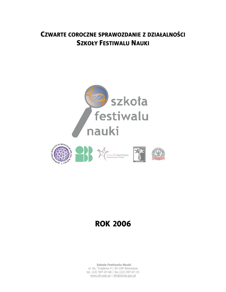 CZWARTE COROCZNE SPRAWOZDANIE Z DZIAŁALNOŚCI SZKOŁY FESTIWALU NAUKI UL Y OG OL ONA L IN ST TI IT NA F MO LE C ND C ELL B RA I A O TE U ROK 2006 Szkoła Festiwalu Nauki ul. Ks. Trojdena 4 | 02-109 Warszawa tel. (22) 597-07-68 | fax (22) 597-07-15 www.sfn.edu.pl | [email protected] INT ER SPIS TREŚCI: CZĘŚĆ PIERWSZA: SPRAWOZDANIE MERYTORYCZNE Z DZIAŁALNOŚCI W ROKU 2006 3 1. Kontynuacja regularnej działalności 3 1. 1. Warsztaty laboratoryjne dla młodzieży 3 1. 2. Warsztaty laboratoryjne dla finalistów XXXV Ogólnopolskiej Olimpiady Biologicznej 3 1. 3. Pozostałe warsztaty prowadzone dla dzieci i młodzieży w roku 2006 3 1. 4. Kursy dla nauczycieli 4 1. 5. Ogólnodostępne wykłady 5 1. 6. Udział w imprezach popularyzujących naukę 6 1. 7. Projekt „Staż 2006” 7 2. Europejski projekt VOLVOX – aktualności 8 2. 1. Spotkanie Konsorcjum, Warszawa 2 – 5. 06. 2006 8 2. 2. Inne aktywności Szkoły Festiwalu Nauki w ramach realizacji projektu VOLVOX 9 2. 3. Otrzymanie dofinansowania SPUB - M 9 9 3. Współpraca 3. 1. Propagowanie idei Szkoły Festiwalu Nauki 9 3. 2. Współpraca międzynarodowa 10 3. 3. Współpraca krajowa 10 4. Tegoroczne nowości 11 5. Plany na rok 2007 12 CZĘŚĆ DRUGA: INFORMACJA O DZIAŁALNOŚCI FUNDACJI BIOEDUKACJI 13 6. Działalność Fundacji BioEdukacji 13 6. 1. Podsumowanie realizacji kursu dla nauczycieli ”Współczesna biologia w szkole – wyzwanie dla nauczycieli” Szkoła Festiwalu Nauki ul. Ks. Trojdena 4 | 02-109 Warszawa tel. (22) 597-07-68 | fax (22) 597-07-15 www.sfn.edu.pl | [email protected] 14 2 CZĘŚĆ PIERWSZA: SPRAWOZDANIE MERYTORYCZNE Z DZIAŁALNOŚCI W ROKU 2006 1. Kontynuacja regularnej działalności 1. 1. Warsztaty laboratoryjne dla młodzieży W roku 2006 odbyło się łącznie 85 warsztatów dla młodzieży z klas licealnych i gimnazjalnych, w których uczestniczyło 1360 uczniów. Blisko połowa warsztatów była prowadzona przez studentów należących do Koła Naukowego Biotechnologii ze Szkoły Głównej Gospodarstwa Wiejskiego. Odbywały się one na terenie dwóch laboratoriów Szkoły Festiwalu Nauki: w Międzynarodowym Instytucie Biologii Molekularnej i Komórkowej (IIMCB) oraz w Szkole Głównej Gospodarstwa Wiejskiego (SGGW). Uczestnicy zajęć mieli do wyboru takie tematy jak: Zbadaj swój DNA, Na tropach białek, Zabawy z bakteriami, Zielona bakteria, Jak wycisnąć meduzę z bakterii i inne cuda biotechnologii. Opisy warsztatów znajdują się na stronie: http://ww.sfn.edu.pl/program.php?id=2. W warsztatach uczestniczyło 41 grup spoza Warszawy czyli blisko połowa wszystkich grup biorących udział w naszych zajęciach. Tendencja ta rośnie z roku na rok, młodzież przyjeżdża z tak odległych miejscowości jak: Częstochowa, Płock, Konin, Pułtusk, Łomża. Możliwość jednoczesnego prowadzenia zajęć w dwóch lokalizacjach tj. na terenie IIMCB i SGGW umożliwia odbycie zajęć większym grupom (32 lub nawet 36 uczniów), co zachęca do przyjazdu nauczycieli spoza Warszawy. 1. 2. Warsztaty laboratoryjne dla finalistów XXXV Ogólnopolskiej Olimpiady Biologicznej: W kwietniu 2006 podobnie jak w ubiegłych latach przeprowadziliśmy warsztaty w trakcie ogólnopolskiego finału XXXV Olimpiady dla kilkunastu finalistów oraz ich nauczycieli. W ramach współpracy z Komitetem Głównym Olimpiady Biologicznym Szkoła Festiwalu Nauki przeprowadziła również kurs szkoleniowy dla czwórki laureatów Olimpiady Biologicznej przed finałami międzynarodowymi w Argentynie. W ankietach wypełnianych po zajęciach wszyscy finaliści bardzo wysoko je ocenili, ponieważ były to jedyne warsztaty z praktycznej pracy laboratoryjnej, która w trakcie finału międzynarodowego stanowią wysoko punktowany element oceny. 1. 3. Pozostałe warsztaty prowadzone dla dzieci i młodzieży w roku 2006 W trakcie ferii zimowych 2006 oraz wakacji letnich 2006 przeprowadziliśmy szereg warsztatów dla dzieci ze szkół podstawowych w ramach akcji: Zima w mieście i Lato w mieście. Łącznie w zajęciach uczestniczyło ponad 500 uczniów z terenu całej Warszawy i najbliższych okolic. W trakcie zajęć dzieci poznawały podstawowe informacje o DNA, genach, dziedziczeniu i cechach genetycznych, budowały model DNA oraz izolowały DNA z warzyw, badały również działanie kilku enzymów. W trakcie ferii zimowych przeprowadziliśmy warsztaty dla około trzydzieściorga dzieci pracowników Instytutów założycielskich. W maju 2006 w trakcie interdyscyplinarnego obozu naukowego organizowanego przez Krajowy Fundusz na Rzecz Dzieci prowadziliśmy trzy rodzaje warsztatów, jeden dla uczniów ze szkół gimnazjalnych „Na tropach białek” oraz dwa dla uczniów szkoły podstawowej „Świat DNA”, „Enzymy wokół nas”. Szkoła Festiwalu Nauki ul. Ks. Trojdena 4 | 02-109 Warszawa tel. (22) 597-07-68 | fax (22) 597-07-15 www.sfn.edu.pl | [email protected] 3 W ramach projektu „Staż” (lipiec, sierpień) przeprowadziliśmy jednodniowe szkolenie wprowadzające dla wszystkich stażystów obejmujące podstawowe techniki laboratoryjne. We wrześniu przeprowadziliśmy również specjalne warsztaty dla 30-sto osobowej grupy polsko-niemieckiej młodzieży, która odwiedzała Międzynarodowy Instytut Biologii Molekularnej i Komórkowej w ramach projektu europejskiego „Einstein spotyka Marię Skłodowską-Curie”. 1. 4. Kursy dla nauczycieli W lutym 2006 Szkoła Festiwalu Nauki przeprowadziła dwudniowy kurs szkoleniowy dla 16 nauczycieli w Ropczycach. Kurs ten został zorganizowany przy wsparciu finansowym Urzędu Gminy Ropczyce oraz miejscowego Ośrodka Dokształcania dla Nauczycieli. We wrześniu 2006 w ramach europejskiego projektu „Noc Badaczy” koordynowanego przez Festiwal Nauki zorganizowaliśmy specjalne spotkanie – warsztaty dla nauczycieli ze szkół ponadpodstawowych (20 osób) pod tytułem „Eksperyment w szkole? To jest możliwe!” (dwa, dwugodzinne spotkania), w czasie których uczestnicy wykonali własnoręcznie c