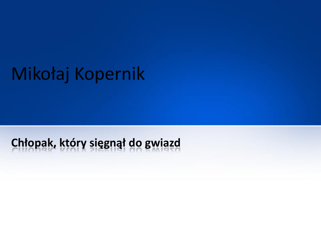 Mikołaj Kopernik Chłopak, który sięgnął do gwiazd Dom rodzinny Tata Mikołaj Kopernik Pochodził ze śląskiej wioski Koperniki. Był poważnym i szanowanym kupcem, najpierw w Krakowie, a następnie w Toruniu. Mama Barbara Kopernik (z domu Watzenrode) Pochodziła z zamożnej, mieszczańskiej rodziny. Jej ojciec Łukasz Watzenrode walczył przeciw Krzyżakom. Dom rodzinny • Mikołaj Kopernik urodził się 19 lutego 1473 roku o godz. 16:48 w Toruniu. • Kamienica, w której urodził się Mikołaj Kopernik stała przy ulicy św. Anny 17. Dom rodzinny - rodzeństwo Andrzej Kopernik Najstarszy z czworga rodzeństwa. Razem z Mikołajem studiował w Krakowie i na włoskich uniwersytetach Barbara Kopernik Jako nastolatka wstąpiła do zakonu sióstr cysterek w Chełmie. Tam też przebywała do końca życia Katarzyna Kopernik Gdy była dorosła wyszła za mąż za krakowskiego kupca i miała z nim pięcioro dzieci. Zabawy w czasach Kopernika • • • • • • • • Rzucanie i kopanie piłki; Toczenie obręczy za pomocą patyczka; Chodzenie na szczudłach; Gra w ganianego (berek); Ciuciubabka; Zabawa w chowanego; Rzucanie kamieniami do starej beczki Kręcenie drewnianego bąka; Kopernik – co to takiego? • Słowo Kopernik pochodzi od wyrazu Kopper (Copper), a słowo to w języku łacińskim, niemieckim i angielskim oznacza miedź. Edukacja Mikołaja • Mikołaj dzięki zamożności rodziny mógł kształcić się w najlepszych szkołach i na najlepszych uniwersytetach; • Pierwsze kroki w edukacji Mikołaj stawiał w szkole parafialnej przy katedrze pod wezwaniem świętych Janów Chrzciciela i Ewangelisty; Edukacja Mikołaja • Jako osiemnastolatek zapisał się na studia w Akademii Krakowskiej; Polak czy Niemiec Donnerwetter! Kopernik był Niemcem! Pisał tylko po łacinie i po niemiecku. Nie znamy żadnego dokumentu po polsku, jaki napisał. Kogo chcecie nabrać? W tamtych czasach dokumenty w naszej części Europy sporządzano po łacinie lub po niemiecku. Tak samo robili, Czesi, Pomorzanie, Węgrzy i Slązacy. To co, wszyscy byli Niemcami? Ja, Ja! Niemcy ponad wszystko! Koperniki urodził się w niemieckim mieście! Hola! Hola! Kiedy Kopernik przyszedł na świat, Toruń leżał już w granicach Polski. Kto obronił Olsztyn przed Krzyżakami? Kopernik! Więc nadal twierdzicie, ze był Niemcem? Polak czy Niemiec Jego mama nosiła niemieckie nazwisko Watzenrode A rycerze z rodu Watzenrode dawali Krzyżakom niezłego łupnia na polach bitew; Mikołaj, gdy studiował w Bolonii, zapisał się do wspólnoty studentów niemieckich. Bo wspólnoty studentów polskich tam nie było, a trzeba przecież zawiązywać nowe znajomości. Kopernik mówił biegle po niemiecku, to z kim miał się przyjaźnić? Z Hiszpanami? Nie zapomnijcie, ze Kopernik złożył przysięgę wierności Królowi polskiemu, a więc stał się jego poddanym. Toruń • Rozrywki w mieście: – Na rynku organizowano targi i jarmarki; – Rzemieślnicy zrzeszeni w cechach uczestniczyli w zawodach strzeleckich; – W święta kościelne ulicami ciągnęły wielkie procesje; – Z okazji Wielkiej Nocy odgrywano widowiska ukazujące sceny z Biblii; – Na rynku kat wymierzał kary przestępcom; Toruń • Zyski miasto czerpało z: – portu wiślanego; – składów soli; – królewskiej mennicy; – z targów i jarmarków; – z przechowywania żywności i towarów w spichrzach i magazynach; Szkoła przy katedrze • Co było najważniejsze w średniowiecznej szkole? • rózga Szkoła przy katedrze • Za co karano rózgą: – gdy uczeń nie zapamiętał lekcji; – gdy uczeń źle powtórzył lekcję; – gdy nie nauczył się na pamięć; – gdy zachowywał się nieelegancko; Szkoła przy katedrze • Wygląd klasy: nauczyciel mówił stojąc na tzw. katedrze lub siedząc na ozdobnym krześle; uczniowie siedzieli na słomie rozścielonej na podłodze lub na twardych długich ławach ustawionych przy dębowym stole; Jak i na czym pisano? • średniowieczne dokumenty sporządzano na pergaminie; Jak i na czym pisano? • na pergaminie pisano gęsim piórem lub zaostrzoną odpowiednio trzcinką i atramentem; Jak i na czym pisano? • ze względu na to, ze pergamin był bardzo drogi, a papier wchodził dopiero do użytku uczniowie pisali na drewnianych tabliczkach pokrytych woskiem; Co Kopernik miał w tornistrze? • nic nie miał, bo nie posiadał tornistra! • do szkoły nosiło się tylko tabliczkę do pisania; • podręczników nie było; jedyna książkę miał nauczyciel; Co się umiało po ukończeniu szkoły? • uczniowie umieli na pamięć dzieło pod tytułem „Dystychy Katona” – najważniejsze zasady moralne i nauki prawidłowego postępowania; • czytać; • liczyć • ładnie się wysławiać; • myśleć logicznie; • orientować się w kalendarzu; czego uczono w średniowiecznej szkole? Trivium Quadrivium podstawy gramatyki łacińskiej algebra geometria retoryka astronomia dialektyka muzyka Plan lekcji Mikołaja Obyczaje w czasach Kopernika • Koszmar przechodnia; • plucie pod stół • łyżka, nóż i widelec opis uczty (…) Biskup Watzenrode, mówiąc z pełnymi ustami, wyrzuca za siebie kości indycze. Zaraz schwycą je psy warujące tuż obok. Mikołaj nie może przeżuć niedopieczonego ścięgna, więc wypluwa niejadalny kawałek pod stół. Rycerz von Allen śmieje się i spluwa pod nogi, a następnie bierze nos w dwa palce i smarka na podłogę. Kupiec Walenty podjadłszy mięsiwa, niezbyt dyskretnie puszcza wiatry, po czym wychyla potężny łyk piwa i beka Człowiek renesansu • średniowieczne Memento mora, a renesansowe Carpe diem; • człowiek renesansu, czyli człowiek, który ma rozległe zainteresowania i rozległą wiedzę w wielu dziedzinach; Ludzie renesansu • Leonardo da Vinci Leonardo da Vinci malarz, architekt, rzeźbiarz, matematyk, biolog, zasłużył się do poznania anatomii człowieka – był wszechstronnie utalentowany Leonardo da Vinci Mona
