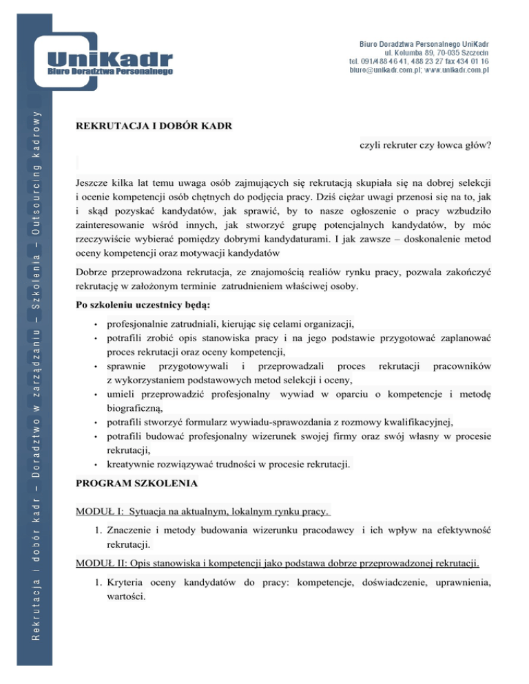 REKRUTACJA I DOBÓR KADR czyli rekruter czy łowca głów? Jeszcze kilka lat temu uwaga osób zajmujących się rekrutacją skupiała się na dobrej selekcji i ocenie kompetencji osób chętnych do podjęcia pracy. Dziś ciężar uwagi przenosi się na to, jak i skąd pozyskać kandydatów, jak sprawić, by to nasze ogłoszenie o pracy wzbudziło zainteresowanie wśród innych, jak stworzyć grupę potencjalnych kandydatów, by móc rzeczywiście wybierać pomiędzy dobrymi kandydaturami. I jak zawsze – doskonalenie metod oceny kompetencji oraz motywacji kandydatów Dobrze przeprowadzona rekrutacja, ze znajomością realiów rynku pracy, pozwala zakończyć rekrutację w założonym terminie zatrudnieniem właściwej osoby. Po szkoleniu uczestnicy będą: • • • • • • • profesjonalnie zatrudniali, kierując się celami organizacji, potrafili zrobić opis stanowiska pracy i na jego podstawie przygotować zaplanować proces rekrutacji oraz oceny kompetencji, sprawnie przygotowywali i przeprowadzali proces rekrutacji pracowników z wykorzystaniem podstawowych metod selekcji i oceny, umieli przeprowadzić profesjonalny wywiad w oparciu o kompetencje i metodę biograficzną, potrafili stworzyć formularz wywiadu-sprawozdania z rozmowy kwalifikacyjnej, potrafili budować profesjonalny wizerunek swojej firmy oraz swój własny w procesie rekrutacji, kreatywnie rozwiązywać trudności w procesie rekrutacji. PROGRAM SZKOLENIA MODUŁ I: Sytuacja na aktualnym, lokalnym rynku pracy. 1. Znaczenie i metody budowania wizerunku pracodawcy i ich wpływ na efektywność rekrutacji. MODUŁ II: Opis stanowiska i kompetencji jako podstawa dobrze przeprowadzonej rekrutacji. 1. Kryteria oceny kandydatów do pracy: kompetencje, doświadczenie, uprawnienia, wartości. MODUŁ III: Planowanie strategii metody rekrutacji oraz oceny. 1. Search & selection, direct search, executive search, networking. 2. Metody i narzędzia stosowane w selekcji i ocenie kandydatów: analiza cv, wywiad w oparciu o kompetencje, metoda biograficzna, próbki pracy, inne. 3. Testy: psychologiczne, umiejętności, zdolności, rekomendacje, MODUŁ IV: Wywiad w oparciu o kompetencje. 1. Etapy rozmowy kwalifikacyjnej. 2. Definiowanie kompetencji i metody weryfikacji poprzez wywiad, opracowanie formularza wywiadu-sprawozdania z rozmowy kwalifikacyjnej. 3. Typy kandydatów: dominujący, gadatliwy, milczący. 4. Efektywność pytań otwartych, zamkniętych. 5. Technika lejka. MODUŁ V: Case study. 1. Przeprowadzenie rekrutacji od momentu opisu stanowiska poprzez wszystkie etapy aż do podjęcia decyzji o zatrudnieniu na przykładzie typowego stanowiska w firmie. MODUŁ VI: Typowe błędy i pułapki procesu oceniania. 1. Co wiedzą o autoprezentacji kandydaci, a co warto, by wiedział rekruter? MODUŁ VII: Komunikacja w procesie rekrutacji: 1. Komunikacja z kandydatami, z klientem wewnętrznym/zewnętrznym. 2. Rozwiązywanie problemów: mała lub duża podaż kandydatów, brak kandydatów, oczekiwania klienta wewnętrznego/zewnętrznego wobec kandydatów a realia rynku pracy, oczekiwania kandydata a poziom wynagrodzeń w firmie, tajna rekrutacja i inne – burza mózgów w oparciu o konkretne przykłady uczestników szkolenia. 3. Savoir-vivre w procesie rekrutacji. PODSUMOWANIE.