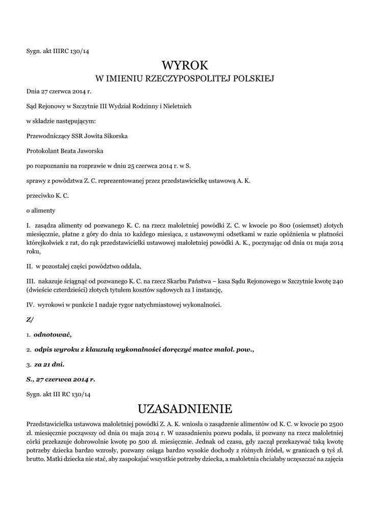 Sygn. akt IIIRC 130/14 WYROK W IMIENIU RZECZYPOSPOLITEJ POLSKIEJ Dnia 27 czerwca 2014 r. Sąd Rejonowy w Szczytnie III Wydział Rodzinny i Nieletnich w składzie następującym: Przewodniczący SSR Jowita Sikorska Protokolant Beata Jaworska po rozpoznaniu na rozprawie w dniu 25 czerwca 2014 r. w S. sprawy z powództwa Z. C. reprezentowanej przez przedstawicielkę ustawową A. K. przeciwko K. C. o alimenty I. zasądza alimenty od pozwanego K. C. na rzecz małoletniej powódki Z. C. w kwocie po 800 (osiemset) złotych miesięcznie, płatne z góry do dnia 10 każdego miesiąca, z ustawowymi odsetkami w razie opóźnienia w płatności którejkolwiek z rat, do rąk przedstawicielki ustawowej małoletniej powódki A. K., poczynając od dnia 01 maja 2014 roku, II. w pozostałej części powództwo oddala, III. nakazuje ściągnąć od pozwanego K. C. na rzecz Skarbu Państwa – kasa Sądu Rejonowego w Szczytnie kwotę 240 (dwieście czterdzieści) złotych tytułem kosztów sądowych za I instancję, IV. wyrokowi w punkcie I nadaje rygor natychmiastowej wykonalności. Z/ 1. odnotować, 2. odpis wyroku z klauzulą wykonalności doręczyć matce małol. pow., 3. za 21 dni. S., 27 czerwca 2014 r. Sygn. akt III RC 130/14 UZASADNIENIE Przedstawicielka ustawowa małoletniej powódki Z. A. K. wniosła o zasądzenie alimentów od K. C. w kwocie po 2500 zł. miesięcznie począwszy od dnia 01 maja 2014 r. W uzasadnieniu pozwu podała, iż pozwany na rzecz małoletniej córki przekazuje dobrowolnie kwotę po 500 zł. miesięcznie. Jednak od czasu, gdy zaczął przekazywać taką kwotę potrzeby dziecka bardzo wzrosły, pozwany osiąga bardzo wysokie dochody z różnych źródeł, w granicach 9 tyś zł. brutto. Matki dziecka nie stać, aby zaspokajać wszystkie potrzeby dziecka, a małoletnia chciałaby uczęszczać na zajęcia do szkoły muzycznej i na basen. Matka małoletniej pracuje jako nauczycielka i zarabia netto 2714 zł. miesięcznie, ma na utrzymaniu jeszcze dwóch synów oraz spłaca kredyt zaciągnięty na kupno i remont domu. Pozwany uznał powództwo do kwoty po 400 zł. miesięcznie. Sąd ustalił następujący stan faktyczny: Małoletnia powódka ma obecnie 11 lat, urodziła się (...) Będzie uczęszczała do V klasy szkoły podstawowej. Chodzi na taneczne zajęcia pozalekcyjne, za które jej matka płaci 45 zł. miesięcznie. Matka małoletniej powódki pracuje w Zespole Szkół w S. jako nauczycielka, zarabia netto ok. 2700 zł. miesięcznie. Małoletnia powódka mieszka z matką dwoma braćmi oraz ojcem matki. Na zakup domu matka małoletniej zaciągnęła kredyt, który spłaca w ratach po 550 zł. miesięcznie. Dom wymaga remontu, który jest wykonywany w miarę posiadanych przez matkę małoletniej środków, przeważnie na ten cel przeznacza otrzymywaną raz w roku trzynastkę. Z pensji jest jej potrącana pożyczka zaciągnięta w Kasie Zapomogowo Pożyczkowej w kwotach po 350 zł. miesięcznie. Pożyczkę przeznaczyła na zakup opału na zimę. Ponadto spłaca pożyczkę, w kwotach po 171 zł, którą dla niej zaciągnęła koleżanka. Ojciec matki powódki ma emeryturę w wysokości 800 zł. miesięcznie, dokłada do kosztów utrzymania domu po 200 zł. miesięcznie. Na młodszego syna matka powódki otrzymuje alimenty w wysokości po 1000 zł. miesięcznie, na starszego alimenty będą wypłacane jak od października podejmie studia. Opłaty za media wynoszą ok. 600 zł. miesięcznie. Matka małoletniej leczy się na nadciśnienie, przyjmuje stałe leki. Małoletnia jest uzdolniona muzycznie i plastycznie chciałaby uczęszczać na zajęcia muzyczne do ogniska muzycznego, za które opłata wynosi 150 zł. miesięcznie, jednak ojciec małoletniej odmówił pomocy w tym zakresie. Pozwany utrzymuje kontakty z małoletnią w ten sposób, że zabiera córkę na okresy około tygodniowe w czasie wakacji i ferii, sporadycznie kupuje dziecku ubrania oraz przekazuje okazjonalne prezenty. Małoletnia jest pod opieką ortodonty, która jeszcze tylko przez rok będzie bezpłatna /dowód: zaświadczenie o dochodach k. 4, wyciągi z konta k. 5-9, 18-45, 48-50, akt urodzenia k. 10, oświadczenie k. 14, faktura k. 15, zaświadczenia lekarskie k. 16, 17, rachunek za węgiel k. 46-47, oświadczenia majątkowe k. 51-70, wyjaśnienia matki małoletniej powódki k. 84-85/. Pozwany pracuje jako dyrektor szkoły Zespołu Szkół Nr (...) w E., zarabia brutto 5830 zł. miesięcznie. Spłaca pożyczkę mieszkaniową w zakładzie pracy, rata wynosi 406 zł. miesięcznie oraz kredyt w banku, rata wynosi 500 zł. miesięcznie. Pożyczki zostały zaciągnięte na zakup samochodu O. (...), rocznik 2005, za kwotę 21 tyś. zł. Aktualnie pozwany mieszka z rodzicami, którymi się opiekuje, w mieszkaniu rodziców. Swoje mieszkanie pozwany sprzedał, pieniądze /130 tyś. zł./ ze sprzedaży przeznaczy na wesele swojej pełnoletniej córki i opiekę nad rodzicami. Na jego utrzymaniu pozostaje także pełnoletni studiujący syn, na którego płaci alimenty po 300 zł. miesięcznie oraz opłaca jego studia w kwotach po 900 zł. kwartalnie. Żona pozwanego mieszka w O. we własnym mieszkaniu wraz z dwójką swoich dzieci, pracuje jako nauczycielka /dowód: harmonogram spłaty pożyczki k. 71, PIT k. 72-75, odpis wyroku k. 76, wyciągi z konta k. 77-79, 82, rachunek za leki k. 80, zaświadczeni o dochodach k. 81, uchwała Zarządu Powiatu k. 83, wyjaśnienia pozwanego k. 85/. Sąd zważył co następuje: Powództwo jest częściowo uzasadnione. Rozpatrując niniejszą sprawę Sąd oparł się na dokumentach przedłożonych przez strony, sporządzonych w przepisanej formie i przez kompetentne organy, tym samym korzystających z domniemania prawdziwości /art. 244 kpc/ oraz na dowodzie z wyjaśnień stron, które w zasadniczych kwestiach były bezsporne. W sferze sporu pozostaje ocena usprawiedliwionych potrzeb małoletniej powódki oraz możliwości zarobkowych i majątkowych pozwanego. Zakres i przedmiot obow