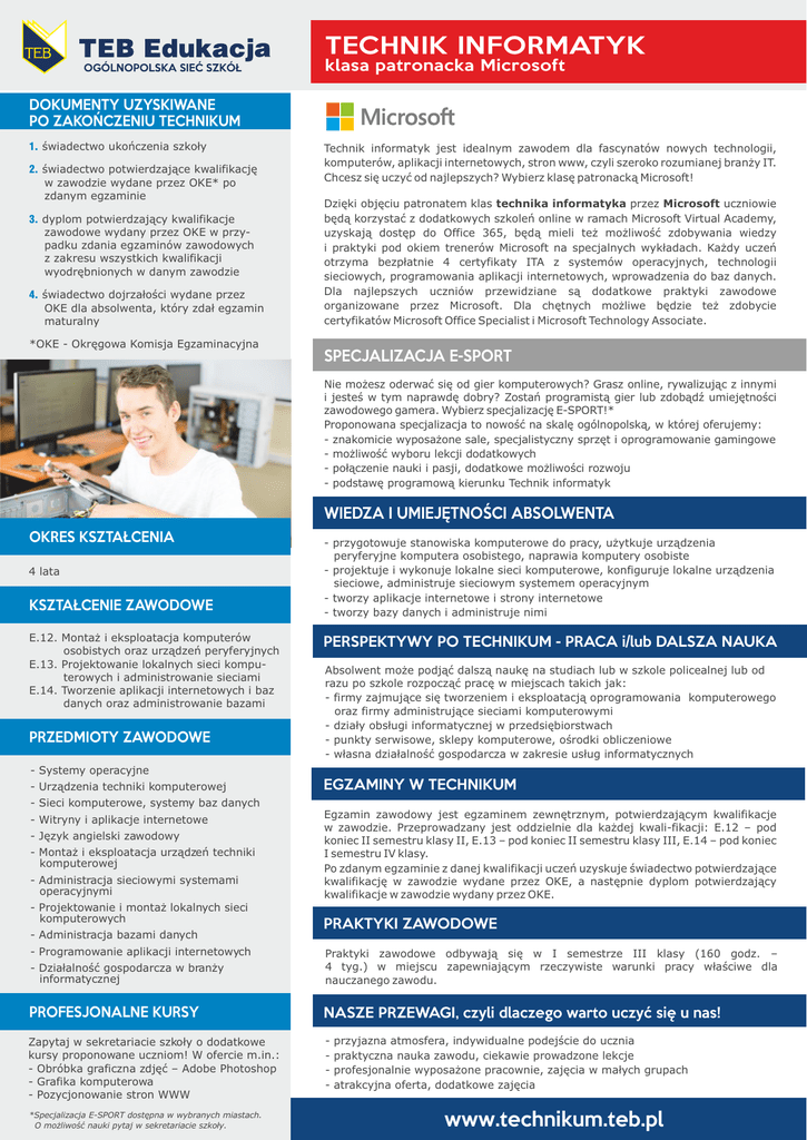 TECHNIK INFORMATYK klasa patronacka Microsoft DOKUMENTY UZYSKIWANE PO ZAKOŃCZENIU TECHNIKUM 1. świadectwo ukończenia szkoły 2. świadectwo potwierdzające kwalifikację w zawodzie wydane przez OKE* po zdanym egzaminie 3. dyplom potwierdzający kwalifikacje zawodowe wydany przez OKE w przypadku zdania egzaminów zawodowych z zakresu wszystkich kwalifikacji wyodrębnionych w danym zawodzie 4. świadectwo dojrzałości wydane przez OKE dla absolwenta, który zdał egzamin maturalny *OKE - Okręgowa Komisja Egzaminacyjna Technik informatyk jest idealnym zawodem dla fascynatów nowych technologii, komputerów, aplikacji internetowych, stron www, czyli szeroko rozumianej branży IT. Chcesz się uczyć od najlepszych? Wybierz klasę patronacką Microsoft! Dzięki objęciu patronatem klas technika informatyka przez Microsoft uczniowie będą korzystać z dodatkowych szkoleń online w ramach Microsoft Virtual Academy, uzyskają dostęp do Office 365, będą mieli też możliwość zdobywania wiedzy i praktyki pod okiem trenerów Microsoft na specjalnych wykładach. Każdy uczeń otrzyma bezpłatnie 4 certyfikaty ITA z systemów operacyjnych, technologii sieciowych, programowania aplikacji internetowych, wprowadzenia do baz danych. Dla najlepszych uczniów przewidziane są dodatkowe praktyki zawodowe organizowane przez Microsoft. Dla chętnych możliwe będzie też zdobycie certyfikatów Microsoft Office Specialist i Microsoft Technology Associate. SPECJALIZACJA E-SPORT Nie możesz oderwać się od gier komputerowych? Grasz online, rywalizując z innymi i jesteś w tym naprawdę dobry? Zostań programistą gier lub zdobądź umiejętności zawodowego gamera. Wybierz specjalizację E-SPORT!* Proponowana specjalizacja to nowość na skalę ogólnopolską, w której oferujemy: - znakomicie wyposażone sale, specjalistyczny sprzęt i oprogramowanie gamingowe - możliwość wyboru lekcji dodatkowych - połączenie nauki i pasji, dodatkowe możliwości rozwoju - podstawę programową kierunku Technik informatyk WIEDZA I UMIEJĘTNOŚCI ABSOLWENTA OKRES KSZTAŁCENIA 4 lata KSZTAŁCENIE ZAWODOWE E.12. Montaż i eksploatacja komputerów osobistych oraz urządzeń peryferyjnych E.13. Projektowanie lokalnych sieci komputerowych i administrowanie sieciami E.14. Tworzenie aplikacji internetowych i baz danych oraz administrowanie bazami PRZEDMIOTY ZAWODOWE - przygotowuje stanowiska komputerowe do pracy, użytkuje urządzenia peryferyjne komputera osobistego, naprawia komputery osobiste - projektuje i wykonuje lokalne sieci komputerowe, konfiguruje lokalne urządzenia sieciowe, administruje sieciowym systemem operacyjnym - tworzy aplikacje internetowe i strony internetowe - tworzy bazy danych i administruje nimi PERSPEKTYWY PO TECHNIKUM - PRACA i/lub DALSZA NAUKA Absolwent może podjąć dalszą naukę na studiach lub w szkole policealnej lub od razu po szkole rozpocząć pracę w miejscach takich jak: - firmy zajmujące się tworzeniem i eksploatacją oprogramowania komputerowego oraz firmy administrujące sieciami komputerowymi - działy obsługi informatycznej w przedsiębiorstwach - punkty serwisowe, sklepy komputerowe, ośrodki obliczeniowe - własna działalność gospodarcza w zakresie usług informatycznych - Systemy operacyjne - Urządzenia techniki komputerowej EGZAMINY W TECHNIKUM - Sieci komputerowe, systemy baz danych - Witryny i aplikacje internetowe - Język angielski zawodowy - Montaż i eksploatacja urządzeń techniki komputerowej - Administracja sieciowymi systemami operacyjnymi - Projektowanie i montaż lokalnych sieci komputerowych - Administracja bazami danych - Programowanie aplikacji internetowych Egzamin zawodowy jest egzaminem zewnętrznym, potwierdzającym kwalifikacje w zawodzie. Przeprowadzany jest oddzielnie dla każdej kwali-fikacji: E.12 – pod koniec II semestru klasy II, E.13 – pod koniec II semestru klasy III, E.14 – pod koniec I semestru IV klasy. Po zdanym egzaminie z danej kwalifikacji uczeń uzyskuje świadectwo potwierdzające kwalifikację w zawodzie wydane przez OKE, a następnie dyplom potwierdzający kwalifikacje w zawodzie wydany przez OKE. PRAKTYKI ZAWODOWE - Działalność gospodarcza w branży informatycznej Praktyki zawodowe odbywają się w I semestrze III klasy (160 godz. – 4 tyg.) w miejscu zapewniającym rzeczywiste warunki pracy właściwe dla nauczanego zawodu. PROFESJONALNE KURSY NASZE PRZEWAGI, czyli dlaczego warto uczyć się u nas! Zapytaj w sekretariacie szkoły o dodatkowe kursy proponowane uczniom! W ofercie m.in.: - Obróbka graficzna zdjęć – Adobe Photoshop - Grafika komputerowa - Pozycjonowanie stron WWW - *Specjalizacja E-SPORT dostępna w wybranych miastach. O możliwość nauki pytaj w sekretariacie szkoły. przyjazna atmosfera, indywidualne podejście do ucznia praktyczna nauka zawodu, ciekawie prowadzone lekcje profesjonalnie wyposażone pracownie, zajęcia w małych grupach atrakcyjna oferta, dodatkowe zajęcia www.technikum.teb.pl