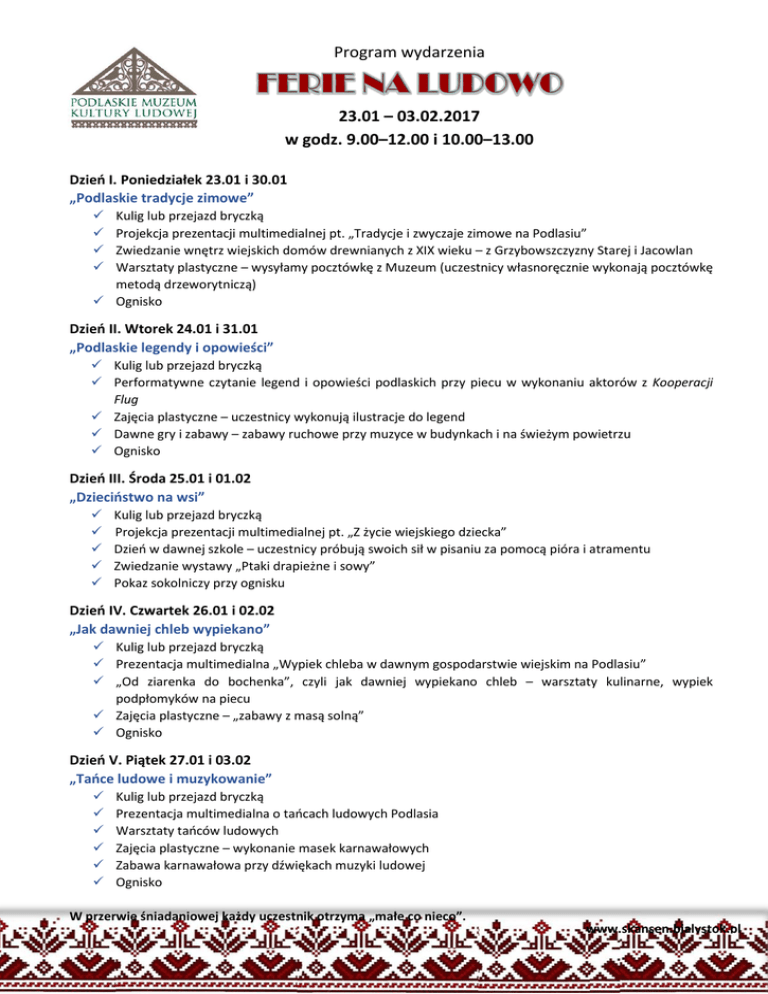 Program wydarzenia 23.01 – 03.02.2017 w godz. 9.00–12.00 i 10.00–13.00 Dzień I. Poniedziałek 23.01 i 30.01 „Podlaskie tradycje zimowe” Kulig lub przejazd bryczką Projekcja prezentacji multimedialnej pt. „Tradycje i zwyczaje zimowe na Podlasiu” Zwiedzanie wnętrz wiejskich domów drewnianych z XIX wieku – z Grzybowszczyzny Starej i Jacowlan Warsztaty plastyczne – wysyłamy pocztówkę z Muzeum (uczestnicy własnoręcznie wykonają pocztówkę metodą drzeworytniczą) Ognisko Dzień II. Wtorek 24.01 i 31.01 „Podlaskie legendy i opowieści” Kulig lub przejazd bryczką Performatywne czytanie legend i opowieści podlaskich przy piecu w wykonaniu aktorów z Kooperacji Flug Zajęcia plastyczne – uczestnicy wykonują ilustracje do legend Dawne gry i zabawy – zabawy ruchowe przy muzyce w budynkach i na świeżym powietrzu Ognisko Dzień III. Środa 25.01 i 01.02 „Dzieciństwo na wsi” Kulig lub przejazd bryczką Projekcja prezentacji multimedialnej pt. „Z życie wiejskiego dziecka” Dzień w dawnej szkole – uczestnicy próbują swoich sił w pisaniu za pomocą pióra i atramentu Zwiedzanie wystawy „Ptaki drapieżne i sowy” Pokaz sokolniczy przy ognisku Dzień IV. Czwartek 26.01 i 02.02 „Jak dawniej chleb wypiekano” Kulig lub przejazd bryczką Prezentacja multimedialna „Wypiek chleba w dawnym gospodarstwie wiejskim na Podlasiu” „Od ziarenka do bochenka”, czyli jak dawniej wypiekano chleb – warsztaty kulinarne, wypiek podpłomyków na piecu Zajęcia plastyczne – „zabawy z masą solną” Ognisko Dzień V. Piątek 27.01 i 03.02 „Tańce ludowe i muzykowanie” Kulig lub przejazd bryczką Prezentacja multimedialna o tańcach ludowych Podlasia Warsztaty tańców ludowych Zajęcia plastyczne – wykonanie masek karnawałowych Zabawa karnawałowa przy dźwiękach muzyki ludowej Ognisko W przerwie śniadaniowej każdy uczestnik otrzyma „małe co nieco”. www.skansen.bialystok.pl