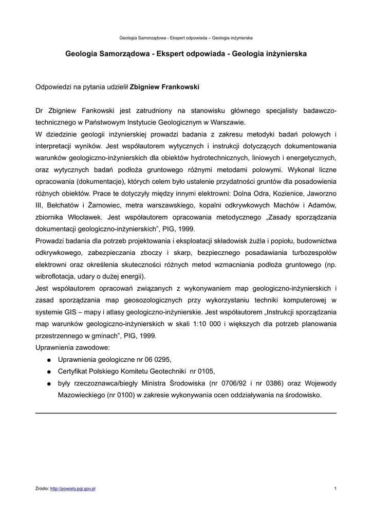 Geologia Samorządowa - Ekspert odpowiada – Geologia inżynierska Geologia Samorządowa - Ekspert odpowiada - Geologia inżynierska Odpowiedzi na pytania udzielił Zbigniew Frankowski Dr Zbigniew Fankowski jest zatrudniony na stanowisku głównego specjalisty badawczotechnicznego w Państwowym Instytucie Geologicznym w Warszawie. W dziedzinie geologii inżynierskiej prowadzi badania z zakresu metodyki badań polowych i interpretacji wyników. Jest współautorem wytycznych i instrukcji dotyczących dokumentowania warunków geologiczno-inżynierskich dla obiektów hydrotechnicznych, liniowych i energetycznych, oraz wytycznych badań podłoża gruntowego różnymi metodami polowymi. Wykonał liczne opracowania (dokumentacje), których celem było ustalenie przydatności gruntów dla posadowienia różnych obiektów. Prace te dotyczyły między innymi elektrowni: Dolna Odra, Kozienice, Jaworzno III, Bełchatów i Żarnowiec, metra warszawskiego, kopalni odkrywkowych Machów i Adamów, zbiornika Włocławek. Jest współautorem opracowania metodycznego „Zasady sporządzania dokumentacji geologiczno-inżynierskich”, PIG, 1999. Prowadzi badania dla potrzeb projektowania i eksploatacji składowisk żużla i popiołu, budownictwa odkrywkowego, zabezpieczania zboczy i skarp, bezpiecznego posadawiania turbozespołów elektrowni oraz określenia skuteczności różnych metod wzmacniania podłoża gruntowego (np. wibroflotacja, udary o dużej energii). Jest współautorem opracowań związanych z wykonywaniem map geologiczno-inżynierskich i zasad sporządzania map geosozologicznych przy wykorzystaniu techniki komputerowej w systemie GIS – mapy i atlasy geologiczno-inżynierskie. Jest współautorem „Instrukcji sporządzania map warunków geologiczno-inżynierskich w skali 1:10 000 i większych dla potrzeb planowania przestrzennego w gminach”, PIG, 1999. Uprawnienia zawodowe: ● Uprawnienia geologiczne nr 06 0295, ● Certyfikat Polskiego Komitetu Geotechniki nr 0105, ● były rzeczoznawca/biegły Ministra Środowiska (nr 0706/92 i nr 0386) oraz Wojewody Mazowieckiego (nr 0100) w zakresie wykonywania ocen oddziaływania na środowisko. Źródło: http://powiaty.pgi.gov.pl 1 Geologia Samorządowa - Ekspert odpowiada – Geologia inżynierska Budownictwo Jakie są zasady oceny warunków posadowienia i bezpieczeństwa budowli oraz ich wpływu na środowisko? Zasady oceny warunków posadowienia i bezpieczeństwa budowli należą do projektanta, geotechnika i są szczegółowo określone w normach (np. Eurokod). W dokumentacji geologiczno-inżynierskiej przedstawiona jest prognoza zmian w środowisku mogących powstać na skutek realizacji lub eksploatacji obiektów budowlanych, którą opracowuje się na podstawie wyników prac geologicznych oraz opis zjawisk i procesów geodynamicznych i antropogenicznych występujących na dokumentowanym terenie i w jego sąsiedztwie. Zasady oceny wpływu projektowanej inwestycji na środowisko powinny być szczegółowo określone w „Raporcie oddziaływania inwestycji na środowisko” opracowywanym w trakcie postępowania w sprawie Oceny Oddziaływania na Środowisko. Zakres opracowania Oceny Oddziaływania na środowisko został określony w ustawie z dnia 27 kwietnia 2001 r. Prawo ochrony środowiska (Dz.U.2001.62.627 ze zm.) oraz w ustawie o ochronie przyrody z dnia 16 kwietnia 2004 roku (Dz.U.04.92.880 ze zm.) W dokumentacji można odwołać się do istniejącego Raportu… lub postulować o sporządzenie takiego Raportu. Geolog wykonujący dokumentację może tylko w ogólny sposób zasygnalizować, na jakie elementy środowiska geologicznego będzie miała wpływ projektowana inwestycja. Pomocne materiały dotyczące oceny wpływu inwestycji na środowisko można znaleźć m.in. w: ● Poradniku przeprowadzania ocen oddziaływania na środowisko, pod redakcją W. Lenart i A. Tyszecki, Gdańsk 1998, ● Biuletynach Komisji do spraw Ocen Oddziaływania na Środowisko. Jakie są metody określania przydatności podłoża do celów budowlanych? Metody określania przydatności podłoża do celów budowlanych określa Instrukcja ITB 303. Ustalanie przydatności gruntów na potrzeby budownictwa. ITB. Warszawa 1990. oraz rozporządzenie Ministra Transportu i Gospodarki Morskiej z dnia 2 marca 1999 r. w sprawie warunków technicznych, jakim powinny odpowiadać drogi publiczne i ich usytuowanie (Dz. U. nr 43, poz. 430) dotycząca badań podłoża dla dróg. Jakie są nowe technologie w fundamentowaniu budowli? Obecnie istnieje wiele nowych technologii fundamentowania budowli. Metody te zależą od technologii opracowanych przez firmy, przedsiębiorstwa projektujące lub/i wykonujące fundamenty. Informacje na temat nowych technologii można znaleźć w ogólnie dostępnych czasopismach Źródło: http://powiaty.pgi.gov.pl 2 Geologia Samorządowa - Ekspert odpowiada – Geologia inżynierska branżowych lub materiałach konferencyjnych i seminaryjnych, np.: Inżynieria Morska i Geotechnika, GEOINŻYNIERIA drogi mosty tunele, seminarium - „Zmechanizowane metody budowy tuneli”(Warszawa, 2005). Do uznawanych za nowe technologie można zaliczyć: wibroflotację, wibrowymianę, mieszanie wgłębne, konsolidację dynamiczną, nowe technologie palowania. Na jakich zasadach powinni współdziałać pracownicy administracji geologicznej, nadzoru budowlanego i administracji architektoniczno-budowlanej w zakresie weryfikacji proponowanych rozwiązań dotyczących rozpoznania warunków geologiczno-inżynierskich (geotechnicznych)? W przypadkach budzących wątpliwości dotyczących rozpoznania warunków geologicznoinżynierskich lub geotechnicznych pracownicy administracji geologicznej mogą wystąpić do nadzoru budowlanego lub rzeczoznawcy budowlanego o opinię w zakresie ustalenia kategorii geotechnicznej projektowanego, modernizowanego i remontowanego obiektu. Mogą również wystąpić o opracowanie opinii do proponowanych rozwiązań dotyczących rozpoznan
