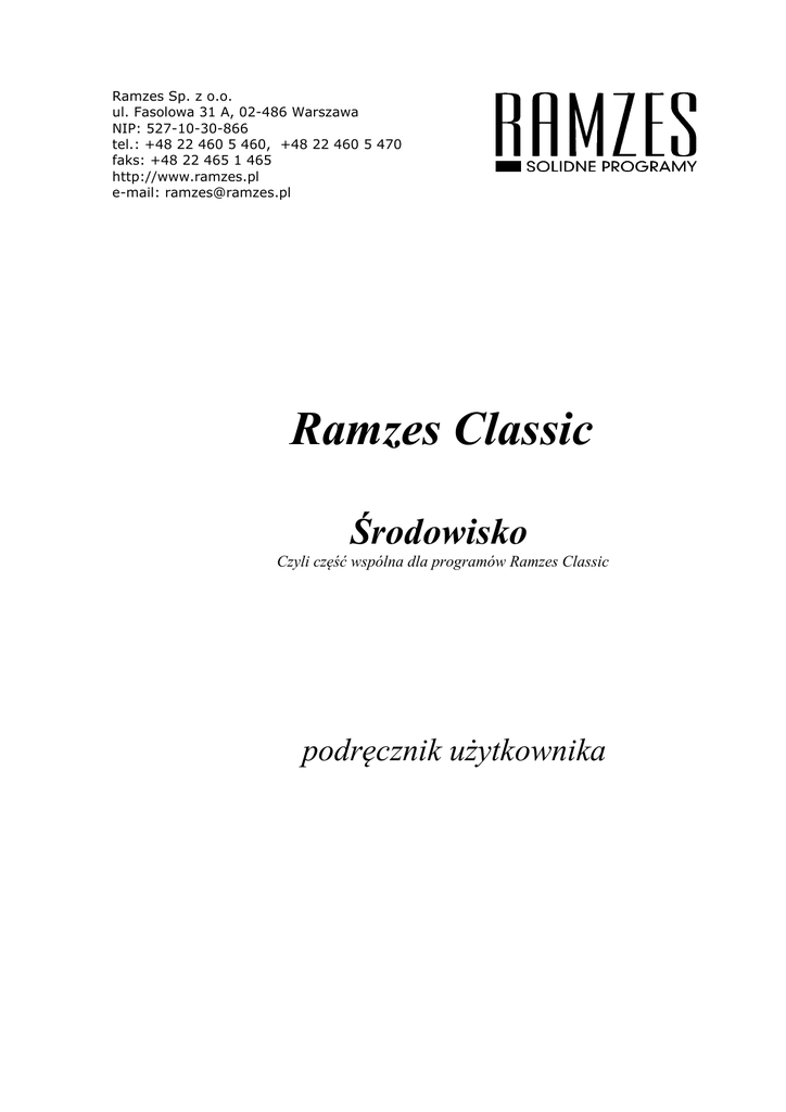 Ramzes Sp. z o.o. ul. Fasolowa 31 A, 02-486 Warszawa NIP: 527-10-30-866 tel.: +48 22 460 5 460, +48 22 460 5 470 faks: +48 22 465 1 465 http://www.ramzes.pl e-mail: [email protected] Ramzes Classic Środowisko Czyli część wspólna dla programów Ramzes Classic podręcznik użytkownika Ramzes Sp. z o.o. jest wyłącznym właścicielem praw, w tym wszelkich majątkowych praw autorskich do programu oraz treści podręcznika użytkownika. Powielanie w jakiejkolwiek formie programu lub treści podręcznika bez pisemnej zgody firmy Ramzes Sp. z o.o. jest zabronione. Opracowanie i skład: Ramzes Sp. z o.o. Warszawa, sierpień 2007 Ramzes Classic –Środowisko - podręcznik użytkownika I SPIS TREŚCI 1 2 3 4 5 6 7 8 Wstęp ........................................................................................................................................ 1-1 1.1 Forma prezentacji................................................................................................................ 1-1 O programie i podręczniku ....................................................................................................... 2-1 2.1 O Aplikacji Ramzes Classic................................................................................................ 2-1 2.2 Przeznaczenie Aplikacji Ramzes Classic............................................................................ 2-1 2.3 Wymagania sprzętowe ........................................................................................................ 2-2 2.4 Drukarki .............................................................................................................................. 2-2 2.5 Wyróżnienia stosowane w tekście....................................................................................... 2-3 2.6 Symbole używane w treści.................................................................................................. 2-3 2.7 Stosowane konwencje zapisu .............................................................................................. 2-4 Środowisko (program ŚROD) .................................................................................................. 3-1 Instalacja pakietu RAMZES CLASSIC .................................................................................. 4-1 Instalacja zasadniczego programu ........................................................................................... 5-1 Rejestracja zasadniczego programu.......................................................................................... 6-1 Korzystanie z programów......................................................................................................... 7-1 7.1 Menu.................................................................................................................................... 7-1 7.2 Przeglądarka ........................................................................................................................ 7-2 7.3 Formularz ............................................................................................................................ 7-4 7.3.1 Formularz stronicowany............................................................................................ 7-4 7.3.2 Formularz przewijany ............................................................................................... 7-5 7.4 Drukarki / Wydruki ............................................................................................................. 7-5 7.4.1 Wybór portu dla drukarki i jej typu........................................................................... 7-5 7.4.1.1 Drukarki podłączone do portów LPT1, LPT2 lub LPT3....................................... 7-6 7.4.1.2 Drukarki zainstalowane w systemie WINDOWS i wybrane jako domyślna ....... 7-7 7.4.2 Sterowanie wydrukami.............................................................................................. 7-8 7.4.3 Ustawienia drukarek.................................................................................................. 7-8 7.4.4 Ustawienia dla wydruków ogólnych ......................................................................... 7-8 7.4.5 Ustawienia dla deklaracji .......................................................................................... 7-9 7.4.6 Wydruk testowy (tylko dla deklaracji)...................................................................... 7-9 7.4.7 Marginesy................................................................................................................ 7-10 7.5 Katalogi ............................................................................................................................. 7-11 7.5.1 Zakłady.................................................................................................................... 7-11 7.5.2 Użytkownicy ........................................................................................................... 7-12 7.6 Ustawienia......................................................................................................................... 7-15 7.6.1 Polskie litery............................................................................................................ 7-15 7.7 Inne.................................................................................................................................... 7-16 7.7.1 Tworzenie kopii bezpieczeństwa ............................................................................ 7-16 7.7.2 Porządkowanie baz danych ..................................................................................... 7-16 7.7.3 Instalacja nowych programów ................................................................................ 7-17 7.7.4 Odtwarzanie kopii bezpieczeństwa ......................................................................... 7-17 7.7.5 Kontakt z serwisem ................................................................