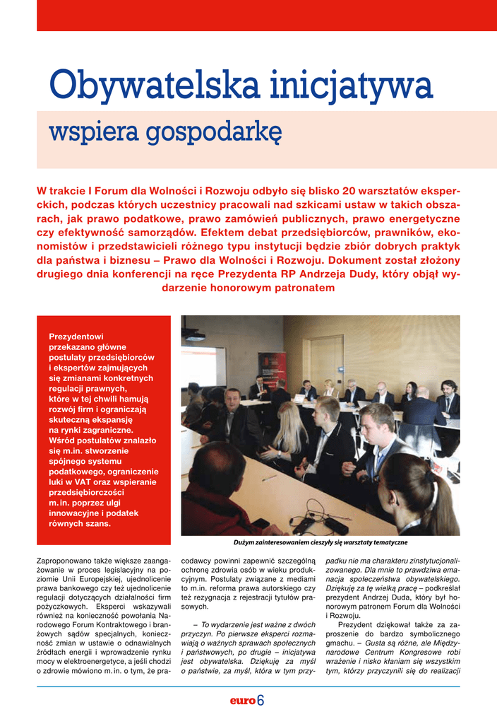 Obywatelska inicjatywa wspiera gospodarkę W trakcie I Forum dla Wolności i Rozwoju odbyło się blisko 20 warsztatów eksperckich, podczas których uczestnicy pracowali nad szkicami ustaw w takich obszarach, jak prawo podatkowe, prawo zamówień publicznych, prawo energetyczne czy efektywność samorządów. Efektem debat przedsiębiorców, prawników, ekonomistów i przedstawicieli różnego typu instytucji będzie zbiór dobrych praktyk dla państwa i biznesu – Prawo dla Wolności i Rozwoju. Dokument został złożony drugiego dnia konferencji na ręce Prezydenta RP Andrzeja Dudy, który objął wydarzenie honorowym patronatem Prezydentowi przekazano główne postulaty przedsiębiorców i ekspertów zajmujących się zmianami konkretnych regulacji prawnych, które w tej chwili hamują rozwój firm i ograniczają skuteczną ekspansję na rynki zagraniczne. Wśród postulatów znalazło się m.in. stworzenie spójnego systemu podatkowego, ograniczenie luki w VAT oraz wspieranie przedsiębiorczości m. in. poprzez ulgi innowacyjne i podatek równych szans. Dużym zainteresowaniem cieszyły się warsztaty tematyczne Zaproponowano także większe zaangażowanie w proces legislacyjny na poziomie Unii Europejskiej, ujednolicenie prawa bankowego czy też ujednolicenie regulacji dotyczących działalności firm pożyczkowych. Eksperci wskazywali również na konieczność powołania Narodowego Forum Kontraktowego i branżowych sądów specjalnych, konieczność zmian w ustawie o odnawialnych źródłach energii i wprowadzenie rynku mocy w elektroenergetyce, a jeśli chodzi o zdrowie mówiono m. in. o tym, że pra- codawcy powinni zapewnić szczególną ochronę zdrowia osób w wieku produkcyjnym. Postulaty związane z mediami to m.in. reforma prawa autorskiego czy też rezygnacja z rejestracji tytułów prasowych. – To wydarzenie jest ważne z dwóch przyczyn. Po pierwsze eksperci rozmawiają o ważnych sprawach społecznych i państwowych, po drugie – inicjatywa jest obywatelska. Dziękuję za myśl o państwie, za myśl, która w tym przy- 6 padku nie ma charakteru zinstytucjonalizowanego. Dla mnie to prawdziwa emanacja społeczeństwa obywatelskiego. Dziękuję za tę wielką pracę – podkreślał prezydent Andrzej Duda, który był honorowym patronem Forum dla Wolności i Rozwoju. Prezydent dziękował także za zaproszenie do bardzo symbolicznego gmachu. – Gusta są różne, ale Międzynarodowe Centrum Kongresowe robi wrażenie i nisko kłaniam się wszystkim tym, którzy przyczynili się do realizacji tego – w mojej opinii – pięknego obiektu w samym centrum Katowic. Tak ważnym miejscu dla Polski. To serce polskiego przemysłu tutaj na Śląsku – mówił prezydent RP. Podkreślał też, że ma głębokie przekonanie o konieczności naprawy Polski w bardzo wielu obszarach. Zdaniem Pana Prezydenta naprawy wymaga również Unia Europejska. Prezydent RP odniósł się także do postulatów ekspertów i przedsiębiorców. Zapewnił, że wszystkie zostaną szczegółowo przeanalizowane, ale nie może obiecać, że wszystkie zostaną wdrożone w życie. Prezydent Andrzej Duda podkreślił, że praktyka polegająca na tym, że nie uwzględnia się postulatów obywateli, a w zasadzie praktycznie się ich nie rozpatruje, nie prowadzi do niczego dobrego, a na pewno nie prowadzi do budowy społeczeństwa obywatelskiego i nie buduje poczucia odpowiedzialności za sprawy państwowe. – Coraz więcej przedsiębiorców zgłasza potrzebę natychmiastowych reform w polskim prawie, zwłaszcza w kontekście tworzenia prostych i jednolitych przepisów. To ważne, bo jak pokazują badania chwiejność polskiego prawa nadal przybiera na sile. Z roku na rok rośnie liczba nowych przepisów, a statystyczny przedsiębiorca, jeśli chciałby być na bieżąco z wszystkimi aktami prawnymi musiałby poświęcać na ich czytanie prawie 4 godziny każdego dnia roboczego – wyjaśniała prof. nadzw. dr hab. Barbara Piontek, sekretarz generalna Forum dla Wolności i Rozwoju. – Kraje Europy Środkowo-Wschodniej mają ze sobą wiele wspólnego i często borykają się z tymi samymi wyzwaniami gospodarczymi i społecznymi. Mimo to bardzo rzadko się spotykamy – komentował prof. Zbigniew Rau z Wydziału Prawa i Administracji Uniwersytetu Łódzkiego, jeden z inicjatorów wydarzenia. To pierwsze forum prawno-ekonomiczne dla całego regionu, które będzie okazją do przyjrzenia się panującym w naszych krajach przepisom oraz do wymiany dobrych praktyk i najlepszych rozwiązań. Inicjatywa Forum dla Wolności i Rozwoju, powstała przede wszystkim z myślą o wspieraniu lokalnych gospodarek i tworzeniu coraz lepszych warunków do rozwoju przedsiębiorczości. Motorem rozwoju gospodarczego w Europie jest lokalny biznes. Dla przykładu w Polsce małe i średnie przedsiębiorstwa odpowiadają za niemal 50% PKB, duże polskie firmy są z kolei siłą napędową wielu regionów. – Warto poszukać rozwiązań legislacyjnych, które w sposób szczególny będą wspierały krajowe biznesy – mówił dr Andrzej Arendarski Prezes Krajowej Izby Gospodarczej. Według najnowszej edycji raportu OECD Going Growth, Polska, aby się dalej rozwijać, musi w szczególny sposób zadbać m. in. o zmniejszenie biurokracji i barier dla przedsiębiorców. Powinna też ułatwić zatrudnienie kobiet i osób starszych, dokonać rewizji systemu podatkowego oraz wspierać rozwój systemów transportowych, te- lekomunikacyjnych i energetycznych. Pracodawcy RP jako główne wyzwanie wskazują spadek ludności kraju i starzenie się społeczeństwa. Z kolei według szacunków BZ WBK to eksport będzie kołem zamachowym polskiej gospodarki i to jego wzmocnienie powinno być jednym z priorytetów ekonomicznych kraju. – Jest wiele obszarów, które mają wpływ na to, czy za kilka, kilkanaście i kilkadziesiąt lat będziemy żyć w kraju dobrobytu i stabilności gospodarczej czy w kurczącej się ekonomii i zależności od zewnę