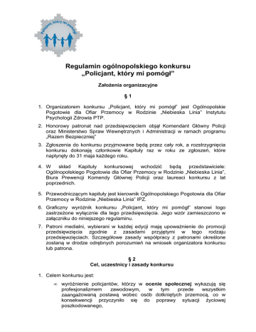 Regulamin ogólnopolskiego konkursu „Policjant, który mi pomógł” Założenia organizacyjne §1 1. Organizatorem konkursu „Policjant, który mi pomógł” jest Ogólnopolskie Pogotowie dla Ofiar Przemocy w Rodzinie „Niebieska Linia” Instytutu Psychologii Zdrowia PTP. 2. Honorowy patronat nad przedsięwzięciem objął Komendant Główny Policji oraz Ministerstwo Spraw Wewnętrznych i Administracji w ramach programu „Razem Bezpieczniej” 3. Zgłoszenia do konkursu przyjmowane będą przez cały rok, a rozstrzygnięcia konkursu dokonają członkowie Kapituły raz w roku ze zgłoszeń, które napłynęły do 31 maja każdego roku. 4. W skład Kapituły konkursowej wchodzić będą przedstawiciele: Ogólnopolskiego Pogotowia dla Ofiar Przemocy w Rodzinie „Niebieska Linia”, Biura Prewencji Komendy Głównej Policji oraz laureaci konkursu z lat poprzednich. 5. Przewodniczącym kapituły jest kierownik Ogólnopolskiego Pogotowia dla Ofiar Przemocy w Rodzinie „Niebieska Linia” IPZ. 6. Graficzny wyróżnik konkursu „Policjant, który mi pomógł” stanowi logo zastrzeżone wyłącznie dla tego przedsięwzięcia. Jego wzór zamieszczono w załączniku do niniejszego regulaminu. 7. Patroni medialni, wybierani w każdej edycji mają upoważnienie do promocji przedsięwzięcia zgodnie z zasadami przyjętymi w tego rodzaju przedsięwzięciach. Szczegółowe zasady współpracy z patronami określone zostaną w drodze odrębnych porozumień na wniosek organizatora konkursu lub patrona. §2 Cel, uczestnicy i zasady konkursu 1. Celem konkursu jest: • wyróżnienie policjantów, którzy w ocenie społecznej wykazują się profesjonalizmem zawodowym, w tym przede wszystkim zaangażowaną postawą wobec osób dotkniętych przemocą, co w konsekwencji przyczyniło się do poprawy sytuacji życiowej poszkodowanego, • wsparcie policjantów krzywdzonym, • podkreślenie roli policjantów w systemie przeciwdziałania przemocy w rodzinie, • promowanie postaw i umiejętności służących ochronie ofiar przemocy w rodzinie, • zwiększenie motywacji policjantów do podejmowania działań w ww. obszarze. zaangażowanych w pomoc osobom 2. Zgłoszenia do konkursu może dokonać osoba indywidualna, instytucja lub organizacja i powinny one dotyczyć indywidualnych policjantów, a nie jednostek Policji. 3. Zgłoszeń nie mogą dokonywać policjanci, ani inni pracownicy jednostek Policji. 4. Zgłoszenia dokonywane będą na podstawie formularza zgłoszeniowego stanowiącego załącznik do regulaminu. 5. Formularze zgłoszeniowe będą dostępne na stronach: www.niebieskalinia.pl, www.policjant.niebieskalinia.pl oraz www.policja.pl. 6. Formularze zgłoszeniowe można nadsyłać przez cały rok na adres [email protected] lub pocztą na adres: „Niebieska Linia”, 02-121 Warszawa, ul. Korotyńskiego 13. Zakończenie konkursu §3 1. Członkowie Kapituły konkursu w terminie do dnia 24 czerwca każdego roku dokonają oceny zgłoszeń kandydatów według następujących kryteriów i metodologii: • szczegółowa analiza uzasadnień zawartych w formularzach zgłoszeniowych, ze szczególnym uwzględnieniem zaangażowania kandydatów w działania na rzecz wdrażania w środowiskach lokalnych systemowych rozwiązań mających na celu przeciwdziałanie przemocy w rodzinie oraz ich doświadczenie w pracy na rzecz pomocy ofiarom dotkniętym sytuacją przemocową, • liczba zgłoszeń dotyczących danego kandydata, przy czym kryterium to nie będzie stanowić decydującego elementu oceny, • członkowie Kapituły reprezentujący organizatora i Komendanta Głównego Policji głosują na dowolną liczbę zgłoszeń, przy czym docelowo do wyróżnienia wytypowanych zostaje 10 laureatów. • spośród finałowej 10 członkowie Kapituły w pełnym składzie wyłonią 5 laureatów przyznając poszczególnym kandydaturom pule po 5 punktów (podział punktów jest dowolny). Wyróżnienia mają charakter równorzędny, nie podlegają kategoryzacji. 2. Przewodniczący Kapituły w terminie do dnia 30 czerwca każdego roku sporządzi protokół z przebiegu konkursu, a także dokona ogłoszenia wyników na stronach internetowych Organizatora oraz www.policja.pl oraz za pośrednictwem mediów. 2 3. Przewodniczący Kapituły konkursu przekaże środkom masowego przekazu wszelkie informacje na temat rozstrzygnięcia konkursu zgodnie z zasadami określonymi w porozumieniu z patronami medialnymi. Nagrody §4 1. Nagrodami w konkursie będą nagrody rzeczowe w postaci statuetek oraz nagrody finansowe. 2. Fundatorem statuetek jest Instytut Psychologii Zdrowia PTP, a nagród finansowych Komendant Główny Policji. 3. Wręczenie nagród będzie miało uroczystą oprawę i odbywać się będzie zgodnie ze scenariuszem wpisującym się w harmonogram obchodów święta Policji. Oświadczenia o prawach autorskich §5 1. Organizator zastrzega sobie prawo do bezpłatnego wykorzystywania informacji o kandydatach, opisywanych sytuacjach zawartych w formularzach zgłoszeniowych na rzecz prezentacji przebiegu konkursu w mediach, na zasadach określonych w porozumieniu zawartym z patronami medialnymi. Postanowienia końcowe §6 1. Administratorem danych osobowych przetwarzanych w związku z konkursem jest organizator, Ogólnopolskie Pogotowie dla Ofiar Przemocy w Rodzinie „Niebieska Linia” PTP. Dane osobowe uczestników konkursu będą zbierane i przetwarzane zgodnie z Ustawą z dnia 29.08.1997 roku o Ochronie Danych Osobowych; tekst jednolity: Dz. U. z 2002r. Nr 101, poz. 926 ze zm.. 2. Regulamin jest jedynym dokumentem określającym zasady konkursu. Organizator jest uprawniony do zmiany regulaminu Konkursu o ile nie wpłynie to na pogorszenie zasad uczestnictwa w Konkursie. Data ostatniej aktualizacji niniejszego Regulaminu to: 30 marca 2015 roku. 3. Wszelkie decyzje Kapituły będą wiążące i ostateczne, od werdyktu nie przysługuje odwołanie. ……………………. Organizator …………………………… P