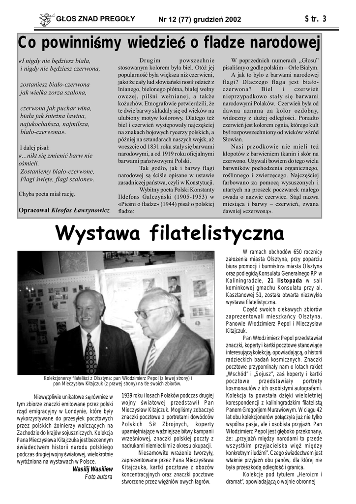GŁOS ZNAD PREGOŁY Nr 12 (77) grudzień 2002 Str. 3 Co powinniśmy wiedzieć o fladze narodowej «I nigdy nie będziesz biała, i nigdy nie będziesz czerwona, zostaniesz biało-czerwona jak wielka zorza szalona, czerwona jak puchar wina, biała jak śnieżna lawina, najukochańsza, najmilsza, biało-czerwona». I dalej pisał: «...nikt się zmienić barw nie ośmieli. Zostaniemy biało-czerwone, Flagi święte, flagi szalone». Chyba poeta miał rację. Opracował Kleofas Ławrynowicz Drugim powszechnie stosowanym kolorem była biel. Otóż jej popularność była większa niż czerwieni, jako że cały lud słowiański nosił odzież z lnianego, bielonego płótna, białej wełny owczej, pilśni wełnianej, a także kożuchów. Etnografowie potwierdzili, że te dwie barwy składały się od wieków na ulubiony motyw kolorowy. Dlatego też biel i czerwień występowały najczęściej na znakach bojowych rycerzy polskich, a później na sztandarach naszych wojsk, aż wreszcie od 1831 roku stały się barwami narodowymi, a od 1919 roku oficjalnymi barwami państwowymi Polski. Tak godło, jak i barwy flagi narodowej są ściśle opisane w ustawie zasadniczej państwa, czyli w Konstytucji. Wybitny poeta Polski Konstanty Ildefons Galczyński (1905-1953) w «Pieśni o fladze» (1944) pisał o polskiej fladze: W poprzednich numerach „Głosu” pisaliśmy o godle polskim – Orle Białym. A jak to było z barwami narodowej flagi? Dlaczego flaga jest białoczerwona? Biel i czerwień nieprzypadkowo stały się barwami narodowymi Polaków. Czerwień była od dawna uznana za kolor ozdobny, widoczny z dużej odległości. Ponadto czerwień jest kolorem ognia, którego kult był rozpowszechniony od wieków wśród Słowian. Nasi przodkowie nie mieli też kłopotów z barwieniem tkanin i skór na czerwono. Używali bowiem do tego wielu barwników pochodzenia organicznego, roślinnego i zwierzęcego. Najczęściej farbowano za pomocą wysuszonych i utartych na proszek poczwarek małego owada o nazwie czerwiec. Stąd nazwa miesiąca i barwy – czerwień, zwana dawniej «czerwoną». Wystawa filatelistyczna Kolekcjonerzy filateliści z Olsztyna: pan Włodzimierz Pepol (z lewej strony) i pan Mieczysław Kitajczuk (z prawej strony) na tle swoich zbiorów. Niewątpliwie unikatowe są również w tym zbiorze znaczki emitowane przez polski rząd emigracyjny w Londynie, które były wykorzystywane do przesyłek pocztowych przez polskich żołnierzy walczących na Zachodzie do krajów sojuszniczych. Kolekcja Pana Mieczysława Kitajczuka jest bezcennym świadectwem historii narodu polskiego podczas drugiej wojny światowej, wielokrotnie wyróżniona na wystawach w Polsce. Wasilij Wasiliew Foto autora 1939 roku i losach Polaków podczas drugiej wojny światowej przedstawił Pan Mieczysław Kitajczuk. Mogliśmy zobaczyć znaczki pocztowe z portretami dowódców Polskich Sił Zbrojnych, koperty upamiętniające ważniejsze bitwy kampanii wrześniowej, znaczki polskiej poczty z nadrukami niemieckimi z okresu okupacji. Niesamowite wrażenie tworzyły, zaprezentowane przez Pana Mieczysława Kitajczuka, kartki pocztowe z obozów koncentracyjnych oraz znaczki pocztowe stworzone przez więźniów owych łagrów. W ramach obchodów 650 rocznicy założenia miasta Olsztyna, przy poparciu biura promocji i burmistrza miasta Olsztyna oraz pod egidą Konsulatu Generalnego RP w Kaliningradzie, 21 listopada w sali kominkowej gmachu Konsulatu przy al. Kasztanowej 51, została otwarta niezwykła wystawa filatelistyczna. Część swoich ciekawych zbiorów zaprezentowali mieszkańcy Olsztyna. Panowie Włodzimierz Pepol i Mieczysław Kitajczuk. Pan Włodzimierz Pepol przedstawiał znaczki, koperty i kartki pocztowe stanowiące interesującą kolekcję, opowiadającą, o historii radzieckich badań kosmicznych. Znaczki pocztowe przypominały nam o lotach rakiet „Wschód” i „Sojusz”, zaś koperty i kartki pocztowe przedstawiały portrety kosmonautów z ich osobistymi autografami. Kolekcja ta powstała dzięki wieloletniej korespondencji z kaliningradzkim filatelistą Panem Gregorijem Murawiowym. W ciągu 42 lat obu kolekcjonerów połączyła już nie tylko wspólna pasja, ale i osobista przyjaźń. Pan Włodzimierz Pepol jest głęboko przekonany, że: „przyjaźń między narodami to przede wszystkim przyjacielska więź między konkretnymi ludźmi”. Czego świadectwem jest właśnie przyjaźń obu panów, dla której nie była przeszkodą odległość i granica. Kolekcje pod tytułem „Heroizm i dramat”, opowiadającą o wojnie obronnej