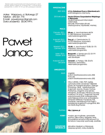 Wyrażam zgodę na przetwarzanie moich danych osobowych w celach rekrutacji, zgodnie z Ustawą z dn. 29 sierpnia 1997 r. o ochronie danych osobowych (Dz. U. z 2002 r. Nr 101, poz. 926 z późniejszymi zmianami). Adres: Warszawa, ul. Batorego 27 Telefon: 693 551 774 E-Mail: [email protected] Data urodzenia: 30.04.1991r. WYKSZTAŁCENIE 2007-2010 LO im. Bolesława Prusa w Skierniewicach, profil biologiczno-chemiczny, 2012-aktualnie Szkoła Główna Gospodarstwa Wiejskiego w Warszawie, Wydział Zastosowań Informatyki i Matematyki, kierunek: Informatyka (III rok) (niestacjonarne, inżynierskie, 4-letnie), PRACA Paweł Janac Czerwiec 2011 Marzec 2012 Mican, ul. Jana Kazimierza 46/54 01-248 Warszawa, stanowisko: webmaster/programista Kwiecień 2012 – Sierpień 2013 They.pl, ul. Czerniowiecka 12, 02-705 Warszawa, stanowisko: webmaster/programista Wrzesień 2013 – Czerwiec 2014 YSLAB, ul. Jana Pawła II 70/38, 00-175 Warszawa, stanowisko: webmaster/programista Lipiec 2014 – Marzec 2015 Kwiecień 2015 – aktualnie Blaupunkt, ul. Spedycyjna 22, 03-191 Warszawa, stanowisko: web developer Generali, ul. Postępu 15B, 02-676 Warszawa, stanowisko: Webmaster/programista UMIEJĘTNOŚCI Języki IT Portfolio HOBBY DODATKOWE INFORMACJE angielski, poziom średniozaawansowany (B2) francuski, poziom średniozaawansowany (B2) HTML 5 (RWD), CSS3, PHP, MySQL, wykorzystywanie JavaScript i bibliotek jQuery do tworzenia skryptów. Obsługa Photoshop, GIMP, Adobe Illustrator. Znajomość Joomla, Drupal, Contao, Prestashop, Magento oraz szeroko Wordpress. Środowisko Windows lub Mac. Podstawy C# oraz C. Znajomość technik pozycjonowania (linki, katalogowanie, optymalizacja stron) oraz prowadzenia kampanii AdWords i Facebook Ads. Tworzenie i administracja Fan Page’y. Zarządzanie projektami w programie JIRA lub Mantis Bug Tracker. http://pjanac.pl muzyka, gra na gitarze, uprawianie sportów: piłka nożna, bieganie i tenis, prowadzenie serwisów internetowych (o tematyce muzycznej i sportowej), podróże, aktualnie mieszkam w Warszawie (dyspozycyjność), status studenta.