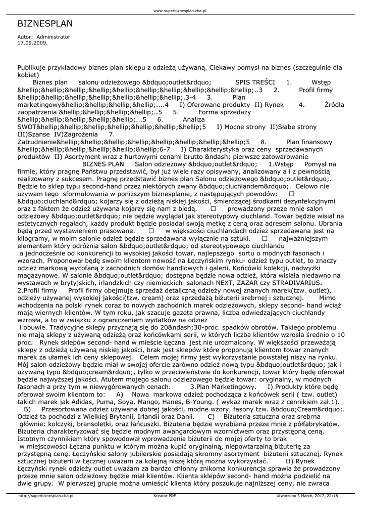 www.superbiznesplan.cba.pl BIZNESPLAN Autor: Administrator 17.09.2009. Publikuje przykładowy biznes plan sklepu z odzieżą używaną. Ciekawy pomysł na biznes (szczegulnie dla kobiet) Biznes plan salonu odzieżowego „outlet” SPIS TREŚCI 1. Wstęp …………………………..3 2. Profil firmy ………………….3-4 3. Plan marketingowy…………....4 I) Oferowane produkty II) Rynek 4. Źródła zaopatrzenia …………..5 5. Forma sprzedaży ……………...5 6. Analiza SWOT…………………5 I) Mocne strony II)Słabe strony III)Szanse IV)Zagrożenia 7. Zatrudnienie……………………5 8. Plan finansowy ………………6-7 I) Charakterystyka oraz ceny sprzedawanych produktów II) Asortyment wraz z hurtowymi cenami brutto – pierwsze zatowarowanie BIZNES PLAN Salon odzieżowy „outlet” 1.Wstęp Pomysł na firmie, który pragnę Państwu przedstawić, był już wiele razy opisywany, analizowany a i z pewnością realizowany z sukcesem. Pragnę przedstawić biznes plan Salonu odzieżowego „outlet”. Będzie to sklep typu second-hand przez niektórych zwany „ciuchlandem”. Celowo nie używam tego sformułowania w poniższym biznesplanie, z następujących powodów: Ø „ciuchland” kojarzy się z odzieżą niskiej jakości, śmierdzącej środkami dezynfekcyjnymi oraz z faktem że odzież używana kojarzy się nam z biedą. Ø prowadzony przeze mnie salon odzieżowy „outlet” nie będzie wyglądał jak stereotypowy ciuchland. Towar będzie wisiał na estetycznych regałach, każdy produkt będzie posiadał swoją metkę z ceną oraz adresem salonu. Ubrania będą przed wystawieniem prasowane. Ø w większości ciuchlandach odzież sprzedawana jest na kilogramy, w moim salonie odzież będzie sprzedawana wyłącznie na sztuki. Ø najważniejszym elementem który odróżnia salon „outlet” od stereotypowego ciuchlandu a jednocześnie od konkurencji to wysokiej jakości towar, najlepszego sortu o modnych fasonach i wzorach. Proponował będę swoim klientom nowość na Łęczyńskim rynku- odzież typu outlet, to znaczy odzież markową wycofaną z zachodnich domów handlowych i galerii. Końcówki kolekcji, nadwyżki magazynowe. W salonie „outlet” dostępna będzie nowa odzież, która wisiała niedawno na wystawach w brytyjskich, irlandzkich czy niemieckich salonach NEXT, ZAZAR czy STRADIVARIUS. 2.Profil firmy Profil firmy obejmuje sprzedaż detaliczną odzieży nowej znanych marek(tzw. outlet), odzieży używanej wysokiej jakości(tzw. cream) oraz sprzedażą biżuterii srebrnej i sztucznej. Mimo wchodzenia na polski rynek coraz to nowych zachodnich marek odzieżowych, sklepy second- hand wciąż mają wiernych klientów. W tym roku, jak szacuje gazeta prawna, liczba odwiedzających ciuchlandy wzrosła, a to w związku z ograniczeniem wydatków na odzież i obuwie. Tradycyjne sklepy przyznają się do 20–30-proc. spadków obrotów. Takiego problemu nie mają sklepy z używaną odzieżą oraz końcówkami serii, w których liczba klientów wzrosła średnio o 10 proc. Rynek sklepów second- hand w mieście Łęczna jest nie urozmaicony. W większości przeważają sklepy z odzieżą używaną niskiej jakości, brak jest sklepów które proponują klientom towar znanych marek za ułamek ich ceny sklepowej. Celem mojej firmy jest wykorzystanie powstałej niszy na rynku. Mój salon odzieżowy będzie miał w swojej ofercie zarówno odzież nową typu „outlet” jak i używaną typu „cream”, tylko w przeciwieństwie do konkurencji, towar który będę oferował będzie najwyższej jakości. Atutem mojego salonu odzieżowego będzie towar: oryginalny, w modnych fasonach a przy tym w niewygórowanych cenach. 3.Plan Marketingowy. I) Produkty które będę oferował swoim klientom to: A) Nowa markowa odzież pochodząca z końcówek serii ( tzw. outlet) takich marek jak Adidas, Puma, Soya, Mango, Hanes, B-Young. ( wykaz marek wraz z cennikiem zał.1). B) Przesortowana odzież używana dobrej jakości, modne wzory, fasony tzw. „Cream”. Odzież ta pochodzi z Wielkiej Brytanii, Irlandii oraz Danii. C) Biżuteria sztuczna oraz srebrna głównie: kolczyki, bransoletki, oraz łańcuszki. Biżuteria będzie wyrabiana przeze mnie z półfabrykatów. Biżuteria charakteryzować się będzie modnym awangardowym wzornictwem oraz przystępną ceną. Istotnym czynnikiem który spowodował wprowadzenia biżuterii do mojej oferty to brak w miejscowości Łęczna punktu w którym można kupić oryginalną, niepowtarzalną biżuterię za przystępną cenę. Łęczyńskie salony jubilerskie posiadają skromny asortyment biżuterii sztucznej. Rynek sztucznej biżuterii w Łęcznej uważam za kolejną niszę którą można wykorzystać. II) Rynek Łęczyński rynek odzieży outlet uważam za bardzo chłonny znikoma konkurencja sprawia że prowadzony przeze mnie salon odzieżowy będzie miał klientów. Klienta sklepów second- hand można podzielić na dwie grupy. W pierwszej grupie można umieścić klienta który poszukuje najniższej ceny, nie zwraca http://superbiznesplan.cba.pl Kreator PDF Utworzono 3 March, 2017, 22:18 www.superbiznesplan.cba.pl większej uwagi na jakość produktu, fasony czy marki. Druga grupa klientów, do których kieruje swoją ofertę, to głównie osoby młode, znające się na modzie poszukujące ubrań dobrej jakości, znanych marek, charakteryzujące się modnymi fasonami. Klient ten za ułamek ceny sklepowej dostaje produkt o tej samej jakości co w galerii handlowej. Uzupełnieniem oferty mojej firmy będzie biżuteria srebrna oraz sztuczna. Biżuteria produkowana przeze mnie będzie bardzo oryginalna, ręcznie robiona z najlepszych materiałów, a przy tym w przystępnych cenach. 4.Źródła zaopatrzenia Odzież Outlet pozyskiwać będę z firmy OUTLET POLSKA BLIK SP.J (dystrybutor P.H.U.”OGA”) cennik zał. 1, a w odzież Cream zaopatrywać się będę w hurtowni odzieży używanej Hurt-mix. Obie te firmy są liderami