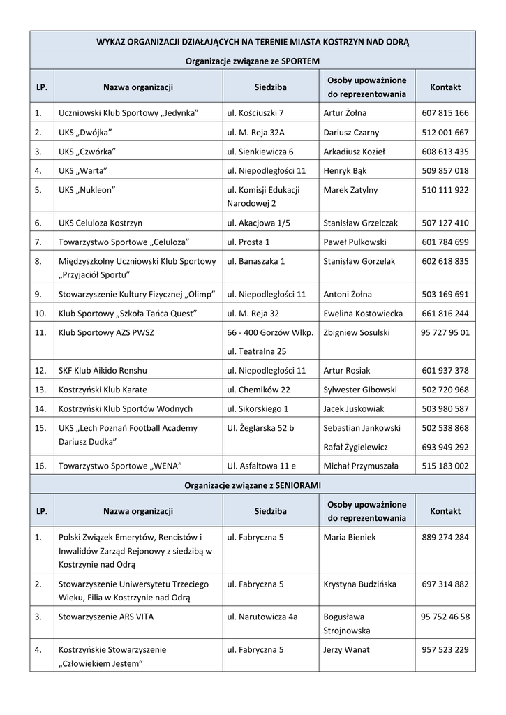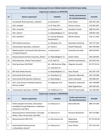WYKAZ ORGANIZACJI DZIAŁAJĄCYCH NA TERENIE MIASTA KOSTRZYN NAD ODRĄ Organizacje związane ze SPORTEM LP. Nazwa organizacji Siedziba Osoby upoważnione do reprezentowania Kontakt 1. Uczniowski Klub Sportowy „Jedynka” ul. Kościuszki 7 Artur Żołna 607 815 166 2. UKS „Dwójka” ul. M. Reja 32A Dariusz Czarny 512 001 667 3. UKS „Czwórka” ul. Sienkiewicza 6 Arkadiusz Kozieł 608 613 435 4. UKS „Warta” ul. Niepodległości 11 Henryk Bąk 509 857 018 5. UKS „Nukleon” ul. Komisji Edukacji Narodowej 2 Marek Zatylny 510 111 922 6. UKS Celuloza Kostrzyn ul. Akacjowa 1/5 Stanisław Grzelczak 507 127 410 7. Towarzystwo Sportowe „Celuloza” ul. Prosta 1 Paweł Pulkowski 601 784 699 8. Międzyszkolny Uczniowski Klub Sportowy „Przyjaciół Sportu” ul. Banaszaka 1 Stanisław Gorzelak 602 618 835 9. Stowarzyszenie Kultury Fizycznej „Olimp” ul. Niepodległości 11 Antoni Żołna 503 169 691 10. Klub Sportowy „Szkoła Tańca Quest” ul. M. Reja 32 Ewelina Kostowiecka 661 816 244 11. Klub Sportowy AZS PWSZ 66 - 400 Gorzów Wlkp. Zbigniew Sosulski 95 727 95 01 ul. Teatralna 25 12. SKF Klub Aikido Renshu ul. Niepodległości 11 Artur Rosiak 601 937 378 13. Kostrzyński Klub Karate ul. Chemików 22 Sylwester Gibowski 502 720 968 14. Kostrzyński Klub Sportów Wodnych ul. Sikorskiego 1 Jacek Juskowiak 503 980 587 15. UKS „Lech Poznań Football Academy Dariusz Dudka” Ul. Żeglarska 52 b Sebastian Jankowski 502 538 868 Rafał Żygielewicz 693 949 292 Towarzystwo Sportowe „WENA” Ul. Asfaltowa 11 e Michał Przymuszała 515 183 002 16. Organizacje związane z SENIORAMI LP. Nazwa organizacji Siedziba Osoby upoważnione do reprezentowania Kontakt 1. Polski Związek Emerytów, Rencistów i Inwalidów Zarząd Rejonowy z siedzibą w Kostrzynie nad Odrą ul. Fabryczna 5 Maria Bieniek 889 274 284 2. Stowarzyszenie Uniwersytetu Trzeciego Wieku, Filia w Kostrzynie nad Odrą ul. Fabryczna 5 Krystyna Budzińska 697 314 882 3. Stowarzyszenie ARS VITA ul. Narutowicza 4a Bogusława Strojnowska 95 752 46 58 4. Kostrzyńskie Stowarzyszenie „Człowiekiem Jestem” ul. Fabryczna 5 Jerzy Wanat 957 523 229 5. Polski Związek Niewidomych – Koło ul. Fabryczna 5 Eryk Oliniak 665 080 953 ul. Kościuszki 3 Marian Pezowicz 509 054 005 w Kostrzynie nad Odrą 6. Związek Sybiraków INNE organizacje działające na terenie Miasta Kostrzyn nad Odrą LP. Nazwa organizacji Siedziba Osoby upoważnione do reprezentowania Kontakt 1. Parafia Rzymsko – Katolicka p.w. NMP Matki Kościoła ul. Wyszyńskiego 2 Ks. dr Wojciech Skóra 95 752 36 45 2. Stowarzyszenie Hospicjum św. Kamila 66 - 400 Gorzów Wlkp. Tadeusz Iżykowski 95 728 22 25 ul. Stilonowa 21 3. Fundacja Hospicjum Domowe Św. Agaty ul. Lipowa 4 Anna Szymaniuk 782 690 581 4. Fundacja COGITAVI ul. Gen. T. Kutrzeby 2B/18 Maciej Frąckowiak 509 477 586 5. Fundacja ALTERNATYWA ul. Fabryczna 5 Julita Szkudlarek 609 340 517 6. Klub Abstynenta „Libra” ul. Kościuszki 3 Marianna Kloster 605 582 328 7. Towarzystwo Miłośników Lwowa i Kresów ul. Gorzowska 8 Południowo - Wschodnich Józef Żarski 508 155 533 8. Chorągiew Ziemi Lubuskiej Związku Harcerstwa Polskiego Hufiec ZHP Kostrzyn nad Odrą ul. Sienkiewicza 6 Alicja Wołkowska 504 951 734 9. Stowarzyszenie Towarzystwo Przyjaciół Zespołu „Roll Dance” ul. Sikorskiego 34 Karolina Bilińska 600 959 120 10. Stowarzyszenie na rzecz utworzenia i rozwoju Wyższej Szkoły Zawodowej w Kostrzynie nad Odrą ul. Mickiewicza 20 Henryk Piekarski 95 752 90 36 11. Klub Żeglarski „Delfin” ul. Sikorskiego 1 12. Wojewódzki Związek Pszczelarzy w Gorzowie Wlkp. 66-400 Gorzów Wlkp. Koło Kostrzyn nad Odrą 13. 14. 792 450 931 Marian Grzywacz 880439941 Krzysztof Czerwiński 68 324 55 95 Mariusz Krawczyk 600 978 033 ul. Bora Komorowskiego 33c Polskie Towarzystwo Krajoznawcze, Zielona Góra 65-783 Zielona Góra Stowarzyszenie Pomocy Osobom Uzależnionym „Przełom” 66 – 400 Gorzów Wlkp. ul. Prosta 53 ul. Mieszka I 57/3 15. Polski Związek Wędkarski Okręg w Gorzowie Wlkp. 66 - 400 Gorzów Wlkp. ul. Wyszyńskiego 28/30 95 722 34 02
