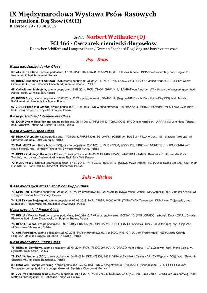 IX Międzynarodowa Wystawa Psów Rasowych International Dog Show (CACIB) Białystok, 29 - 30.08.2015 Sędzia: Norbert Wettlaufer (D) FCI 166 - Owczarek niemiecki długowłosy Deutscher Schäferhund Langstockhaar / German Shepherd Dog Long and harsh outer coat Psy - Dogs Klasa młodzieży / Junior Class 63. ALVES Top Silver, czarne podpalane, 17-09-2014, PKR.I-76741, 9958/VI/14, (LEON Nova Jamina - PINA vom Urstromtal), hod. Bogumiła Krupa, wł. Robert Żochowski, Polska 64. BREK I.Banacha z Hipolitowa (FCI), czarne podpalane, 31-03-2014, PKR.I-75125, 9803/VI/14, (DRAGO Marino Haus (FCI) - LUSSY Wilczy Szaniec (FCI)), hod. Ireneusz Banach, wł. Ireneusz Banach, Polska 65. CASAR vom Mahlstein, czarne podpalane, 15-03-2014, PKR.I-76920, 9975/VI/14, (SAABAT von Aurelius - WANJA von der Wasserkuppe), hod. Harald Stock, wł. Alicja Żak, Polska 66. ROBIN Euro, czarne podpalane, 10-03-2014, PKR w przygotowaniu, 9844/VI/14, (Al-grom KIMON - ALBA z Ujścia Pisy FCI), hod. Marek Rafałowski, wł. Wojciech Stachurski, Polska 67. ZIDAN Primo mio Grande, czarne podpalane, 01-09-2014, PKR w przygotowaniu, 13003/XXIV/14, (EBISZR Feetback - VES-TYRA Gven Blaid), hod. Beata Kalisz, wł. Krzysztof Krasuski, Polska Klasa pośrednia / Intermediate Class 68. KOSMO vom Haus Tchorz, czarne podpalane, 25-11-2013, PKR.I-74783, 7297/XXX/13, (FIGO vom Nordteich - WARRINKA vom Haus Tchorz), hod. Mirosław Tchorz, wł. Dominika Bruch, Polska Klasa otwarta / Open Class 69. DRACO Wypusty, czarne podpalane, 17-05-2013, PKR.I-73569, 9610/VI/13, (OBER von Bad Boll - FILLA Artrox), hod. Sławomir Skorupa, wł. Sławomir Skorupa, Rafał Skorupa, Polska 70. KALIMERO vom Haus Tchorz (FCI), czarne podpalane, 25-11-2013, PKR.I-74980, 9725/VI/13, (FIGO vom NORDTEICH - WARRINKA vom Haus Tchorz), hod. Mirosław Tchorz, wł. Sylwester Kaśkiewicz, Polska 71. KING z Zielonego Ursynowa Poland, czarne podpalane, 07-05-2013, PKR.I-75295, 90786/I/13, (XAMBO Kalupus - RICKE von der Piste Trophe), hod. Janusz Chojnacki, wł. Nasser Naji, Sara Naji, Polska 72. MERO vom Cinderhof, czarne podpalane, 07-02-2013, PKR.I-75363, 90832/I/13, (ORION Mavic Poland - HERA vom Tejada Schloss), hod. Piotr Okniński, wł. Piotr Okniński, Krzysztof Dobrzański, Polska Suki – Bitches Klasa młodszych szczeniąt / Minor Puppy Class 73. KIRA Ramik, czarne podpalane, 27-03-2015, PKR w przygotowaniu, 22376/XII/15, (NICO Mario Grande - KIKA Ardelia), hod. Andrzej Kęsicki, wł. Grzegorz, Łukasz Kleszczyńscy, Polska 74. LUSSY vom Trojangold, czarne podpalane, 09-03-2015, PKR.I-77865, 10080/VI/15, (YONATHAN Temperton - DUMA vom Trojangold), hod. Magdalena Trojanowska, wł. Sebastian Drewnowski, Polska Klasa szczeniąt / Puppy Class 75. BELLA z Drozda Piasków, czarne podpalane, 20-02-2015, PKR w przygotowaniu, 10079/VI/15, (COLLORADO Jarkowski Dwór - XIRA z Drozda Piasków), hod. Marek Drozdowski, wł. Bogdan Strojny, Polska 76. DESSA Danaos, czarne podpalane, 08-01-2015, PKR.I-77999, 10100/VI/15, (COLLORADO Jarkowski Dwór - PARA Mihapa), hod. Alicja Żak, wł.Stanisław Ciborowski, Polska 77. SUSI Vordamm, czarne podpalane, 25-02-2015, PKR w przygotowaniu, 7263/XXVII/15, (GRISU vom Frankengold - NERA Mario Grange FCI), hod. Mariusz Huszcza, wł. Alicja Krusinska, Polska Klasa młodzieży / Junior Class 78. BERA ze Słomkowa, czarne podpalane, 28-04-2014, PKR.I-76870, 9973/VI/14, (DRAGO Marino Haus - IVA z Żędowic), hod. Maria Galus, wł. Sylwester Kaśkiewicz, Polska 79. FARNA Wypusty (FCI), czarne podpalane, 24-08-2014, PKR.I-77161, 10011/VI/14, (LEX Marko Carras - CANDY Wypusty (FCI)), hod. Sławomir Skorupa, wł. Agnieszka Baczewska, Polska 80. GINA vom Trompetersprung, czarne podpalane, 24-05-2014, PKR w przygotowaniu, 10146/VI/14, (Conbhairean UNO - ODUSCHA vom Trompetersprung), hod. Hans Ludger Goke, wł. Stanisław Ciborowski, Polska 81. JOSI von Holtkamper See, czarne podpalane, 01-11-2014, PKR.I-77523, 13089/XXIV/14, (XEN von Haus Cerba - BABSI von Julianenweg), hod. Matthias Niedergassel, wł. Sebastian Korżyński, Polska 82. KORA Aj-Pe Bohemia, czarne podpalane, 25-04-2014, PKR.I-76919, 9971/VI/14, (YAMBO v.Zellwaldrand - JANNY de Intercanina), hod. Alena Śtefanidesova, wł. Sylwester Kaśkiewicz, Polska 83. LUSI Kalupus, czarne podpalane, 10-05-2014, PKR.I-76245, 91422/I/14, (DASTY von Melachthon - DEGRA Kalupus), hod. Magda Bajrak, Roman Rolnik, wł. Waldemar Łodzinski, Polska 84. OLLY DELLA Real Favorita, czarne podpalane, 29-03-2014, PKR.I-77755, 10067/VI/14, (ENOSCH v AMASIS - THESSA DELLA Real Favorita), hod. Nero Focato, wł. Alicja Żak, Polska 85. RAFI Mario Grande FCI, czarne podpalane, 17-09-2014, PKR w przygotowaniu, 3535/XLVIII/14, (ILIANO vom Fichtenschlag – NICO Mario Grande FCI), hod. Mirosław Bartosiewicz, wł. Mirosław Bartosiewicz, Polska 86. RITA Euro, czarne podpalane, 10-03-2014, PKR.I-76607, 9946/VI/14, (Al-grom KIMON - ALBA z Ujścia Pisy), hod. Marek Rafałowski, wł. Stanislaw Dziewiątkowski, Polska 87. WERONA Hodowla pod Stawami, czarne podpalane, 02-09-2014, PKR.I-76869, 9966/VI/14, (GRINCH vom Frankengold - HOLLY vom Nordteich), hod. Wojciech Stachurski, wł. Wojciech Stachurski, Mariusz Bogdan, Polska 88. ZEVI Primo mio Grande, czarne podpalane, 01-09-2014, PKR w przygotowaniu, 13002/XXIV/14, (EBISZR Feetback - VES TYRA Gven Blaid), hod. Beata Kalisz, wł. Krzysztof Krasuski, Polska Klasa pośrednia / Intermediate Class 89. ARIA z Wislanej FCI, czarne podpalane, 20-05-2014, PKR.I-75971, 13786/XIX/14, (NICO Mario Grande - BONA z Grodu Smoka), hod. Marian Radzikowski, wł. Barbara Grzegowska, Polska 90. BEKI I.Banacha z Hipolitowa, czarne podpalane, 31-03-2014, PKR.I-76868, 9972/VI/14, (DRAGO Marino Haus - LUSSY Wilczy Szaniec), hod. Ireneusz Banach, wł. Sylwester Kaśkiewicz, Polska 91. GINA Touareg, czarne podpalane, 11-10-2013, PKR.I-74556, 9704/VI/13, (FULZ di Zenevredo - BUFFY Garliavietis), hod. Piotr Bielecki, wł. Piotr Bielecki, Polska Klasa otwarta / Open Class 92. A-SHEBA Nieprzetarty Szlak, c