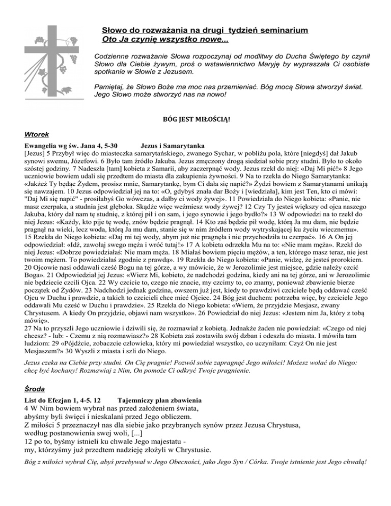 Słowo do rozważania na drugi tydzień seminarium Oto Ja czynię wszystko nowe... Codzienne rozważanie Słowa rozpoczynaj od modlitwy do Ducha Świętego by czynił Słowo dla Ciebie żywym, proś o wstawiennictwo Maryję by wypraszała Ci osobiste spotkanie w Słowie z Jezusem. Pamiętaj, że Słowo Boże ma moc nas przemieniać. Bóg mocą Słowa stworzył świat. Jego Słowo może stworzyć nas na nowo! BÓG JEST MIŁOŚCIĄ! Wtorek Ewangelia wg św. Jana 4, 5-30 Jezus i Samarytanka [Jezus] 5 Przybył więc do miasteczka samarytańskiego, zwanego Sychar, w pobliżu pola, które [niegdyś] dał Jakub synowi swemu, Józefowi. 6 Było tam źródło Jakuba. Jezus zmęczony drogą siedział sobie przy studni. Było to około szóstej godziny. 7 Nadeszła [tam] kobieta z Samarii, aby zaczerpnąć wody. Jezus rzekł do niej: «Daj Mi pić!» 8 Jego uczniowie bowiem udali się przedtem do miasta dla zakupienia żywności. 9 Na to rzekła do Niego Samarytanka: «Jakżeż Ty będąc Żydem, prosisz mnie, Samarytankę, bym Ci dała się napić?» Żydzi bowiem z Samarytanami unikają się nawzajem. 10 Jezus odpowiedział jej na to: «O, gdybyś znała dar Boży i [wiedziała], kim jest Ten, kto ci mówi: "Daj Mi się napić" - prosiłabyś Go wówczas, a dałby ci wody żywej». 11 Powiedziała do Niego kobieta: «Panie, nie masz czerpaka, a studnia jest głęboka. Skądże więc weźmiesz wody żywej? 12 Czy Ty jesteś większy od ojca naszego Jakuba, który dał nam tę studnię, z której pił i on sam, i jego synowie i jego bydło?» 13 W odpowiedzi na to rzekł do niej Jezus: «Każdy, kto pije tę wodę, znów będzie pragnął. 14 Kto zaś będzie pił wodę, którą Ja mu dam, nie będzie pragnął na wieki, lecz woda, którą Ja mu dam, stanie się w nim źródłem wody wytryskającej ku życiu wiecznemu». 15 Rzekła do Niego kobieta: «Daj mi tej wody, abym już nie pragnęła i nie przychodziła tu czerpać». 16 A On jej odpowiedział: «Idź, zawołaj swego męża i wróć tutaj!» 17 A kobieta odrzekła Mu na to: «Nie mam męża». Rzekł do niej Jezus: «Dobrze powiedziałaś: Nie mam męża. 18 Miałaś bowiem pięciu mężów, a ten, którego masz teraz, nie jest twoim mężem. To powiedziałaś zgodnie z prawdą». 19 Rzekła do Niego kobieta: «Panie, widzę, że jesteś prorokiem. 20 Ojcowie nasi oddawali cześć Bogu na tej górze, a wy mówicie, że w Jerozolimie jest miejsce, gdzie należy czcić Boga». 21 Odpowiedział jej Jezus: «Wierz Mi, kobieto, że nadchodzi godzina, kiedy ani na tej górze, ani w Jerozolimie nie będziecie czcili Ojca. 22 Wy czcicie to, czego nie znacie, my czcimy to, co znamy, ponieważ zbawienie bierze początek od Żydów. 23 Nadchodzi jednak godzina, owszem już jest, kiedy to prawdziwi czciciele będą oddawać cześć Ojcu w Duchu i prawdzie, a takich to czcicieli chce mieć Ojciec. 24 Bóg jest duchem: potrzeba więc, by czciciele Jego oddawali Mu cześć w Duchu i prawdzie». 25 Rzekła do Niego kobieta: «Wiem, że przyjdzie Mesjasz, zwany Chrystusem. A kiedy On przyjdzie, objawi nam wszystko». 26 Powiedział do niej Jezus: «Jestem nim Ja, który z tobą mówię». 27 Na to przyszli Jego uczniowie i dziwili się, że rozmawiał z kobietą. Jednakże żaden nie powiedział: «Czego od niej chcesz? - lub: - Czemu z nią rozmawiasz?» 28 Kobieta zaś zostawiła swój dzban i odeszła do miasta. I mówiła tam ludziom: 29 «Pójdźcie, zobaczcie człowieka, który mi powiedział wszystko, co uczyniłam: Czyż On nie jest Mesjaszem?» 30 Wyszli z miasta i szli do Niego. Jezus czeka na Ciebie przy studni. On Cię pragnie! Pozwól sobie zapragnąć Jego miłości! Możesz wołać do Niego: chcę być kochany! Rozmawiaj z Nim, On pomoże Ci odkryć Twoje pragnienie. Środa List do Efezjan 1, 4-5. 12 Tajemniczy plan zbawienia 4 W Nim bowiem wybrał nas przed założeniem świata, abyśmy byli święci i nieskalani przed Jego obliczem. Z miłości 5 przeznaczył nas dla siebie jako przybranych synów przez Jezusa Chrystusa, według postanowienia swej woli, [...] 12 po to, byśmy istnieli ku chwale Jego majestatu my, którzyśmy już przedtem nadzieję złożyli w Chrystusie. Bóg z miłości wybrał Cię, abyś przebywał w Jego Obecności, jako Jego Syn / Córka. Twoje istnienie jest Jego chwałą! Czwartek Ewangelia wg św. Jana 13, 18b-19.21 18 Nie mówię o was wszystkich. Ja wiem, których wybrałem; lecz [potrzeba], aby się wypełniło Pismo: Kto ze Mną spożywa chleb, ten podniósł na Mnie swoją piętę. 19 Już teraz, zanim się to stanie, mówię wam, abyście, gdy się stanie, uwierzyli, że JA JESTEM. […] 21 To powiedziawszy Jezus doznał głębokiego wzruszenia i tak oświadczył: «Zaprawdę, zaprawdę, powiadam wam: Jeden z was Mnie zdradzi». Możesz odrzucić miłość Boga. Jesteś wolny. Nawet w obliczu twojej zdrady On pozostanie z Tobą! „JA JESTEM” Piątek Ewangelia wg św. Jana 15,13 Nikt nie ma większej miłości od tej, gdy ktoś życie swoje oddaje za przyjaciół swoich. List do Rzymian 5, 6-8 Pojednanie z Bogiem 6 Chrystus bowiem umarł za nas, jako za grzeszników, w oznaczonym czasie, gdyśmy [jeszcze] byli bezsilni. 7 A [nawet] za człowieka sprawiedliwego podejmuje się ktoś umrzeć tylko z największą trudnością. Chociaż może jeszcze za człowieka życzliwego odważyłby się ktoś ponieść śmierć. 8 Bóg zaś okazuje nam swoją miłość [właśnie] przez to, że Chrystus umarł za nas, gdyśmy byli jeszcze grzesznikami. Jezus umarł za twoją bezsilność wobec grzechu. Dobrowolnie oddał za Ciebie życie. Nie ma większej miłości!! Sobota List do Rzymian 8, 15 Synostwo Boże chrześcijan 15 Nie otrzymaliście przecież ducha niewoli, by się znowu pogrążyć w bojaźni, ale otrzymaliście ducha przybrania za synów, w którym możemy wołać: «Abba, Ojcze!» Ewangelia wg św. Jana 17, 25-26 25 Ojcze sprawiedliwy! Świat Ciebie nie poznał, lecz Ja Ciebie poznałem i oni poznali, żeś