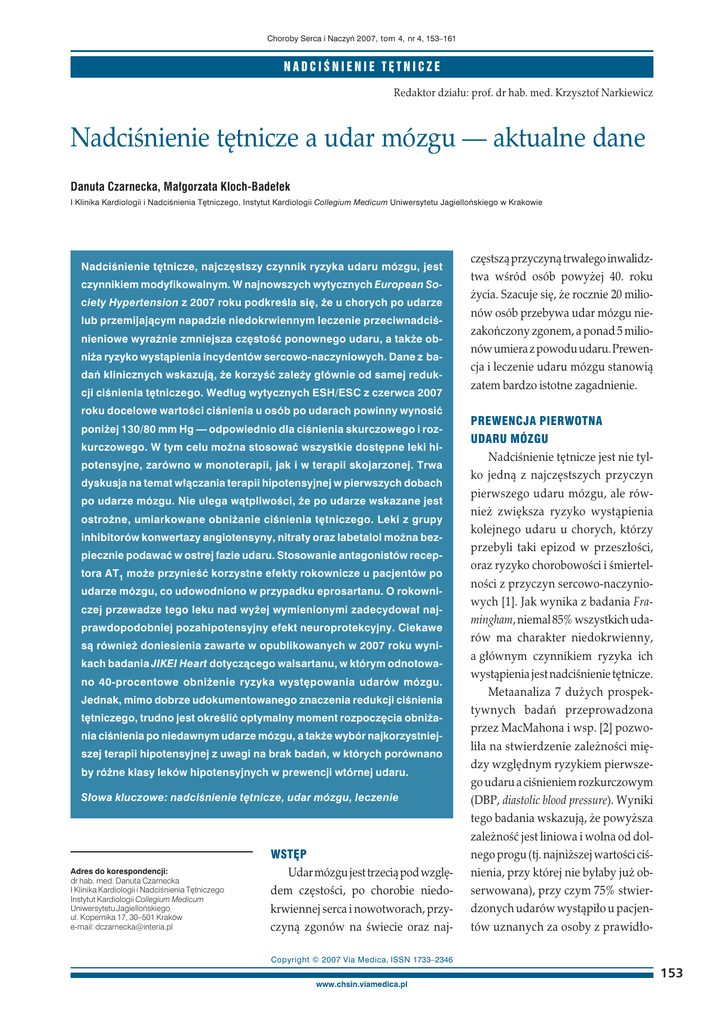 Choroby Serca i Naczyń 2007, tom 4, nr 4, 153–161 NADCIŚNIENIE TĘTNICZE Redaktor działu: prof. dr hab. med. Krzysztof Narkiewicz Nadciśnienie tętnicze a udar mózgu — aktualne dane Danuta Czarnecka, Małgorzata Kloch-Badełek I Klinika Kardiologii i Nadciśnienia Tętniczego, Instytut Kardiologii Collegium Medicum Uniwersytetu Jagiellońskiego w Krakowie Nadciśnienie tętnicze, najczęstszy czynnik ryzyka udaru mózgu, jest czynnikiem modyfikowalnym. W najnowszych wytycznych European Society Hypertension z 2007 roku podkreśla się, że u chorych po udarze lub przemijającym napadzie niedokrwiennym leczenie przeciwnadciśnieniowe wyraźnie zmniejsza częstość ponownego udaru, a także obniża ryzyko wystąpienia incydentów sercowo-naczyniowych. Dane z badań klinicznych wskazują, że korzyść zależy głównie od samej redukcji ciśnienia tętniczego. Według wytycznych ESH/ESC z czerwca 2007 roku docelowe wartości ciśnienia u osób po udarach powinny wynosić poniżej 130/80 mm Hg — odpowiednio dla ciśnienia skurczowego i rozkurczowego. W tym celu można stosować wszystkie dostępne leki hipotensyjne, zarówno w monoterapii, jak i w terapii skojarzonej. Trwa dyskusja na temat włączania terapii hipotensyjnej w pierwszych dobach po udarze mózgu. Nie ulega wątpliwości, że po udarze wskazane jest ostrożne, umiarkowane obniżanie ciśnienia tętniczego. Leki z grupy inhibitorów konwertazy angiotensyny, nitraty oraz labetalol można bezpiecznie podawać w ostrej fazie udaru. Stosowanie antagonistów receptora AT1 może przynieść korzystne efekty rokownicze u pacjentów po udarze mózgu, co udowodniono w przypadku eprosartanu. O rokowniczej przewadze tego leku nad wyżej wymienionymi zadecydował najprawdopodobniej pozahipotensyjny efekt neuroprotekcyjny. Ciekawe są również doniesienia zawarte w opublikowanych w 2007 roku wynikach badania JIKEI Heart dotyczącego walsartanu, w którym odnotowano 40-procentowe obniżenie ryzyka występowania udarów mózgu. Jednak, mimo dobrze udokumentowanego znaczenia redukcji ciśnienia tętniczego, trudno jest określić optymalny moment rozpoczęcia obniżania ciśnienia po niedawnym udarze mózgu, a także wybór najkorzystniejszej terapii hipotensyjnej z uwagi na brak badań, w których porównano by różne klasy leków hipotensyjnych w prewencji wtórnej udaru. Słowa kluczowe: nadciśnienie tętnicze, udar mózgu, leczenie WSTĘP Adres do korespondencji: dr hab. med. Danuta Czarnecka I Klinika Kardiologii i Nadciśnienia Tętniczego Instytut Kardiologii Collegium Medicum Uniwersytetu Jagiellońskiego ul. Kopernika 17, 30–501 Kraków e-mail: [email protected] Udar mózgu jest trzecią pod względem częstości, po chorobie niedokrwiennej serca i nowotworach, przyczyną zgonów na świecie oraz naj- częstszą przyczyną trwałego inwalidztwa wśród osób powyżej 40. roku życia. Szacuje się, że rocznie 20 milionów osób przebywa udar mózgu niezakończony zgonem, a ponad 5 milionów umiera z powodu udaru. Prewencja i leczenie udaru mózgu stanowią zatem bardzo istotne zagadnienie. PREWENCJA PIERWOTNA UDARU MÓZGU Nadciśnienie tętnicze jest nie tylko jedną z najczęstszych przyczyn pierwszego udaru mózgu, ale również zwiększa ryzyko wystąpienia kolejnego udaru u chorych, którzy przebyli taki epizod w przeszłości, oraz ryzyko chorobowości i śmiertelności z przyczyn sercowo-naczyniowych [1]. Jak wynika z badania Framingham, niemal 85% wszystkich udarów ma charakter niedokrwienny, a głównym czynnikiem ryzyka ich wystąpienia jest nadciśnienie tętnicze. Metaanaliza 7 dużych prospektywnych badań przeprowadzona przez MacMahona i wsp. [2] pozwoliła na stwierdzenie zależności między względnym ryzykiem pierwszego udaru a ciśnieniem rozkurczowym (DBP, diastolic blood pressure). Wyniki tego badania wskazują, że powyższa zależność jest liniowa i wolna od dolnego progu (tj. najniższej wartości ciśnienia, przy której nie byłaby już obserwowana), przy czym 75% stwierdzonych udarów wystąpiło u pacjentów uznanych za osoby z prawidło- Copyright © 2007 Via Medica, ISSN 1733–2346 153 www.chsin.viamedica.pl Choroby Serca i Naczyń 2007, tom 4, nr 4 wymi wartościami ciśnienia. Analiza Prospective Studies Collaboration (PSC) wykazała, że powyżej progu 115/ /75 mm Hg każdy wzrost ciśnienia skurczowego (SBP, systolic blood pressure) o 20 mm Hg lub rozkurczowego o 10 mm Hg wiąże się z 2-krotnym wzrostem ryzyka zgonu z powodu udaru mózgu [3]. Na podstawie tych wyników Murray i wsp. [4] szacują, że ciśnienie skurczowe powyżej 115 mm Hg odpowiada za 2/3 udarów, a terapia obejmująca zarówno postępowanie niefarmakologiczne, jaki i leczenie hipotensyjne oraz hipolipemizujące jest wysoce korzystna. Nowych danych dostarczyły wyniki prospektywnych badań z zastosowaniem 24-godzinnego monitorowania ciśnienia tętniczego. Kario i wsp. [5] stwierdzili znamiennie wyższe ryzyko udaru niedokrwiennego u pacjentów z nadmiernym nocnym spadkiem ciśnienia (> 20%; extreme dippers), zaś u osób niewykazujących takiego spadku obserwowali zwiększone ryzyko udaru krwotocznego. W badaniu Hoshide i wsp. [6] wykazano, że korzyści z leczenia hipotensyjnego w postaci zmniejszenia ryzyka udaru odnosili jedynie pacjenci, u których nie występował nocny spadek ciśnienia. U osób w podeszłym wieku, u których dominującą formą nadciśnienia jest izolowane nadciśnienie skurczowe, już wartości ciśnienia skurczowego 140– –149 mm Hg wiążą się ze zwiększonym ryzykiem wystąpienia pierwszego udaru [7]. W opublikowanej w 2000 roku metaanalizie 8 prospektywnych badań obejmujących chorych z izolowanym nadciśnieniem skurczowym Staessen i wsp. [8] stwierdzili, że aktywne leczenie powoduje 30-procentowe obniżenie ryzyka udaru, a największe korzyści z terapii odnoszą osoby starsze i obciążone większą liczbą czynników ryzyka. Leczenie nadciśnienia tętniczego znacząco zmni