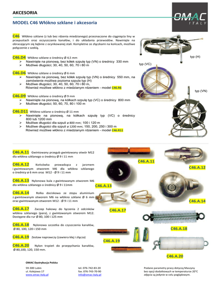 AKCESORIA MODEL C46 Włókno szklane i akcesoria C46 Włókno szklane (z lub bez rdzenia miedzianego) przeznaczone do ciągnięcia liny w przepustach oraz oczyszczania kanałów, i do układania przewodów. Nawinięte na obracającym się bębnie z ocynkowanej stali. Kompletne ze złączkami na końcach, możliwe połączenie z szeklą. C46.D4 Włókno szklane o średnicy Ø 4,5 mm Nawinięte na pionową, bez kółek szpulę typ (VN) o średnicy 330 mm Możliwe długości; 30, 40, 50, 60, 70 i 80 m typ (H) typ (VC) C46.D6 Włókno szklane o średnicy Ø 6 mm Nawinięte na pionową, bez kółek szpulę typ (VN) o średnicy 550 mm, na zamówienie możliwa pozioma szpula typ (H) Możliwe długości; 30, 40, 50, 60, 70 i 80 m, Również możliwe włókno z miedzianym rdzeniem - model C46.R6 typ (VN) C46.D9 Włókno szklane o średnicy Ø 9 mm Nawinięte na pionową, na kółkach szpulę typ (VC) o średnicy 800 mm Możliwe długości; 50, 60, 70, 80 i 100 m C46.D11 Włókno szklane o średnicy Ø 11 mm Nawinięte na pionową, na kółkach szpulę typ (VC) o średnicy 800 lub 1200 mm Możliwe długości dla szpuli ø 800 mm; 100 i 120 m Możliwe długości dla szpuli ø 1200 mm; 150, 200, 250 i 300 m Również możliwe włókno z miedzianym rdzeniem - model C46.R11 C46.A.11 Gwintowany przegub gwintowany otwór M12 dla włókna szklanego o średnicy Ø 9 i 11 mm C46.A.11 C46.A.12 Końcówka prowadząca z jarzmem i gwintowanym otworem M6 dla włókna szklanego o średnicy ø 6 mm oraz M12 - Ø 9 i 11 mm C46.A.12 C46.A.13 Nylonowa kula z gwintowanym otworem M6 dla włókna szklanego o średnicy Ø 9 i 11mm C46.A.13 C46.A.14 Rolka dociskowa ze stopu aluminium z gwintowanym otworem M6 na włókno szklane Ø 6 mm oraz gwintowanym otworem M12 - Ø 9 i 11 mm C46.A.17 Zaczep hakowy do łączenia 2 odcinków włókna szklanego (para), z gwintowanym otworem M12. Dostępne dla rur Ø 80, 100 i 125 mm C46.A.14 C46.A.17 C46.A.18 Nylonowa szczotka do czyszczenia kanałów, Ø 80, 100, 120 i 150 mm C46.A.19 C46.A.18 Zestaw naprawczy (zawiera klej i złącza) C46.A.19 C46.A.20 Nylon trzpień do przepychania kanałów, Ø 80,100, 120, 150 mm. C46.A.20 OMAC Dystrybucja Polska 59-300 Lubin ul. Kolejowa 17 www.omac-italy.pl tel. 076-742-83-20 fax. 076-743-70-90 [email protected] Podane parametry pracy dotyczą Maszyny bez opcji dodatkowych w temperaturze 20°C zdjęcia są jedynie w celu poglądowym.