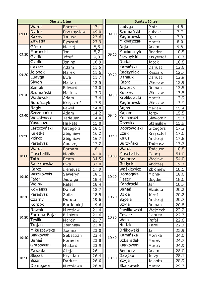 09:00 09:10 09:20 09:30 09:40 09:50 10:00 10:10 10:20 10:30 10:40 10:50 Starty z 1 tee Warot Bartosz Dyduk Przemysław Kazek Janusz Zawada Ryszard Górski Maciej Morański Jan Gładki Józef Gładki Janina Cesarz Adam Jelonek Marek Ludyga Ewa Siwon Marian Szmak Edward Szumański Mariusz Wadowski Adam Borończyk Krzysztof Nagły Paweł Szczepański Adam Wesołowski Tadeusz Yasukazu Hijikata Leszczyński Grzegorz Kaletka Zbigniew Piórko Zbigniew Paradysz Andrzej Warot Barbara Muschallik Monika Toth Beata Raczkowska Ewa Karcz Ireneusz Wiszkowski Seweryn Fajer Jadwiga Wolny Rafał Kowalski Daniel Paradysz Zofia Czarny Dorota Korpok Bartłomiej Nowak Mirosław Fortuna-Bujas Elżbieta Tyslik Marcin Trojan Zbigniew Mikuszewska Joanna Białkowski Sebastian Banaś Kornelia Grabowski Medard Zawada Alicja Ślązak Krystian Bizan Dariusz Domogała Mirosława 17,1 49,0 22,6 23,9 8,5 8,7 9,0 18,9 11,5 11,6 11,7 12,5 13,0 13,3 13,4 13,5 14,0 14,2 14,4 15,0 16,1 16,2 16,7 17,2 18,1 41,0 34,5 32,0 17,9 18,1 18,4 18,4 18,7 18,9 19,6 19,6 21,4 21,6 21,7 21,8 23,0 23,4 23,8 23,9 26,1 26,4 26,6 26,8 09:00 09:10 09:20 09:30 09:40 09:50 10:00 10:10 10:20 10:30 10:40 10:50 Starty z 10 tee Ludyga Piotr Szumański Łukasz Zagórowski Igor Mikołajczak Marek Deja Adam Macionczyk Bogdan Przybylski Krzysztof Dudak Jacek Kamiński Dariusz Radzyniak Ryszard Daniluk Dariusz Kapral Wiesław Jaworski Roman Kuczek Wiesław Królikowski Marek Zagórowski Wiesław Bujas Marian Kajzer Jerzy Kucharski Sławomir Grzesica Stanisław Dobrowolski Grzegorz Czak Krzysztof Kalus Andrzej Burzyński Tadeusz Warot Tadeusz Muschallik Georg Bednorz Wacław Godycki Andrzej Waśkiewicz Zbigniew Domogała Michał Fiszer Bogdan Kondracki Jan Banaś Elżbieta Dzida Józef Bącela Andrzej Szyja Roman Pawlikowski Wojciech Cesarz Danuta Walo Rafał Hudak Karol Orlikowski Jan Kamińska Monika Szkaradek Marek Kiełkowski Marek Bednorz Adam Dziąćko Jerzy Szyja Jolanta Skałkowski Marek 4,8 7,7 7,9 8,0 9,8 10,5 10,7 10,8 12,6 12,7 12,9 12,9 13,5 13,5 13,9 13,9 15,4 15,5 15,7 15,9 17,3 17,6 17,6 17,7 18,8 51,0 54,0 19,7 18,5 18,6 18,6 18,7 20,2 20,2 20,7 20,8 22,2 22,3 22,6 22,7 23,9 24,0 24,7 24,9 28,0 28,1 28,9 29,3 Fiszer Pawełczyk 11:00 Szumańska Szumańska Jarno Klon 11:10 Szczepańska Ślązak Ewa Sebastian Magdalena Iwona Leszek Stanislaw Ewa Alicja 29,8 30,9 31,2 31,9 35,9 35,9 36,0 36,0 Karasiński Jarno 11:00 Śliwka Nagengast Mirus Filipowicz 11:10 Ling Klon Tomasz Maria Maria Katarzyna Małgorzata Jakub James Ilona 32,2 32,8 33,7 35,2 38,0 40,0 40,0 49,0
