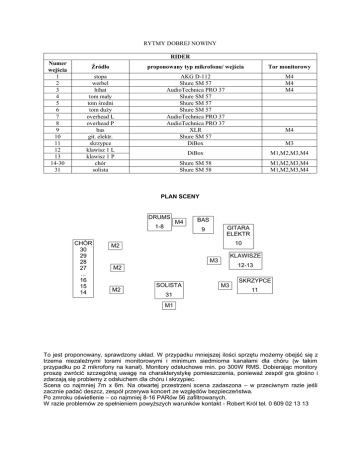 RYTMY DOBREJ NOWINY RIDER Numer wejścia 1 2 3 4 5 6 7 8 9 10 11 12 13 14-30 31 Źródło proponowany typ mikrofonu/ wejścia Tor monitorowy stopa werbel hihat tom mały tom średni tom duży overhead L overhead P bas git. elektr. skrzypce klawisz 1 L klawisz 1 P chór solista AKG D-112 Shure SM 57 AudioTechnica PRO 37 Shure SM 57 Shure SM 57 Shure SM 57 AudioTechnica PRO 37 AudioTechnica PRO 37 XLR Shure SM 57 DiBox M4 M4 M4 DiBox M1,M2,M3,M4 Shure SM 58 Shure SM 58 M1,M2,M3,M4 M1,M2,M3,M4 M4 M3 PLAN SCENY DRUMS 1-8 CHÓR 30 29 28 27 ... 16 15 14 M4 BAS GITARA ELEKTR 9 10 M2 KLAWISZE M3 12-13 M2 M2 SOLISTA 31 M3 SKRZYPCE 11 M1 To jest proponowany, sprawdzony układ. W przypadku mniejszej ilości sprzętu możemy obejść się z trzema niezależnymi torami monitorowymi i minimum siedmioma kanałami dla chóru (w takim przypadku po 2 mikrofony na kanał). Monitory odsłuchowe min. po 300W RMS. Dobierając monitory proszę zwrócić szczególną uwagę na charakterystykę pomieszczenia, ponieważ zespół gra głośno i zdarzają się problemy z odsłuchem dla chóru i skrzypiec. Scena co najmniej 7m x 6m. Na otwartej przestrzeni scena zadaszona – w przeciwnym razie jeśli zacznie padać deszcz, zespół przerywa koncert ze względów bezpieczeństwa. Po zmroku oświetlenie – co najmniej 8-16 PARów 56 zafiltrowanych. W razie problemów ze spełnieniem powyższych warunków kontakt - Robert Król tel. 0 609 02 13 13