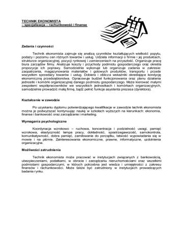 TECHNIK EKONOMISTA – specjalizacja – rachunkowość i finanse Zadania i czynności Technik ekonomista zajmuje się analizą czynników kształtujących wielkość popytu, podaży i poziomu cen różnych towarów i usług. Udziela informacji o firmie i jej produktach, strukturze organizacyjnej, pozycji rynkowej i zamierzeniach na przyszłość. Organizuje pracę biura zarządów firmy. Analizuje koszty i przychody podmiotu gospodarczego oraz określa propozycje ich poprawy. Samodzielnie wykonuje lub organizuje zadania w zakresie: zaopatrzenia, magazynowania materiałów i gotowych produktów, transportu i przede wszystkim sprzedaży towarów i usług. Dobiera i oblicza wskaźniki określające kondycję ekonomiczną przedsiębiorstwa. Opracowuje budżet funkcjonowania oraz planu działania jednostki i komórki organizacyjnej danego podmiotu gospodarczego. Może kierować małymi zespołami współpracowników we wszystkich jednostkach i komórkach organizacyjnych, samodzielnie prowadzić małą firmę, bądź pełnić funkcje asystenta prezesa (dyrektora). Kształcenie w zawodzie Po uzyskaniu dyplomu potwierdzającego kwalifikacje w zawodzie technik ekonomista można je podwyższać kontynuując naukę w szkołach wyższych na kierunkach: ekonomia, finanse i bankowość oraz zarządzanie i marketing. Wymagania psychologiczne Koordynacja wzrokowo – ruchowa, koncentracja i podzielność uwagi, pamięć wzrokowa, elastyczność tempa pracy, dokładność, spostrzegawczość, samokontrola, komunikatywność, dobra pamięć, zamiłowanie do porządku, łatwość wypowiadania się w mowie i na piśmie. Zainteresowania ekonomiczne, prawne, informatyczne, uzdolnienia organizacyjne. Możliwości zatrudnienia Technik ekonomista może pracować w instytucjach związanych z bankowością, ubezpieczeniami, podatkami, w obrocie i zarządzaniu nieruchomościami oraz wszelkimi podmiotami gospodarczymi, w których potrzebna jest wiedza i umiejętności z zakresu finansów i rachunkowości. Może także być zatrudniony w instytucjach prowadzących badania rynku.