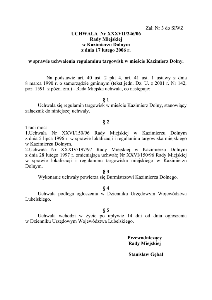 Zał. Nr 3 do SIWZ UCHWAŁA Nr XXXVII/246/06 Rady Miejskiej w Kazimierzu Dolnym z dnia 17 lutego 2006 r. w sprawie uchwalenia regulaminu targowisk w mieście Kazimierz Dolny. Na podstawie art. 40 ust. 2 pkt 4, art. 41 ust. 1 ustawy z dnia 8 marca 1990 r. o samorządzie gminnym (tekst jedn. Dz. U. z 2001 r. Nr 142, poz. 1591 z późn. zm.) - Rada Miejska uchwala, co następuje: §1 Uchwala się regulamin targowisk w mieście Kazimierz Dolny, stanowiący załącznik do niniejszej uchwały. §2 Traci moc: 1.Uchwała Nr XXVI/150/96 Rady Miejskiej w Kazimierzu Dolnym z dnia 5 lipca 1996 r. w sprawie lokalizacji i regulaminu targowiska miejskiego w Kazimierzu Dolnym. 2.Uchwała Nr XXXIV/197/97 Rady Miejskiej w Kazimierzu Dolnym z dnia 28 lutego 1997 r. zmieniająca uchwałę Nr XXVI/150/96 Rady Miejskiej w sprawie lokalizacji i regulaminu targowiska miejskiego w Kazimierzu Dolnym. §3 Wykonanie uchwały powierza się Burmistrzowi Kazimierza Dolnego. §4 Uchwała podlega ogłoszeniu w Dzienniku Urzędowym Województwa Lubelskiego. §5 Uchwała wchodzi w życie po upływie 14 dni od dnia ogłoszenia w Dzienniku Urzędowym Województwa Lubelskiego. Przewodniczący Rady Miejskiej Stanisław Gębal Załącznik do uchwały Nr XXXVII/246/06 z dnia 17 lutego 2006 r. REGULAMIN TARGOWISK §1. Na terenie miasta Kazimierz Dolny wyznaczonymi miejscami do prowadzenia działalności handlowej są: 1) targowisko przy ul. Rynek, 2) targowisko przed kamienicą „Pod Św. Mikołajem”, 3) targowisko przy ul. Mały Rynek, 4) targowisko przy ul. Nadwiślańskiej(chodnik przy Zespole Szkół od pierwszej bramy wjazdowej od strony skrzyżowania do końca sali gimnastycznej), 5) targowisko przy ul. Podzamcze (na chodniku), 6) targowisko przy rzece Grodarz, obok Muzeum Sztuki Złotniczej. § 2. 1. Na targowiskach obowiązuje zakaz sprzedaży następujących towarów: a)napojów alkoholowych, b)nafty, benzyny, c)zagranicznych banknotów i monet będących w obiegu, d)papierów wartościowych, e)broni, amunicji, materiałów wybuchowych i artykułów pirotechnicznych, f)towarów pochodzących z kradzieży bądź objętych aktualnie zakazem obrotu. 2. Na targowiskach obowiązuje zakaz: a)prowadzenia gier hazardowych, b)spożywania alkoholu, c)reklamy wyrobów przemysłu spirytusowego i tytoniowego, d)reklamy towarów przemysłu pornograficznego. §3. 1. Administratorem targowisk jest upoważniony przez Burmistrza Kazimierza Dolnego pracownik Urzędu Miasta w Kazimierzu Dolnym lub innej jednostki organizacyjnej Gminy Kazimierz Dolny. 2. Administrowanie targowiskami może zostać powierzone również osobie fizycznej, osobie prawnej lub jednostce organizacyjnej nieposiadającej osobowości prawnej niebędącej jednostką organizacyjną Gminy Kazimierz Dolny, z która zostanie zawarta umowa o administrowanie targowiskami. § 4. 1.Osoby prowadzące sprzedaż na targowiskach miejskich są obowiązane do przestrzegania regulaminu targowiska, przepisów sanitarnych i przeciwpożarowych, oraz stosowania się do poleceń administratora targowiska. 2. Administrator targowiska nie ponosi jakichkolwiek konsekwencji z tytułu zawieranych transakcji handlowych. 3. Sprzedaż towarów, co do których zachodzi uzasadnione podejrzenie, że są one szkodliwe dla zdrowia lub pochodzą z kradzieży, będzie wstrzymana przez obsługę targowiska, która z kolei jest obowiązana do powiadomienia Policji, Sanepidu lub innych właściwych organów. §5. 1. Targowisko na ul. Rynek przeznaczone jest do prowadzenia sprzedaży artykułów spożywczych, warzyw i owoców, produktów rolnych. 2. Targowisko przed kamienicą „Pod Św. Mikołajem” przeznaczone jest do prowadzenia sprzedaży przez malarzy artystów własnych prac. 3. Targowisko na ul. Mały Rynek przeznaczone jest do prowadzenia sprzedaży artykułów przemysłowych oraz sprzedaży mięsa, w tym z samochodu posiadającego atest sanitarny. 4. Targowisko przy ul. Nadwiślańskiej przeznaczone jest do sprzedaży artykułów przemysłowych i spożywczych. 5. Targowisko przy ul. Podzamcze przeznaczone jest do sprzedaży owoców miękkich. 6. Targowisko na placu przy rzece Grodarz obok Muzeum Sztuki Złotniczej przeznaczone jest do sprzedaży artykułów spożywczych, warzyw i owoców, produktów rolnych, a także w przypadku istnienia wolnych miejsc rękodzieła. §6. Ustala się następujące warunki prowadzenia sprzedaży na poszczególnych targowiskach oraz usytuowanie miejsc handlowych: a) targowisko przed kamienicą „Pod Św. Mikołajem”: - maksymalnie 15 stanowisk o wymiarach nieprzekraczających - 2,0 m szerokości i 2,5 m długości dla artystów malarzy sprzedających własne prace, z dopuszczeniem ustawienia na stanowisku tylko jednego stojaka do sprzedaży obrazów, o wymiarach nie przekraczjących 1,5m szerokości i 1,8m wysokości. b) targowisko na ul. Rynek: - artykuły spożywcze, owoce i warzywa oraz produkty rolne sprzedawane są w sektorach usytuowanych równolegle do budynków Urzędu Miasta i SARP-u. - osoby handlujące na Rynku zobowiązane są do przestrzegania zasad ruchu drogowego tj. nie blokowania ul. Nadwiślańskiej, ul. Nadrzecznej oraz dojazdu na Mały Rynek. c) targowisko na ul. Mały Rynek: - na centralnie położonym placu – miejsca handlowe o długości 2 m i szerokość do 2 m, szerokość przejścia między stoiskami 1,8 m, - na chodniku wzdłuż placu zabaw, - wzdłuż budynku gospodarczego Urzędu Miasta, - u podnóża budynku „Jatki” od strony południowej i wschodniej. - parkowanie pojazdów samochodowych w czasie trwania targu odbywa się w miejscach do tego przeznaczonych. § 7. Miejsca sprzedaży dla handlujących wyznacza administrator targowiska zgodnie z planem graficznym stanowiącym załączniki do Zarządzenia Nr 18 Burmistrza Kazimierza Dolnego z dnia 11 czerwca 2004 r. w sprawie szczegółowego sposobu wykorzystania niektórych terenów miasta Kazimierz Dolny. § 8. 1. Targowisko na ul. Rynek, czynne jest we wtorki i piątki w g