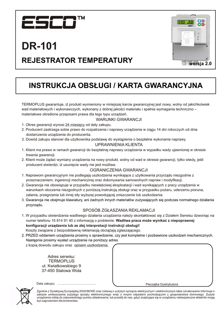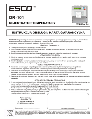 DR-101 REJESTRATOR TEMPERATURY wersja 2.0 INSTRUKCJA OBSŁUGI / KARTA GWARANCYJNA TERMOPLUS gwarantuje, iż produkt wymieniony w niniejszej karcie gwarancyjnej jest nowy, wolny od jakichkolwiek wad materiałowych i wykonawczych, wykonany z dobrej jakości materiału i spełnia wymagania techniczno – materiałowe określone przepisami prawa dla tego typu urządzeń. WARUNKI GWARANCJI 1. Okres gwarancji wynosi 24 miesięcy od daty zakupu. 2. Producent zastrzega sobie prawo do rozpatrzenia i naprawy urządzenia w ciągu 14 dni roboczych od dnia dostarczenia urządzenia do producenta. 3. Dowód zakupu stanowi dla użytkownika podstawę do wystąpienia o bezpłatne wykonanie naprawy. UPRAWNIENIA KLIENTA 1. Klient ma prawo w ramach gwarancji do bezpłatnej naprawy urządzenia w wypadku wady ujawnionej w okresie trwania gwarancji. 2. Klient może żądać wymiany urządzenia na nowy produkt, wolny od wad w okresie gwarancji, tylko wtedy, jeśli producent stwierdzi, iż usunięcie wady nie jest możliwe. OGRANICZENIA GWARANCJI 1. Naprawom gwarancyjnym nie podlegają uszkodzenia wynikające z użytkowania przyrządu niezgodnie z przeznaczeniem, ingerencji mechanicznej oraz dokonywania samowolnych napraw i modyfikacji. 2. Gwarancja nie obowiązuje w przypadku niewłaściwej eksploatacji i wad wynikających z pracy urządzenia w warunkach otoczenia niezgodnych z poniższą instrukcją obsługi oraz w przypadku pożaru, uderzeniu pioruna, zalania, przegrzania lub innej siły wyższej powodującej zniszczenie lub uszkodzenia. 3. Gwarancja nie obejmuje klawiatury, ani żadnych innych materiałów zużywających się podczas normalnego działania przyrządu. SPOSÓB ZGŁASZANIA REKLAMACJI 1. W przypadku stwierdzenia wadliwego działania urządzenia należy skontaktować się z Działem Serwisu dzwoniąc na numer telefonu 15 814 91 40 z informacją o problemie. Wadliwa praca może wynikać z niepoprawnej konfiguracji urządzenia lub ze złej interpretacji instrukcji obsługi! Koszty związane z bezpodstawną reklamacją obciążają zgłaszającego. 2. PRZED oddaniem urządzenia prosimy o sprawdzenie, czy jest kompletne i pozbawione uszkodzeń mechanicznych. Następnie prosimy wysłać urządzenie na poniższy adres z kopią dowodu zakupu oraz opisem uszkodzenia. Adres serwisu: TERMOPLUS ul. Kwiatkowskiego 9 37-450 Stalowa Wola Data zakupu: ............................................ Pieczątka Dystrybutora Zgodnie z Dyrektywą Europejską 2002/96/WE oraz Ustawą o zużytym sprzęcie elektrycznym i elektronicznym takie oznakowanie informuje o zakazie umieszczania zużytego sprzętu elektronicznego wraz z innymi odpadami pochodzącymi z gospodarstwa domowego. Zużyte urządzenie oddaj do odpowiedniego punktu składowania, lub prześlij do nas, gdyż znajdujące się w urządzeniu niebezpieczne składniki mogą być zagrożeniem dla środowiska. 1. CHARAKTERYSTYKA. Rejestrator DR-101 przeznaczony jest do pomiaru i rejestracji temperatury z jednego czujnika temperatury oraz zdarzeń z dwóch wejść cyfrowych (otwarcie drzwi, praca agregatu, cykle odszraniania). Bieżąca wartość temperatury oraz stany alarmowe prezentowane są na podświetlanym wyświetlaczu alfanumerycznym. Dane pomiarowe gromadzone są w nieulotnej pamięci rejestratora. Częstotliwość zapamiętywania danych można programować w zakresie od 1 do 999 minut. Pojemność pamięci wynosi 32 000 pomiarów (wystarcza na około ROK przy częstotliwości 15 minut). Po zapełnieniu pamięci, rejestrator kontynuuje pracę, najstarsze pomiary są sukcesywnie zastępowane najnowszymi. Zapamiętane dane mogą być kasowane, a wejście do menu zabezpieczone hasłem. Rejestrator wyposażony jest w drukarkę termiczną dzięki, której istnieje możliwość wydruku danych bieżących lub z pamięci urządzenia za dowolny okres czasu. Na każdym raporcie widoczne są dane właściciela, opis pojazdu i czujników, przebieg temperatury w czasie, zdarzenia z wejść cyfrowych, stany alarmowe temperatury, moment załadunku i rozładunku oraz miejsce na podpis. Raport umożliwia prześledzeni całej historii transportu przez końcowego odbiorcę towaru. Użytkownik ma możliwość zaprogramowania minimalnej i maksymalnej temperatury, po przekroczeniu której zostanie poinformowany komunikatem na wyświetlaczu, sygnałem dźwiękowym oraz aktywnym stanem przekaźnika. Obsługa urządzenia jest prosta i intuicyjna, wszystkie komunikaty i komendy wyświetlane są w języku polskim. Rejestrator ma funkcją “dostawa”, która pozwala użytkownikowi i odbiorcy na identyfikację czasu rozpoczęcia i zakończenia kursu na wydrukowanym raporcie. Przyrząd przeznaczony jest do kontroli transportu i zasilany jest z samochodowej instalacji elektrycznej 12...24V. Dostępna jest też wersja stacjonarna z zasilaniem sieciowym 230V. Opcjonalnie dostępne są też czujniki otwarcia drzwi, zewnętrzne sygnalizatory dźwiękowe oraz świadectwo wzorcowania przyrządu. 2. DANE TECHNICZNE Wejścia: czujnik temperatury: NTC 5k przy 25°C 2 wejścia cyfrowe (normalnie zwarte lub rozwarte) Zakres pomiarowy: NTC: -40...+120°C (-40...+80°C - czujnik naścienny) Dokładność pomiaru: NTC w zakresie: -40...+80°C: ±0,5°C, w pozostałym ±1°C Bufor pamięci 32 000 pomiarów, pamięć nieulotna Częst. zapam. danych: 1...999 minut Rozdzielczość wskazań: 0,1°C w całym zakresie Wyświetlacz: ciekłokrystaliczny z podświetleniem, 2 x 16 znaków Drukarka: termiczna, prędkość druku 30mm/s, na papier termoczuły o szerokości rolki 57,5mm ±0,5mm, rolka o średnicy 35mm Stopień i klasa ochrony: IP65 / II Zasilanie: 12...24V=/~±20% lub dla wersji stacjonarnej: 85...265V~ Pobór prądu: podczas rejestracji 50mA, podczas wydruku do 3A Warunki pracy i składowania: praca: -30...60°C; składowanie: -40...80°C 3. SCHEMAT PODŁĄCZENIA. D2 D1 Czujnik temperatury 2 Wejścia cyfrowe (zwarty/rozwarty) Zasilanie Alarm 4. MONTAŻ. Rejestrator. rejestrator DR-101 przekaźnik a