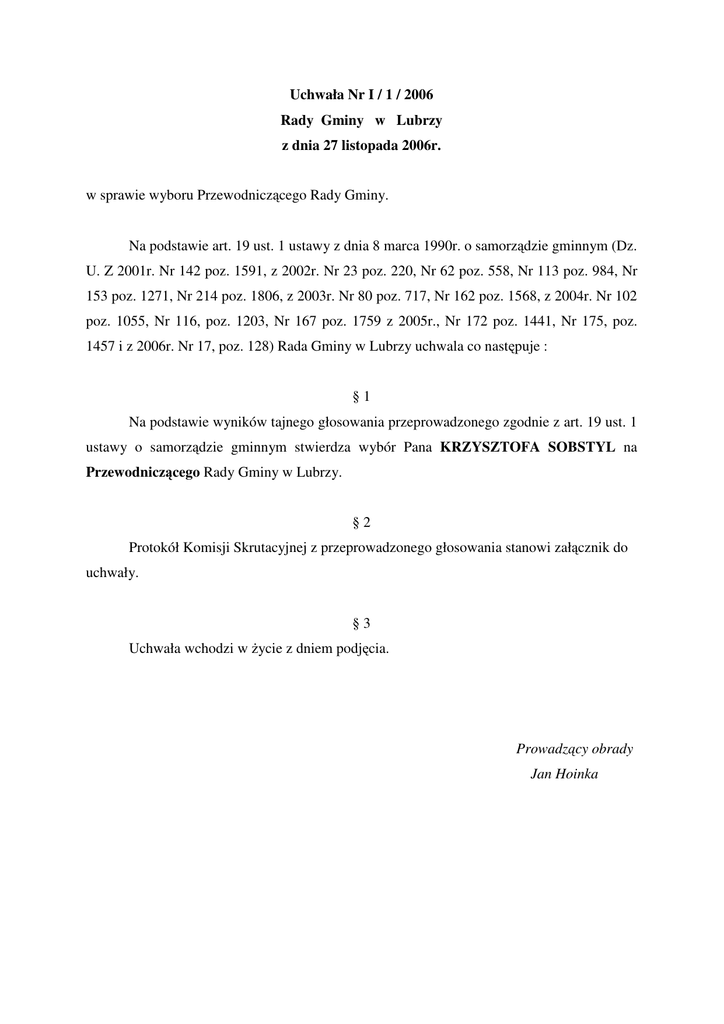 Uchwała Nr I / 1 / 2006 Rady Gminy w Lubrzy z dnia 27 listopada 2006r. w sprawie wyboru Przewodnicz cego Rady Gminy. Na podstawie art. 19 ust. 1 ustawy z dnia 8 marca 1990r. o samorz dzie gminnym (Dz. U. Z 2001r. Nr 142 poz. 1591, z 2002r. Nr 23 poz. 220, Nr 62 poz. 558, Nr 113 poz. 984, Nr 153 poz. 1271, Nr 214 poz. 1806, z 2003r. Nr 80 poz. 717, Nr 162 poz. 1568, z 2004r. Nr 102 poz. 1055, Nr 116, poz. 1203, Nr 167 poz. 1759 z 2005r., Nr 172 poz. 1441, Nr 175, poz. 1457 i z 2006r. Nr 17, poz. 128) Rada Gminy w Lubrzy uchwala co nast puje : §1 Na podstawie wyników tajnego głosowania przeprowadzonego zgodnie z art. 19 ust. 1 ustawy o samorz dzie gminnym stwierdza wybór Pana KRZYSZTOFA SOBSTYL na Przewodnicz cego Rady Gminy w Lubrzy. §2 Protokół Komisji Skrutacyjnej z przeprowadzonego głosowania stanowi zał cznik do uchwały. §3 Uchwała wchodzi w ycie z dniem podj cia. Prowadz cy obrady Jan Hoinka Protokół Komisji Skrutacyjnej powołanej na sesji Rady Gminy w Lubrzy w dniu 27 listopada 2006r. dla przeprowadzenia wyboru Przewodnicz cego Rady Gminy w Lubrzy Komisja w składzie : - Przewodnicz cy – Ryszard Barczyk - członek – Robert Smole - członek- Mieczysław Kras Stwierdza, e : 1. W głosowaniu wzi ło udział 15 radnych Rady Gminy w Lubrzy 2. Zgłoszono nast puj cych kandydatów na Przewodnicz cego Rady Gminy : - KRZYSZTOF SOBSTYL - LILLA G SIOR 3. Przeprowadzono tajne głosowanie zgodnie z art. 19 ustawy o samorz dzie gminnym. Głosów wa nych oddano – 14 Głosów niewa nych oddano – 0 Głosów „wstrzymuj cych si ” - 1 4. Zgłoszeni kandydaci otrzymali nast puj c ilo głosów : - KRZYSZTOF SOBSTYL - 10 - głosów - LILLA G SIOR - 4 - głosów 5. Wobec powy szego Komisja stwierdza, e Przewodnicz cym Rady Gminy został wybrany KRZYSZTOF SOBSTYL Podpisy członków Komisji ………………………………………….. …………………………………………… …………………………………………… Lubrza, dn. 2006-11-27
