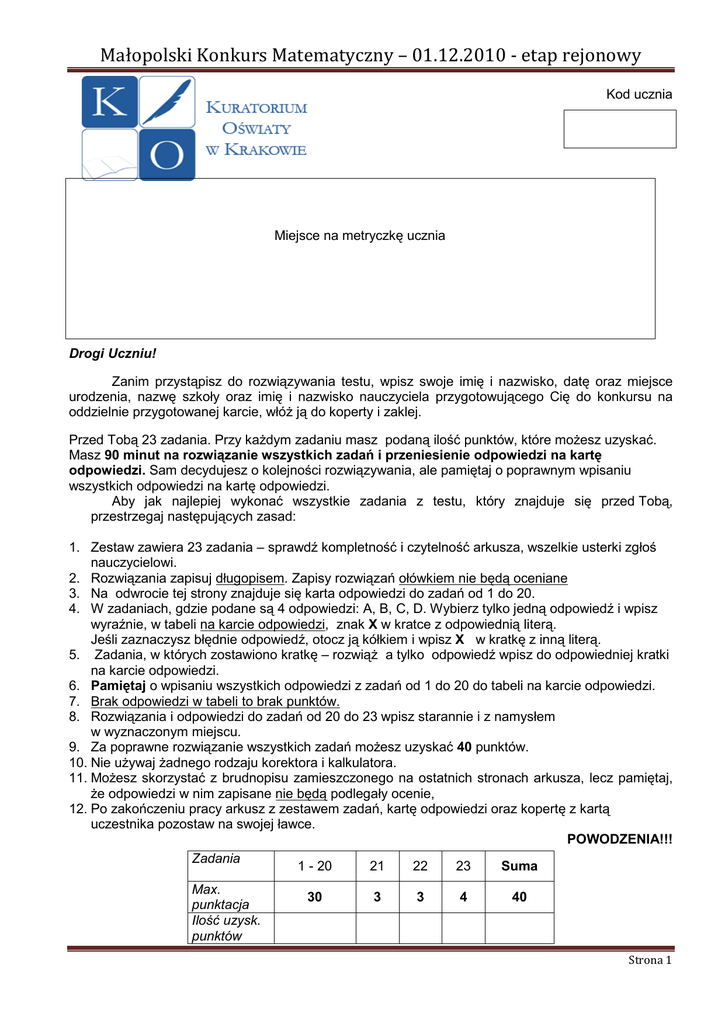 Małopolski Konkurs Matematyczny – 01.12.2010 - etap rejonowy Kod ucznia Miejsce na metryczkę ucznia Drogi Uczniu! Zanim przystąpisz do rozwiązywania testu, wpisz swoje imię i nazwisko, datę oraz miejsce urodzenia, nazwę szkoły oraz imię i nazwisko nauczyciela przygotowującego Cię do konkursu na oddzielnie przygotowanej karcie, włóŜ ją do koperty i zaklej. Przed Tobą 23 zadania. Przy kaŜdym zadaniu masz podaną ilość punktów, które moŜesz uzyskać. Masz 90 minut na rozwiązanie wszystkich zadań i przeniesienie odpowiedzi na kartę odpowiedzi. Sam decydujesz o kolejności rozwiązywania, ale pamiętaj o poprawnym wpisaniu wszystkich odpowiedzi na kartę odpowiedzi. Aby jak najlepiej wykonać wszystkie zadania z testu, który znajduje się przed Tobą, przestrzegaj następujących zasad: 1. Zestaw zawiera 23 zadania – sprawdź kompletność i czytelność arkusza, wszelkie usterki zgłoś nauczycielowi. 2. Rozwiązania zapisuj długopisem. Zapisy rozwiązań ołówkiem nie będą oceniane 3. Na odwrocie tej strony znajduje się karta odpowiedzi do zadań od 1 do 20. 4. W zadaniach, gdzie podane są 4 odpowiedzi: A, B, C, D. Wybierz tylko jedną odpowiedź i wpisz wyraźnie, w tabeli na karcie odpowiedzi, znak X w kratce z odpowiednią literą. Jeśli zaznaczysz błędnie odpowiedź, otocz ją kółkiem i wpisz X w kratkę z inną literą. 5. Zadania, w których zostawiono kratkę – rozwiąŜ a tylko odpowiedź wpisz do odpowiedniej kratki na karcie odpowiedzi. 6. Pamiętaj o wpisaniu wszystkich odpowiedzi z zadań od 1 do 20 do tabeli na karcie odpowiedzi. 7. Brak odpowiedzi w tabeli to brak punktów. 8. Rozwiązania i odpowiedzi do zadań od 20 do 23 wpisz starannie i z namysłem w wyznaczonym miejscu. 9. Za poprawne rozwiązanie wszystkich zadań moŜesz uzyskać 40 punktów. 10. Nie uŜywaj Ŝadnego rodzaju korektora i kalkulatora. 11. MoŜesz skorzystać z brudnopisu zamieszczonego na ostatnich stronach arkusza, lecz pamiętaj, Ŝe odpowiedzi w nim zapisane nie będą podlegały ocenie, 12. Po zakończeniu pracy arkusz z zestawem zadań, kartę odpowiedzi oraz kopertę z kartą uczestnika pozostaw na swojej ławce. POWODZENIA!!! Zadania Suma 1 - 20 21 22 23 Max. punktacja Ilość uzysk. punktów 30 3 3 4 40 Strona 1 Małopolski Konkurs Matematyczny – 01.12.2010 - etap rejonowy Karta odpowiedzi: Numer zadania Liczba punktów za zadanie Miejsce na odpowiedź A Suma punktów: 1 1 2 1 3 1 4 1 5 1 6 1 7 1 8 1 9 1 10 1 11 2 12 2 13 2 14 2 15 2 16 2 17* 2 18* 2 19* 2 20* 2 B C D Podpisy sprawdzających: Strona 2 Małopolski Konkurs Matematyczny – 01.12.2010 - etap rejonowy Kod ucznia Przeczytaj uwaŜnie zadania od 1 do 16 i wybierz jedną z podanych czterech odpowiedzi. Wybraną odpowiedź zaznacz znakiem X w odpowiedniej kratce na karcie odpowiedzi. Zadanie 1 (1p) Pewną ilość cukierków zamierzano podzielić między 15 dzieci. PoniewaŜ troje dzieci nie przyszło na spotkanie, na kaŜde z pozostałych dzieci przypadły o 2 cukierki więcej. Ile było cukierków do podzielenia? A. 60 Zadanie 2 B. 100 C. 120 D. 150 (1p) Drut długości 4,5 m zgięto w połowie tak, Ŝe obie części tworzą kąt o mierze 60o . Jaka jest odległość między końcami tak zgiętego drutu? A. 12 m B. 9 m C. 4,5 m D. 2,25 m Zadanie 3 (1p) Jaki procent pola całego prostokąta stanowi pole zacieniowanego trójkąta? A. 30% B. 50% C. 60% D. 75% Zadanie 4 (1p) Ozdobny wazon ma formę graniastosłupa prostego o 27 krawędziach. Jakim wielokątem jest podstawa tego wazonu? A. Sześciokątem Zadanie 5 B. Siedmiokątem C. Dziewięciokątem D. Dziesięciokątem (1p) Na obóz letni pojechało 80 harcerzy. Mieli do dyspozycji namioty 5 i 9 osobowe. Jaką najmniejszą liczbę namiotów zabrali ze sobą, jeśli wszystkie wzięte namioty były w pełni wykorzystane? A. 12 B. 16 C. 8 D. 9 Strona 3 Małopolski Konkurs Matematyczny – 01.12.2010 - etap rejonowy Zadanie 6 (1p) Podczas zawodów zręcznościowych drewniane klocki w kształcie prostopadłościanu o wymiarach 1 cm x 2 cm x 4 cm zawodnicy układają na czas do sześciennych pojemniczków o wymiarach 4 cm x 4 cm x 4 cm. Ile takich klocków mieści się w jednym pojemniczku? A. 6 sztuk B. 10 sztuk Zadanie 7 C. 9 sztuk D. 8 sztuk (1p) Z kwadratowych kawałków materiału o wymiarach 10 cm x 10 cm krawcowa uszyła prostokątną narzutę o długości 1,5 m i szerokości 1 m. W kaŜdym miejscu, w którym stykają się ze sobą cztery kwadraciki przyszyła ozdobny koralik. Ile koralików zuŜyła do ozdobienia narzuty? A. 150 sztuk B. 140 sztuk Zadanie 8 C. 126 sztuk D. 104 sztuki (1p) Kwadratowa szkółka z drzewkami owocowymi ma powierzchnię 49 arów. Ile metrów siatki ogrodzeniowej zuŜyto na ogrodzenie tej szkółki, jeŜeli brama zajmuje A. 275 m siatki. Zadanie 9 B. 70 m siatki. C. 65 m siatki. 1 długości boku? 14 D. 280 m siatki. (1p) Jacek do jajecznicy zuŜył dokładnie połowę jajek znajdujących się w lodówce i jeszcze pół jajka. Z ilu jajek usmaŜył jajecznicę, jeŜeli w lodówce zostało 5 jajek. A. 11 B. 6 Zadanie 10 C. 5 D. 4 (1p) Samochód osobowy ma 5 kół (razem z zapasowym). Po przejechaniu 100 000 km okazało się, Ŝe kaŜda z pięciu opon jest jednakowo zuŜyta (przejechała taką samą drogę). Jaką odległość przejechało kaŜde koło? A. 100 000 km Zadanie 11 B. 80 000 km C. 75 000 km D. 20 000 km (2p) Kasia obliczyła, Ŝe jadąc rowerem z prędkością 200 m/minutę dojedzie do domu babci w ciągu pół godziny. Po przejechaniu 2 drogi zatrzymała się na 5 minut. Z jaką prędkością musi 3 jechać dalej, aby dojechać do babci w zaplanowanym czasie? A. 250 m/ min. Zadanie 12 B. 200 m/ min C. 500 m/ min D. 400 m/ min (2p) Pociąg o długości 200 m jedzie przez tunel o długości 200 m z prędkością 200 km/ godz. Ile czasu upłynie od momentu wejścia czoła lokomotywy do tunelu do chwili, gdy ostatni wagon opuści tunel? A. 7,2 sekundy B. 3,6 sekundy C. 72 sekundy D. 36 sekund Strona 4 Małopo