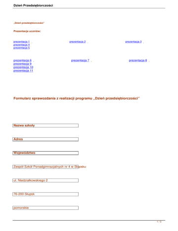 Dzień Przedsiębiorczości „Dzień przedsiębiorczości” Prezentacje uczniów: prezentacja 1 , prezentacja 4 prezentacja 5 prezentacja 6 , prezentacja 9 prezentacja 10 prezentacja 11 prezentacja 2 , prezentacja 7 , prezentacja 3 , prezentacja 8 , Formularz sprawozdania z realizacji programu „Dzień przedsiębiorczości” Nazwa szkoły Adres Województwo Zespół Szkół Ponadgimnazjalnych nr 4 w Słupsku ul. Niedziałkowskiego 2 76-200 Słupsk pomorskie 1/5 Dzień Przedsiębiorczości Imię i nazwisko szkolnego koordynatora (koordynatorów) Natasza Żmuda-Trzebiatowska Liczba uczniów realizujących program 75 Liczba klas objętych programem 6 klas Liczba firm i instytucji, w których uczniowie odbyli praktyki 50 Najważniejsze działania podjęte podczas realizacji programu przez szkolnego koordynatora (w punktach) 2/5 Dzień Przedsiębiorczości 1. 2. 3. 4. 5. 6. 7. 8. Uświadomienie uczniom, rodzicom i Radzie Pedagogicznej istoty i roli Dnia Przedsiębiorczości. Przygotowanie uczniów do wejścia na rynek pracy, rozwój zainteresowań i aktywności społecznej uczniów. Zwrócenie uczniom uwagi na posiadane predyspozycje, umiejętności i zainteresowania młodzieży. Nawiązanie współpracy z przedsiębiorcami i instytucjami lokalnego rynku pracy. Zebranie odpowiedniej dokumentacji i czuwanie nad prawidłowym przebiegiem w/w imprezy. Opracowanie i wysłanie podziękowań dla współpracujących firm i instytucji. Przeprowadzenie konkursu na reportaż z Dnia Przedsiębiorczości – etap szkolny. Publikacja materiałów związanych z DP na stronie internetowej szkoły. Wypowiedzi uczniów na temat „Dnia przedsiębiorczości” (wraz z imieniem i nazwiskiem ucznia) 1. Dzięki uczestnictwu w tym projekcie poznałem zasady pracy na stanowisku, na którym może w niedalekiej p 2. Chociaż DP trwał 1 dzień to pozwolił mi zdobyć informacje na temat zawodu strażaka i jego codziennej prac 3. Był to bardzo ciekawy dzień, wiele się nauczyłem na temat ratownictwa. Ponieważ w przyszłości chce zosta 4. DP jak i firma bardzo pozytywny. Z tych raptem 4 godzin można wynieść o wiele więcej niż na zajęciach szk 5. Miałem okazje w ciągu tych 3 krótkich godzin do skompletowania dla klienta sprzętu komputerowego. Zapoz 6. Odbywałem praktykę u babci w sklepie. To pierwszy dzień mojej kariery zawodowej. Przekonałem się jaka 7. Dzięki DP uświadomiłem sobie jak ważna jest precyzja na stanowisku pomocnika budowy i jak to ciężka i od 8. Maiłem możliwość zweryfikowania swych wyobrażeń o zawodzie elektromechanika, zapoznania się w prakt 9. Uważam, że DP jest potrzebny by młodzież taka nie opanowana jak na owe czasy posmakowała czym jest 10. DP był fajnym przeżyciem. Oby takich więcej, Michał Sochacki. Wypowiedzi konsultantów na temat programu (wraz z imieniem i nazwiskiem konsultanta, nazwą stanowis 3/5 Dzień Przedsiębiorczości 1. 2. 3. 4. 5. Uczniowie chętni do pracy i współpracy, wykazywali zainteresowanie nie tylko asortymentem – typami samo Jednodniowa praktyka to dobra pomoc. Uczniowie wykazywali inicjatywę i chęć do współpracy /Witold Dąbr Jestem bardzo zadowolony z ucznia, był bardzo pomocny w wykonywanych zadaniach /Krzysztof Zieliński, Uczeń szybko się zaklimatyzował, wykazał umiejętność pracy w grupie, gotowy do współpracy /Bogdan Iwa Taki dzień praktyk to bardzo dobry pomysł, miałem okazję zaszczepić u młodzieży bakcyla tego zawodu. By Udział szkoły w programie w latach 2004-2007 (tak lub nie) 27 kwietnia 2004 -nie 10 marca 2005 -nie 15 marca 2006 -nie 15 marca 2007 –tak 3 kwietnia 2008 -tak Najaktywniejsza firma według uczestników (nazwa firmy, adres, przedstawiciel oraz krótkie uzasadnienie) 4/5 Dzień Przedsiębiorczości 1. 2. 3. 4. 5. 6. Bank Gospodarki Żywnościowej w Słupsku /Zofia Kawałek, zaangażowanie konsultanta, chęć FORD EURO-CAR Sp. z o.o w Słupsku /Paweł Więzowski, chęć współpracy, pasja wykonywanego zaw Sklep Mięsno-Wędliniarski Słupsk / Jarosław Najdowski , ZUS w Słupsku /Danuta Rosiak, umożliwienie uczniom obsługi petentów, zazn Miejskie Przedszkole nr 17 w Słupsku / Alicja Kaczyńska , Komenda Miejska Powiatowej Straży Pożarnej /Andrzej w Słupsku Gomulski, chęć zaszczepienia u młodzieży bakcyla i z Dnia 23 kwietnia 2008r. Podpis szkolnego koordynatora: Sprawozdanie należy przesłać w nieprzekraczalnym terminie do 5 maja 2008 roku na adres: joanna.mr [email protected] lub pocztą na adres: Fundacja Młodzieżowej Przedsiębiorczości, ul. Kalatówki 6, 02-702 Warszawa. 5/5