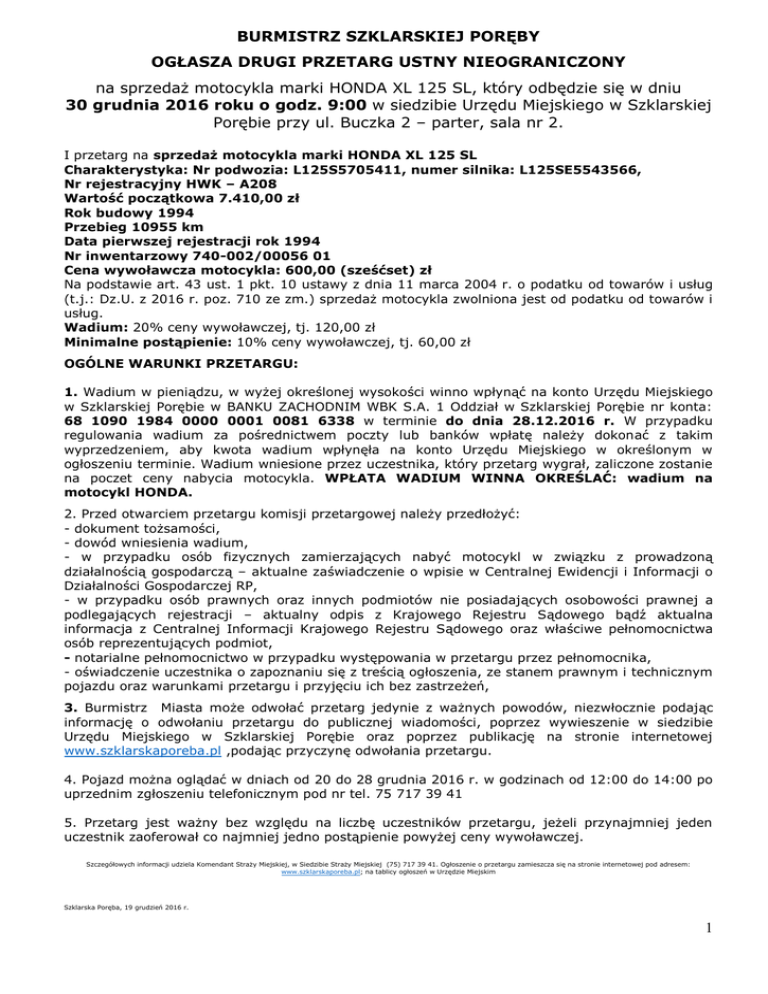 BURMISTRZ SZKLARSKIEJ PORĘBY OGŁASZA DRUGI PRZETARG USTNY NIEOGRANICZONY na sprzedaż motocykla marki HONDA XL 125 SL, który odbędzie się w dniu 30 grudnia 2016 roku o godz. 9:00 w siedzibie Urzędu Miejskiego w Szklarskiej Porębie przy ul. Buczka 2 – parter, sala nr 2. I przetarg na sprzedaż motocykla marki HONDA XL 125 SL Charakterystyka: Nr podwozia: L125S5705411, numer silnika: L125SE5543566, Nr rejestracyjny HWK – A208 Wartość początkowa 7.410,00 zł Rok budowy 1994 Przebieg 10955 km Data pierwszej rejestracji rok 1994 Nr inwentarzowy 740-002/00056 01 Cena wywoławcza motocykla: 600,00 (sześćset) zł Na podstawie art. 43 ust. 1 pkt. 10 ustawy z dnia 11 marca 2004 r. o podatku od towarów i usług (t.j.: Dz.U. z 2016 r. poz. 710 ze zm.) sprzedaż motocykla zwolniona jest od podatku od towarów i usług. Wadium: 20% ceny wywoławczej, tj. 120,00 zł Minimalne postąpienie: 10% ceny wywoławczej, tj. 60,00 zł OGÓLNE WARUNKI PRZETARGU: 1. Wadium w pieniądzu, w wyżej określonej wysokości winno wpłynąć na konto Urzędu Miejskiego w Szklarskiej Porębie w BANKU ZACHODNIM WBK S.A. 1 Oddział w Szklarskiej Porębie nr konta: 68 1090 1984 0000 0001 0081 6338 w terminie do dnia 28.12.2016 r. W przypadku regulowania wadium za pośrednictwem poczty lub banków wpłatę należy dokonać z takim wyprzedzeniem, aby kwota wadium wpłynęła na konto Urzędu Miejskiego w określonym w ogłoszeniu terminie. Wadium wniesione przez uczestnika, który przetarg wygrał, zaliczone zostanie na poczet ceny nabycia motocykla. WPŁATA WADIUM WINNA OKREŚLAĆ: wadium na motocykl HONDA. 2. Przed otwarciem przetargu komisji przetargowej należy przedłożyć: - dokument tożsamości, - dowód wniesienia wadium, - w przypadku osób fizycznych zamierzających nabyć motocykl w związku z prowadzoną działalnością gospodarczą – aktualne zaświadczenie o wpisie w Centralnej Ewidencji i Informacji o Działalności Gospodarczej RP, - w przypadku osób prawnych oraz innych podmiotów nie posiadających osobowości prawnej a podlegających rejestracji – aktualny odpis z Krajowego Rejestru Sądowego bądź aktualna informacja z Centralnej Informacji Krajowego Rejestru Sądowego oraz właściwe pełnomocnictwa osób reprezentujących podmiot, - notarialne pełnomocnictwo w przypadku występowania w przetargu przez pełnomocnika, - oświadczenie uczestnika o zapoznaniu się z treścią ogłoszenia, ze stanem prawnym i technicznym pojazdu oraz warunkami przetargu i przyjęciu ich bez zastrzeżeń, 3. Burmistrz Miasta może odwołać przetarg jedynie z ważnych powodów, niezwłocznie podając informację o odwołaniu przetargu do publicznej wiadomości, poprzez wywieszenie w siedzibie Urzędu Miejskiego w Szklarskiej Porębie oraz poprzez publikację na stronie internetowej www.szklarskaporeba.pl ,podając przyczynę odwołania przetargu. 4. Pojazd można oglądać w dniach od 20 do 28 grudnia 2016 r. w godzinach od 12:00 do 14:00 po uprzednim zgłoszeniu telefonicznym pod nr tel. 75 717 39 41 5. Przetarg jest ważny bez względu na liczbę uczestników przetargu, jeżeli przynajmniej jeden uczestnik zaoferował co najmniej jedno postąpienie powyżej ceny wywoławczej. Szczegółowych informacji udziela Komendant Straży Miejskiej, w Siedzibie Straży Miejskiej (75) 717 39 41. Ogłoszenie o przetargu zamieszcza się na stronie internetowej pod adresem: www.szklarskaporeba.pl; na tablicy ogłoszeń w Urzędzie Miejskim Szklarska Poręba, 19 grudzień 2016 r. 1