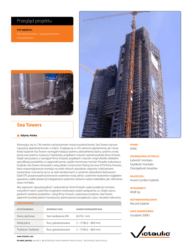 Przegląd projektu TYP OBIEKTU: Wysokościowiec z apartamentami mieszkalnymi Sea Towers Gdynia, Polska Wznoszący się na 136 metrów nad poziomem morza wysokościowiec Sea Towers stanowi najwyższy apartamentowiec w Gdyni. Znajdują się w nim zarówno apartamenty, jak i biura. Kiedy budynek Sea Towers wymagał instalacji systemu odwodnienia dachu, systemu wody pitnej oraz systemu tryskaczy i hydrantów, projektant i inżynier wybrali produkty firmy Victaulic. Dzięki skorzystaniu z rozwiązań firmy Victaulic projektant i inżynier mogli określić dokładne specyfikacje produktów, co zapewniło prosty, szybki i terminowy montaż. Ponadto wykonawca budynku Sea Towers skorzystał z usług działu Construction Piping Services (CPS) firmy Victaulic, który wspomógł proces montażu na wiele różnych sposobów, włącznie z obliczeniami rozszerzania i kurczenia się rur ze stali nierdzewnych w systemie odwodnień dachowych. Dział CPS przeprowadził porównanie systemów wody pitnej i systemów hydrantów względem spawania, a także dostarczył integratorowi systemów zarówno wykaz materiałów, jak i obliczenia czasu montażu. RYNEK: Aby zapewnić najwyższą jakość i zadowolenie, firma Victaulic wykorzystała do montażu wszystkich trzech systemów oryginalny rowkowany system połączenia rur. Dzięki użyciu godnych zaufania produktów i usług firmy Victaulic, wykonawca budynku Sea Towers zapewnił wysokiej jakości montaż przy jednoczesnej oszczędności czasu i kosztów robocizny. WYKONAWCY: SPECYFIKACJE: Record Gdańsk ZASTOSOWANIA: MATERIAŁY RUR: ZAKRES ROZMIARÓW RUR: Dreny dachowe Stal nierdzewna DN 65/76,1 mm Woda pitna Rury galwanizowane 2 – 3”/60,3 – 88,9 mm Tryskacze i hydranty Rury galwanizowane 2 – 3”/60,3 – 88,9 mm HVAC ROZWIĄZANIA VICTAULIC: Łatwość montażu Szybkość montażu Oszczędność kosztów WŁAŚCICIEL: Invest Comfort Gdańsk MGB Sp. INŻYNIER/KONSULTANT: DATA ZAKOŃCZENIA: Grudzień 2008 r. www.victaulic.com PS-HVAC.249-POL 5644 REV A ® ZASTRZEŻONY ZNAK TOWAROWY FIRMY VICTAULIC – © COPYRIGHT 2009 VICTAULIC Piping. Systems. Solutions.
