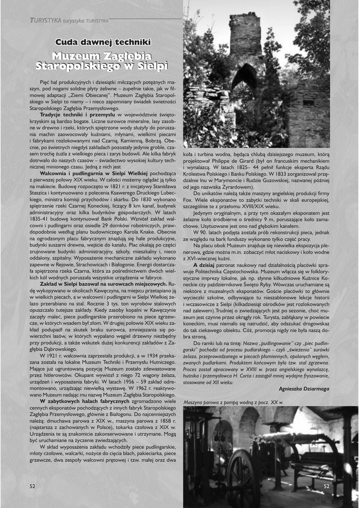 TURYSTYKA turystyka TURYSTYKA Cuda dawnej Cuda dawnej techniki techniki Muzeum Zag³êbia Staropolskiego w Sielpi Piêæ hal produkcyjnych i dziesi¹tki milcz¹cych potê¿nych maszyn, pod nogami solidne p³yty ¿eliwne – zupe³nie takie, jak w filmowej adaptacji „Ziemi Obiecanej”. Muzeum Zag³êbia Staropolskiego w Sielpi to niemy – i nieco zapomniany œwiadek œwietnoœci Staropolskiego Zag³êbia Przemys³owego. Tradycje techniki i przemys³u w województwie œwiêtokrzyskim s¹ bardzo bogate. Liczne surowce mineralne, lasy zasobne w drewno i rzeki, których spiêtrzone wody s³u¿y³y do poruszania machin zaowocowa³y kuŸniami, m³ynami, wielkimi piecami i fabrykami rozlokowanymi nad Czarn¹, Kamienn¹, Bobrz¹. Obecnie, po œwietnych niegdyœ zak³adach pozosta³y jedynie groble, czasem trochê ¿u¿la z wielkiego pieca i zarys budowli. Ale kilka fabryk dotrwa³o do naszych czasów – œwiadectwo wysokiej kultury technicznej minionego czasu. Jedn¹ z nich jest Walcownia i pudlingarnia w Sielpi Wielkiej pochodz¹ca z pierwszej po³owy XIX wieku. W ca³oœci mo¿emy ogl¹daæ j¹ tylko na makiecie. Budowê rozpoczêto w 1821 r. z inicjatywy Stanis³awa Staszica i kontynuowano z polecenia Ksawerego Druckiego Lubeckiego, ministra komisji przychodów i skarbu. Do 1830 wykonano spiêtrzenie rzeki Czarnej Koneckiej, licz¹cy 8 km kana³, budynek administracyjny oraz kilka budynków gospodarczych. W latach 1835-41 budowê kontynuowa³ Bank Polski. Wzniós³ zak³ad walcowni i pudlingarni oraz osiedle 29 domków robotniczych, prawdopodobnie wed³ug planu budowniczego Karola Knake. Obecnie na ogrodzonym placu fabrycznym znajduj¹ siê hale produkcyjne, budynki suszarni drewna, wejœcie do kana³u. Plac okalaj¹ po czêœci zrujnowane budynki: administracyjny, szko³y, mieszkalny i, nieco oddalony, szpitalny. Wyposa¿enie mechaniczne zak³adu wykonano zapewne w Rejowie, Strachowicach i Bia³ogonie. Energii dostarcza³a spiêtrzona rzeka Czarna, która za poœrednictwem dwóch wielkich kó³ wodnych porusza³a wszystkie urz¹dzenia w fabryce. Zak³ad w Sielpi bazowa³ na surowcach miejscowych. Rudê wykopywano w okolicach Kawêczyna, na miejscu przetapiano j¹ w wielkich piecach, a w walcowni i pudlingarni w Sielpi Wielkiej ¿elazo przerabiano na stal. Rocznie 3 tys. ton wyrobów stalowych opuszcza³o tutejsze zak³ady. Kiedy zasoby kopalni w Kawêczynie zaczê³y maleæ, piece pudlingarskie przerobiono na piece zgrzewcze, w których wsadem by³ z³om. W drugiej po³owie XIX wieku zak³ad podupad³ na skutek braku surowca, zmniejszania siê powierzchni lasów, w których wypalano wêgiel drzewny niezbêdny przy produkcji, a tak¿e wskutek du¿ej konkurencji zak³adów z Zag³êbia D¹browskiego. W 1921 r. walcownia zaprzesta³a produkcji, a w 1934 przekazana zosta³a na lokalne Muzeum Techniki i Przemys³u Hutniczego. Maj¹ce ju¿ ugruntowan¹ pozycjê Muzeum zosta³o zdewastowane przez hitlerowców. Okupant wywióz³ z niego 72 wagony ¿elaza, urz¹dzeñ i wyposa¿enia fabryki. W latach 1956 – 59 zak³ad odremontowano, urz¹dzaj¹c niewielk¹ wystawê. W 1962 r. reaktywowano Muzeum nadaj¹c mu nazwê Muzeum Zag³êbia Staropolskiego. W zabytkowych halach fabrycznych zgromadzono wiele cennych eksponatów pochodz¹cych z innych fabryk Staropolskiego Zag³êbia Przemys³owego, g³ównie z Bia³ogonu. Do najcenniejszych nale¿¹: dmuchawa parowa z XIX w., maszyna parowa z 1858 r. (najstarsza z zachowanych w Polsce), tokarka czo³owa z XIX w. Urz¹dzenia te s¹ znakomicie zakonserwowane i utrzymane. Mog¹ byæ uruchamiane na ¿yczenie zwiedzaj¹cych. W sk³ad wyposa¿enia zak³adu wchodzi³y piece pudlingarskie, m³oty czo³owe, walcarki, no¿yce do ciêcia blach, pakieciarka, piece grzewcze, dwa zespo³y walcowni prêtowej i tzw. ma³ej oraz dwa 52 ko³a i turbina wodna, bêd¹ca chlub¹ dzisiejszego muzeum, któr¹ projektowa³ Philippe de Girard (by³ on francuskim mechanikiem i wynalazc¹. W latach 1825– 44 pe³ni³ funkcje eksperta Rz¹du Królestwa Polskiego i Banku Polskiego. W 1833 zorganizowa³ przêdzalnie lnu w Marymoncie i Rudzie Guzowskiej, nazwanej póŸniej od jego nazwiska ¯yrardowem). Do unikatów nale¿¹ tak¿e maszyny angielskiej produkcji firmy Fox. Wiele eksponatów to zabytki techniki w skali europejskiej, szczególnie te z prze³omu XVIII/XIX wieku. Jedynym oryginalnym, a przy tym okaza³ym eksponatem jest ¿elazne ko³o œródbierne o œrednicy 9 m, poruszaj¹ce ko³o zamachowe. Usytuowane jest ono nad g³êbokim kana³em. W 90. latach podjêta zosta³a prób rekonstrukcji pieca, jednak ze wzglêdu na bark funduszy wykonano tylko czêœæ pracy. Na placu obok Muzeum znajduje siê niewielka ekspozycja plenerowa, gdzie mo¿na m.in. zobaczyæ m³ot naciskowy i ko³o wodne z XVI-wiecznej kuŸni. A dzisiaj patronat naukowy nad dzia³alnoœci¹ placówki sprawuje Politechnika Czêstochowska. Muzeum w³¹cza siê w folklorystyczne imprezy lokalne, jak np. s³ynne kilkudniowe KuŸnice Koneckie czy paŸdziernikowe Œwiêto Ryby. Wówczas uruchamiane s¹ niektóre z muzealnych eksponatów. Goœcie placówki to g³ównie wycieczki szkolne, odbywaj¹ce tu nieszablonowe lekcje historii i wczasowicze z Sielpi (kilkadziesi¹t oœrodków jest rozlokowanych nad zalewem).Trudniej o zwiedzaj¹cych jest po sezonie, choæ muzeum jest czynne przez okr¹g³y rok. Turysta, zab³¹kany w powiecie koneckim, musi niema³o siê natrudziæ, aby odszukaæ drogowskaz do tak ciekawego obiektu. Có¿, promocja nigdy nie by³a nasz¹ dobra stron¹. Do ramki lub na tintê: Nazwa „pudlingowanie” czy „piec pudlingarski” pochodzi od procesu pudlarskiego - czyli „œwie¿enia” surówki ¿elaza, przeprowadzanego w piecach p³omiennych, opalanych wêglem, zwanych pudlarkami. Produktem koñcowym by³a tzw. stal zgrzewna. Proces zosta³ opracowany w XVIII w. przez angielskiego wynalazcê, hutnika i przemys³owca H. Corta i zast¹pi³ mniej wydajne fryszowanie, stosowane od XII wieku. Agnies