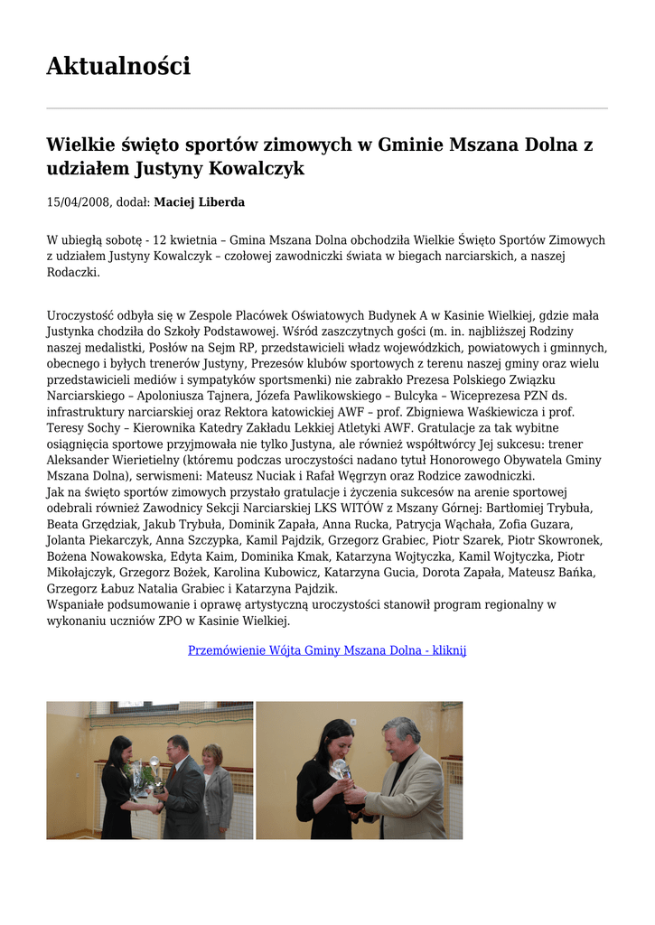 Aktualności Wielkie święto sportów zimowych w Gminie Mszana Dolna z udziałem Justyny Kowalczyk 15/04/2008, dodał: Maciej Liberda W ubiegłą sobotę - 12 kwietnia – Gmina Mszana Dolna obchodziła Wielkie Święto Sportów Zimowych z udziałem Justyny Kowalczyk – czołowej zawodniczki świata w biegach narciarskich, a naszej Rodaczki. Uroczystość odbyła się w Zespole Placówek Oświatowych Budynek A w Kasinie Wielkiej, gdzie mała Justynka chodziła do Szkoły Podstawowej. Wśród zaszczytnych gości (m. in. najbliższej Rodziny naszej medalistki, Posłów na Sejm RP, przedstawicieli władz wojewódzkich, powiatowych i gminnych, obecnego i byłych trenerów Justyny, Prezesów klubów sportowych z terenu naszej gminy oraz wielu przedstawicieli mediów i sympatyków sportsmenki) nie zabrakło Prezesa Polskiego Związku Narciarskiego – Apoloniusza Tajnera, Józefa Pawlikowskiego – Bulcyka – Wiceprezesa PZN ds. infrastruktury narciarskiej oraz Rektora katowickiej AWF – prof. Zbigniewa Waśkiewicza i prof. Teresy Sochy – Kierownika Katedry Zakładu Lekkiej Atletyki AWF. Gratulacje za tak wybitne osiągnięcia sportowe przyjmowała nie tylko Justyna, ale również współtwórcy Jej sukcesu: trener Aleksander Wierietielny (któremu podczas uroczystości nadano tytuł Honorowego Obywatela Gminy Mszana Dolna), serwismeni: Mateusz Nuciak i Rafał Węgrzyn oraz Rodzice zawodniczki. Jak na święto sportów zimowych przystało gratulacje i życzenia sukcesów na arenie sportowej odebrali również Zawodnicy Sekcji Narciarskiej LKS WITÓW z Mszany Górnej: Bartłomiej Trybuła, Beata Grzędziak, Jakub Trybuła, Dominik Zapała, Anna Rucka, Patrycja Wąchała, Zofia Guzara, Jolanta Piekarczyk, Anna Szczypka, Kamil Pajdzik, Grzegorz Grabiec, Piotr Szarek, Piotr Skowronek, Bożena Nowakowska, Edyta Kaim, Dominika Kmak, Katarzyna Wojtyczka, Kamil Wojtyczka, Piotr Mikołajczyk, Grzegorz Bożek, Karolina Kubowicz, Katarzyna Gucia, Dorota Zapała, Mateusz Bańka, Grzegorz Łabuz Natalia Grabiec i Katarzyna Pajdzik. Wspaniałe podsumowanie i oprawę artystyczną uroczystości stanowił program regionalny w wykonaniu uczniów ZPO w Kasinie Wielkiej. Przemówienie Wójta Gminy Mszana Dolna - kliknij więcej w galerii