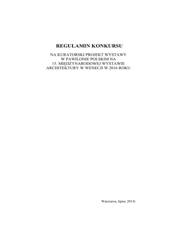 REGULAMIN KONKURSU NA KURATORSKI PROJEKT WYSTAWY W PAWILONIE POLSKIM NA 15. MIĘDZYNARODOWEJ WYSTAWIE ARCHITEKTURY W WENECJI W 2016 ROKU Warszawa, lipiec 2015r. ORGANIZATOR Zachęta – Narodowa Galeria Sztuki. CEL KONKURSU Wyłonienie kuratorskiego projektu wystawy, do realizacji w Pawilonie Polskim, prezentowanej w ramach 15. Międzynarodowej Wystawy Architektury w Wenecji w 2016 roku, której kuratorem generalnym jest Alejandro Aravena. Częścią projektu jest również określenie autorskiego tematu przewodniego wystawy wraz z jego uzasadnieniem. Projekt powinien poruszać zagadnienia istotne dla współczesnej sytuacji architektury, zarówno w wymiarze lokalnym (polskim), jak i globalnym. O BIENNALE Międzynarodowa Wystawa Architektury w Wenecji jest największą imprezą na świecie związaną z zagadnieniami architektonicznymi. Organizowana przez Fundację La Biennale di Venezia, odbywa się cyklicznie od 1980 roku, na przemian z Biennale Sztuki i tak jak Biennale Sztuki składa się z wystawy międzynarodowej, przygotowywanej przez kuratora zaproszonego przez Fundację, oraz z wystaw w pawilonach narodowych; całość dopełniają wydarzenia towarzyszące (collateral events). Biennale Architektury nie jest wystawą stricte architektoniczną — tematy główne wystawy, proponowane przez kuratorów generalnych, mają często wymiar ogólny, zawierają wiele wątków i odnoszą się do szeroko pojętych zagadnień związanych z urbanistyką, społeczeństwem, modernizmem, kondycją człowieka w świecie współczesnym itp. W sytuacji, gdy w trakcie trwania konkursu Fundacja La Biennale di Venezia ogłosi temat główny wystawy biennale, Organizator zachęca uczestników konkursu do nawiązania do tego tematu w projekcie, nie jest to jednak warunek formalny. ZASADY KONKURSU 1. Konkurs jest otwarty. 2. Konkurs nie jest konkursem architektonicznym. 3. Uczestnictwo w konkursie oznacza zaakceptowanie przez biorącego w nim udział kuratora lub zespół kuratorski, zwany dalej „kuratorem”, wymienionych w regulaminie zasad i warunków. 4. Minister Kultury i Dziedzictwa Narodowego powołuje Jury konkursu, zwane dalej „Jury”. Obrady Jury odbywają się w języku polskim, a w przypadku, gdy powołany Juror jest obcokrajowcem, obrady są tłumaczone symultanicznie. 5. Jury dokonuje oceny formalnej i decyduje o dopuszczeniu do konkursu zgłoszonej dokumentacji poszczególnych projektów. 6. Wszystkie dopuszczone projekty zostają przedstawione i omówione przez Jury. 7. Głosowanie Jury jest tajne. W przypadku dużej liczby zgłoszeń głosowanie Jury na wniosek przewodniczącego może odbyć się dwuetapowo w głosowaniu tajnym. 2 8. Wygrywa projekt z najwyższą punktacją, jednak nie mniej niż z 3 głosami, zwany dalej „Projektem Wybranym”. Drugi w kolejności punktacji projekt pozostaje zachowany jako projekt rezerwowy, zwany dalej „Projektem Rezerwowym”. 9. Przewodniczący Jury otwiera kopertę zawierającą godło i odczytuje nazwisko zwycięzcy konkursu (Projekt Wybrany). Następnie odtajniane są pozostałe projekty. 10. Od werdyktu Jury nie ma odwołania. 11. Projekt Wybrany jest kierowany do akceptacji Ministra Kultury i Dziedzictwa Narodowego w celu przyjęcia projektu do realizacji w Pawilonie Polskim na 15. Międzynarodowej Wystawie Architektury w Wenecji w 2016 roku. 12. Organizator po akceptacji Projektu Wybranego przez Ministra Kultury i Dziedzictwa Narodowego zawrze z kuratorem projektu umowę. 13. Organizator może zwrócić się do kuratora Projektu Wybranego o dokonanie zmian w projekcie. 14. Udział w konkursie i jego wygrana zobowiązuje kuratora do podjęcia dalszych prac projektowych, zaakceptowania obowiązującego regulaminu 15. Międzynarodowej Wystawy Architektury w Wenecji oraz przestrzegania harmonogramu i współpracy z Organizatorem w celu terminowego otwarcia wystawy. 15. Projekt Rezerwowy pozostanie do dyspozycji Organizatora przez 3 miesiące, licząc od dnia decyzji Ministra Kultury i Dziedzictwa Narodowego w sprawie akceptacji Projektu Wybranego. 16. Organizator zastrzega sobie prawo wykorzystania Projektu Wybranego i jego tytułu do wszystkich celów identyfikacyjnych i reklamowych o nieograniczonym zasięgu terytorialnym. Identyczne prawo Organizator zastrzega sobie w przypadku, gdyby do realizacji przeznaczony został Projekt Rezerwowy. 17. Organizator z przyczyn obiektywnych (losowych) nie musi wdrażać Projektu Wybranego. Decyzja o niewdrażaniu projektu wymaga akceptacji Ministra Kultury i Dziedzictwa Narodowego. 18. W sytuacji, o której mowa w pkt 17, Minister Kultury i Dziedzictwa Narodowego może wskazać do realizacji Projekt Rezerwowy lub unieważnić konkurs. W przypadku decyzji o unieważnieniu konkursu zastosowanie znajduje procedura określona w pkt 19. 19. Minister Kultury i Dziedzictwa Narodowego może powołać kuratora na podstawie rekomendacji Komisarza Pawilonu Polskiego. Procedura ta ma zastosowanie w przypadku niewyłonienia przez Jury Projektu Wybranego (czyli w sytuacji gdy wszystkie dopuszczone projekty otrzymują zero głosów w drodze tajnego głosowania, bądź gdy najwyższa punktacja projektu jest mniejsza niż 3 głosy), w sytuacji unieważnienia konkursu oraz w sytuacji niemożności realizacji Projektu Wybranego, o której mowa w pkt 17 i przy jednoczesnym braku Projektu Rezerwowego, o którym mowa w pkt 20. 20. Projekt Wybrany może być realizowany w sytuacji braku Projektu Rezerwowego, to znaczy, gdy wszystkie pozostałe dopuszczone projekty otrzymają zero głosów w drodze tajnego głosowania. 21. Organizator nie uwzględni w konkursie projektów, które wpłyną po terminie, według zasad określonych w pkt 5 rozdziału „Warunki Formalne” niniejszego regulaminu. 22. O wyniku konkursu Organizator poinformuje na swojej stronie internetowej www.zacheta.art.pl po akceptacji werdyktu Jury przez Ministra Kultury i Dziedzictwa Narodowego. Na stronie Organizatora zamieszczone zostanie końcowe oświadc