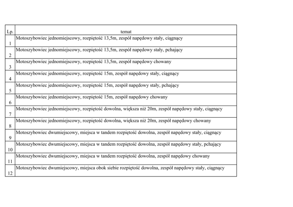 Lp. temat Motoszybowiec jednomiejscowy, rozpiętość 13,5m, zespół napędowy stały, ciągnący 1 Motoszybowiec jednomiejscowy, rozpiętość 13,5m, zespół napędowy stały, pchający 2 Motoszybowiec jednomiejscowy, rozpiętość 13,5m, zespół napędowy chowany 3 Motoszybowiec jednomiejscowy, rozpiętość 15m, zespół napędowy stały, ciągnący 4 Motoszybowiec jednomiejscowy, rozpiętość 15m, zespół napędowy stały, pchający 5 Motoszybowiec jednomiejscowy, rozpiętość 15m, zespół napędowy chowany 6 Motoszybowiec jednomiejscowy, rozpiętość dowolna, większa niż 20m, zespół napędowy stały, ciągnący 7 Motoszybowiec jednomiejscowy, rozpiętość dowolna, większa niż 20m, zespół napędowy chowany 8 Motoszybowiec dwumiejscowy, miejsca w tandem rozpiętość dowolna, zespół napędowy stały, ciągnący 9 Motoszybowiec dwumiejscowy, miejsca w tandem rozpiętość dowolna, zespół napędowy stały, pchający 10 Motoszybowiec dwumiejscowy, miejsca w tandem rozpiętość dowolna, zespół napędowy chowany 11 Motoszybowiec dwumiejscowy, miejsca obok siebie rozpiętość dowolna, zespół napędowy stały, ciągnący 12 Motoszybowiec dwumiejscowy, miejsca obok siebie rozpiętość dowolna, zespół napędowy stały, pchający 13 Motoszybowiec dwumiejscowy, miejsca obok siebie rozpiętość dowolna, zespół napędowy chowany 14 Samolot ultralekki jednomiejscowy, górnopłat 15 Samolot ultralekki jednomiejscowy, dolnopłat 16 Samolot ultralekki dwumiejscowy, miejsca obok siebie, górnopłat 17 Samolot ultralekki dwumiejscowy, miejsca w tandem, dolnopłat 18 Samolot ultralekki dwumiejscowy, miejsca w tandem, dolnopłat 19 Jednomiejscowy odrzutowy samolot rekreacyjny 20 Dwumiejscowy odrzutowy samolot rekreacyjny, miejsca obok siebie 21 Dwumiejscowy odrzutowy samolot rekreacyjny, miejsca w tandem 22 Samolot wyścigowy, jednomiejscowy, formuły 1 (regulamin na stronie www.airrace.org/indexJS.php) 23 Samolot wyścigowy , jednomiejscowy, bez ograniczeń -||- Samolot wyścigowy, dwumiejscowy klasy Sport, miejsca w tandem, -||- 24 25 Samolot wyścigowy, dwumiejscowy klasy Sport, miejsca obok siebie, -||- 26 Samolot wyścigowo – akrobacyjny, jednomiejscowy (do zawodów Red Bull) 27 Samolot akrobacyjny, jednomiejscowy 28 Samolot akrobacyjny dwumiejscowy 29 Samolot klubowy, 6-miejscowy (5spadochroniarzy), STOL, holowanie szybowców 30 Samolot do holowania szybowców (1 miejscowy) 31 Samolot szkolny, dwumiejscowy, miejsca w tandem, moc silnika do 100 kW 32 Samolot szkolny, dwumiejscowy, miejsca obok siebie, moc silnika do 100 kW 33 Samolot szkolno-treningowy, dwumiejscowy, miejsca w tandem, moc silnika do 200 kW 34 Samolot szkolno-treningowy, dwumiejscowy, miejsca obok siebie, moc silnika do 200 kW 35 Samolot szkolno-treningowy, dwumiejscowy, miejsca w tandem, napęd śmigłowy, moc b/o 36 Samolot szkolno-treningowy, dwumiejscowy, miejsca w tandem, napęd odrzutowy (1 silnik) 37 Samolot szkolno-treningowy, dwumiejscowy, miejsca w tandem, napęd odrzutowy (2 silniki) 38 Samolot dwumiejscowy do dalekiej turystyki 39 Samolot czteromiejscowy do dalekiej turystyki, jednosilnikowy, napęd tłokowy 40 Samolot dwumiejscowy STOL 41 Samolot czteromiejscowy STOL, jednosilnikowy 42 Samolot medyczny (pilot, lekarz, 1 leżący chory), STOL, jednosilnikowy 43 Samolot medyczny (pilot, lekarz, 1 leżący chory), dwusilnikowy 44 Samolot dyspozycyjny, 4-miejscowy, dwusilnikowy, napęd tłokowy, zasięg do 500km 45 Samolot dyspozycyjny, 4-miejscowy, dwusilnikowy, napęd tłokowy, zasięg do 1000km 46 Samolot dyspozycyjny, 4-miejscowy, napęd turbośmigłowy, zasięg do 500km 47 Samolot dyspozycyjny, 4-miejscowy, napęd turbośmigłowy, zasięg do 1000km 48 Samolot dyspozycyjny, 4-miejscowy, napęd odrzutowy, zasięg do 500km 49 Samolot dyspozycyjny, 4-miejscowy, napęd odrzutowy, zasięg do 1000km 50 Samolot dyspozycyjny, 6-miejscowy, dwusilnikowy, napęd tłokowy, zasięg do 500km 51 Samolot dyspozycyjny, 6-miejscowy, dwusilnikowy, napęd tłokowy, zasięg do 1000km 52 Samolot dyspozycyjny, 6-miejscowy, napęd odrzutowy, zasięg do 500km 53 Samolot dyspozycyjny, 6-miejscowy, napęd odrzutowy, zasięg do 1000km 54 Samolot dyspozycyjny, 8-miejscowy, napęd tłokowy, zasięg do 1000km 55 Samolot dyspozycyjny, 8-miejscowy, napęd turbośmigłowy, zasięg do 1000km 56 Samolot dyspozycyjny, 8-miejscowy, napęd odrzutowy, zasięg do 500km 57 Samolot dyspozycyjny, 8-miejscowy, napęd odrzutowy, zasięg do 1000km 58 Samolot dyspozycyjny, 10-miejscowy, napęd turbośmigłowy, zasięg do 1000km 59 Samolot dyspozycyjny, 10-miejscowy, napęd turbośmigłowy, zasięg do 1500km 60 Samolot dyspozycyjny, 10-miejscowy, napęd odrzutowy 61 Samolot dyspozycyjny, 15-miejscowy, napęd turbośmigłowy, zasięg do 2000km 62 Samolot dyspozycyjny, 15-miejscowy, napęd turbośmigłowy, zasięg do 3000km 63 Samolot dyspozycyjny, 15-miejscowy, napęd odrzutowy, zasięg do 2000km 64 Samolot dyspozycyjny, 20-miejscowy, napęd turbośmigłowy, zasięg do 3000km 65 Samolot transportowy, STOL, ładunek użyteczny 1300kg (kontener LD-2) 66 Samolot transportowy, STOL, ładunek użyteczny 1800kg (kontener LD-3) 67 Samolot transportowy, STOL, ładunek użyteczny 2300kg (Honker), z rampą z tyłu kadłuba 68 Samolot transportowy, STOL, ładunek użyteczny 5500kg (Honker+LD-4), z rampą z tyłu kadłuba 69 Samolot transportowy, STOL, ładunek użyteczny 11000kg (BRDM2+2*LD-4), z rampą z tyłu kadłuba 70 Samolot transportowy, STOL, ładunek użyteczny 23000kg (BWP-1 lub Rosomak), z rampą z tyłu kadłuba 71 Samolot transportowy, ładunek użyteczny 5500kg (Honker+LD-4), z rampą z tyłu kadłuba 72 Samolot transportowy, ładunek użyteczny 11000kg (BRDM2+2*LD-4), z rampą z tyłu kadłuba 73 Samolot transportowy, ładunek użyteczny 23000kg (BWP-1 lub Rosomak), z rampą z tyłu kadłuba 74 Samolot pasażerski 40 miejscowy, turbośmigłowy, dolnopłatowy 75 Samolot pasażerski 40 miejscowy, turbośmigłowy, górnopłatowy 76 Sam