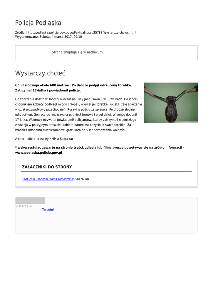 Policja Podlaska Źródło: http://podlaska.policja.gov.pl/pod/aktualnosci/25788,Wystarczy-chciec.html Wygenerowano: Sobota, 4 marca 2017, 00:10 Strona znajduje się w archiwum. Wystarczy chcieć Gonił złodzieja około 600 metrów. Po drodze podjął odrzuconą torebkę. Zatrzymał 17-latka i powiadomił policję. Do zdarzenia doszło w sobotni wieczór na ulicy Jana Pawła II w Suwałkach. Do idącej chodnikiem kobiety podbiegł młody chłopak, wyrwał jej torebkę i uciekł. Całe zdarzenie widział przypadkowy przechodzień. Ruszył w pościg za sprawcą. Po drodze złodziej odrzucił łup. Goniący go mężczyzna podniósł torebkę i biegł dalej. W końcu dogonił 17-latka. Wzorowy obywatel powiadomił policjantów, którzy zatrzymali niedoszłego złodzieja w policyjnym areszcie. Kobieta natomiast odzyskała swoją torebkę. Za kradzież młodemu suwalczaninowi grozi kara do 5 lat pozbawienia wolności. źródło – oficer prasowy KMP w Suwałkach * wykorzystując zawarte na stronie treści, zdjęcia lub filmy proszę powoływać się na źródło informacji – www.podlaska.policja.gov.pl ZAŁĄCZNIKI DO STRONY Posłuchaj - podkom. Kamil Tomaszczuk 504.92 KB Ocena: 0/5 (0) Tweetnij