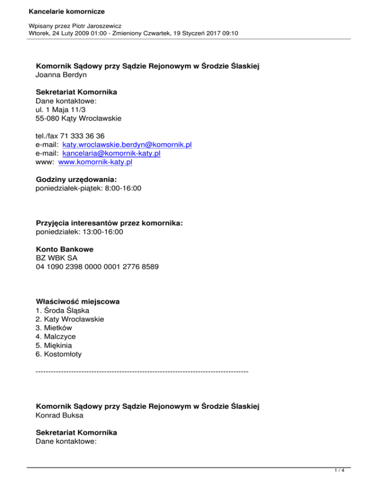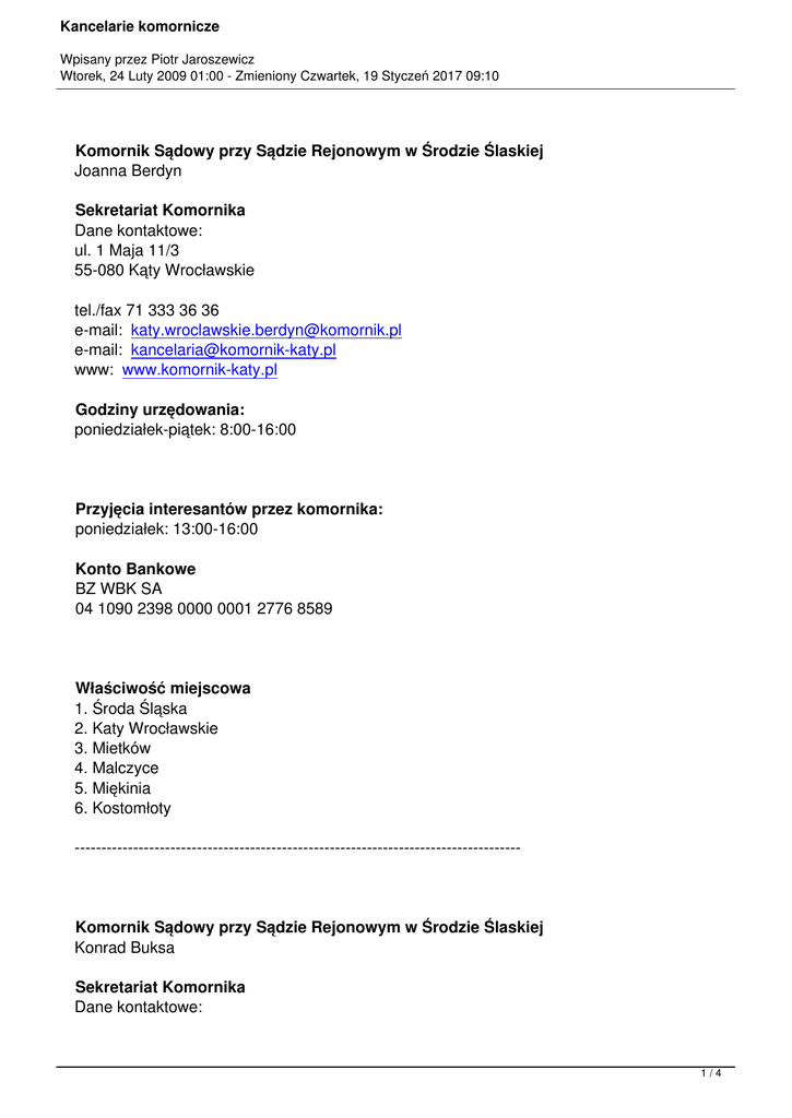 Kancelarie komornicze Wpisany przez Piotr Jaroszewicz Wtorek, 24 Luty 2009 01:00 - Zmieniony Czwartek, 19 Styczeń 2017 09:10 Komornik Sądowy przy Sądzie Rejonowym w Środzie Ślaskiej Joanna Berdyn Sekretariat Komornika Dane kontaktowe: ul. 1 Maja 11/3 55-080 Kąty Wrocławskie tel./fax 71 333 36 36 e-mail: [email protected] e-mail: [email protected] www: www.komornik-katy.pl Godziny urzędowania: poniedziałek-piątek: 8:00-16:00 Przyjęcia interesantów przez komornika: poniedziałek: 13:00-16:00 Konto Bankowe BZ WBK SA 04 1090 2398 0000 0001 2776 8589 Właściwość miejscowa 1. Środa Śląska 2. Katy Wrocławskie 3. Mietków 4. Malczyce 5. Miękinia 6. Kostomłoty ------------------------------------------------------------------------------------ Komornik Sądowy przy Sądzie Rejonowym w Środzie Ślaskiej Konrad Buksa Sekretariat Komornika Dane kontaktowe: 1/4 Kancelarie komornicze Wpisany przez Piotr Jaroszewicz Wtorek, 24 Luty 2009 01:00 - Zmieniony Czwartek, 19 Styczeń 2017 09:10 ul. Mostowa 12/1 55-300 Środa Śląska tel./fax. 71 769 14 29 e-mail: [email protected] Godziny urzędowania: Kancelaria czynna od pon. do pt. w godz. 7:30 - 15:30 Przyjęcia interesantów przez komornika: Komornik przyjmuje osobiście w czwartki. Konto Bankowe Bank Zachodni WBK SA 1 O. w Środzie Śląskiej 08 10902444 0000 0001 3334 3553 Właściwość miejscowa 1. Środa Śląska 2. Katy Wrocławskie 3. Mietków 4. Malczyce 5. Miękinia 6. Kostomłoty -----------------------------------------------------------------------------------Komornik Sądowy przy Sądzie Rejonowym w Środzie Ślaskiej Artur Karamon Sekretariat Komornika Dane kontaktowe ul. Świdnicka 15-3 55-300 Środa Śląska tel./fax. 71 314 75 79 e-mail: [email protected] Właściwość miejscowa 1. Środa Śląska 2/4 Kancelarie komornicze Wpisany przez Piotr Jaroszewicz Wtorek, 24 Luty 2009 01:00 - Zmieniony Czwartek, 19 Styczeń 2017 09:10 2. Katy Wrocławskie 3. Mietków 4. Malczyce 5. Miękinia 6. Kostomłoty -----------------------------------------------------------------------------------Komornik Sądowy przy Sądzie Rejonowym w Środzie Śląskiej Albert Masternak Sekretariat Komornika Dane kontaktowe ul. Legnicka 24B/3 55 - 300 Środa Śląska piętro I tel. (071) 3172612 i 3175858 fax (071) 3172612 e-mail: [email protected] Godziny pracy 7.30-15.30 Właściwość miejscowa 1. Środa Śląska 2. Katy Wrocławskie 3. Mietków 4. Malczyce 5. Miękinia 6. Kostomłoty Konto Bankowe Bank Zachodni WBK Środa Śląska 20109024440000000618000054 ----------------------------------------------------------------------------------------------------------------------------------------------------------------------Komornik Sądowy przy Sądzie Rejonowym w Środzie Ślaskiej Andrzej Pokora Sekretariat Komornika Dane kontaktowe: ul. Bolesława Karnasa 2/1 55-300 Środa Śląska tel./fax 71 396 67 29 3/4 Kancelarie komornicze Wpisany przez Piotr Jaroszewicz Wtorek, 24 Luty 2009 01:00 - Zmieniony Czwartek, 19 Styczeń 2017 09:10 e-mail: [email protected] Godziny pracy 7:30-15:30 Przyjmuje osobiście strony: wtorek od 11:00-15:00 Konto Bankowe PKO Bank Polski SA Środa Śląska 21 1020 5242 0000 2502 0261 9229 Właściwość miejscowa 1. Środa Śląska 2. Katy Wrocławskie 3. Mietków 4. Malczyce 5. Miękinia 6. Kostomłoty ------------------------------------------------------------------------------------ 4/4