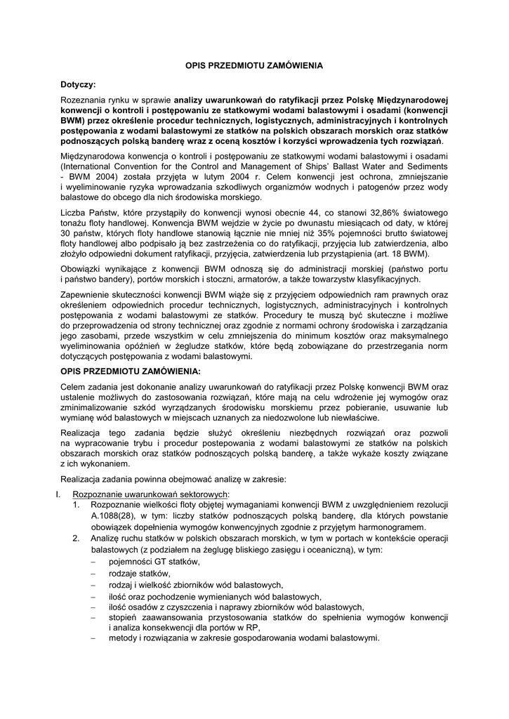 OPIS PRZEDMIOTU ZAMÓWIENIA Dotyczy: Rozeznania rynku w sprawie analizy uwarunkowań do ratyfikacji przez Polskę Międzynarodowej konwencji o kontroli i postępowaniu ze statkowymi wodami balastowymi i osadami (konwencji BWM) przez określenie procedur technicznych, logistycznych, administracyjnych i kontrolnych postępowania z wodami balastowymi ze statków na polskich obszarach morskich oraz statków podnoszących polską banderę wraz z oceną kosztów i korzyści wprowadzenia tych rozwiązań. Międzynarodowa konwencja o kontroli i postępowaniu ze statkowymi wodami balastowymi i osadami (International Convention for the Control and Management of Ships’ Ballast Water and Sediments - BWM 2004) została przyjęta w lutym 2004 r. Celem konwencji jest ochrona, zmniejszanie i wyeliminowanie ryzyka wprowadzania szkodliwych organizmów wodnych i patogenów przez wody balastowe do obcego dla nich środowiska morskiego. Liczba Państw, które przystąpiły do konwencji wynosi obecnie 44, co stanowi 32,86% światowego tonażu floty handlowej. Konwencja BWM wejdzie w życie po dwunastu miesiącach od daty, w której 30 państw, których floty handlowe stanowią łącznie nie mniej niż 35% pojemności brutto światowej floty handlowej albo podpisało ją bez zastrzeżenia co do ratyfikacji, przyjęcia lub zatwierdzenia, albo złożyło odpowiedni dokument ratyfikacji, przyjęcia, zatwierdzenia lub przystąpienia (art. 18 BWM). Obowiązki wynikające z konwencji BWM odnoszą się do administracji morskiej (państwo portu i państwo bandery), portów morskich i stoczni, armatorów, a także towarzystw klasyfikacyjnych. Zapewnienie skuteczności konwencji BWM wiąże się z przyjęciem odpowiednich ram prawnych oraz określeniem odpowiednich procedur technicznych, logistycznych, administracyjnych i kontrolnych postępowania z wodami balastowymi ze statków. Procedury te muszą być skuteczne i możliwe do przeprowadzenia od strony technicznej oraz zgodnie z normami ochrony środowiska i zarządzania jego zasobami, przede wszystkim w celu zmniejszenia do minimum kosztów oraz maksymalnego wyeliminowania opóźnień w żegludze statków, które będą zobowiązane do przestrzegania norm dotyczących postępowania z wodami balastowymi. OPIS PRZEDMIOTU ZAMÓWIENIA: Celem zadania jest dokonanie analizy uwarunkowań do ratyfikacji przez Polskę konwencji BWM oraz ustalenie możliwych do zastosowania rozwiązań, które mają na celu wdrożenie jej wymogów oraz zminimalizowanie szkód wyrządzanych środowisku morskiemu przez pobieranie, usuwanie lub wymianę wód balastowych w miejscach uznanych za niedozwolone lub niewłaściwe. Realizacja tego zadania będzie służyć określeniu niezbędnych rozwiązań oraz pozwoli na wypracowanie trybu i procedur postepowania z wodami balastowymi ze statków na polskich obszarach morskich oraz statków podnoszących polską banderę, a także wykaże koszty związane z ich wykonaniem. Realizacja zadania powinna obejmować analizę w zakresie: I. Rozpoznanie uwarunkowań sektorowych: 1. Rozpoznanie wielkości floty objętej wymaganiami konwencji BWM z uwzględnieniem rezolucji A.1088(28), w tym: liczby statków podnoszących polską banderę, dla których powstanie obowiązek dopełnienia wymogów konwencyjnych zgodnie z przyjętym harmonogramem. 2. Analizę ruchu statków w polskich obszarach morskich, w tym w portach w kontekście operacji balastowych (z podziałem na żeglugę bliskiego zasięgu i oceaniczną), w tym: pojemności GT statków, rodzaje statków, rodzaj i wielkość zbiorników wód balastowych, ilość oraz pochodzenie wymienianych wód balastowych, ilość osadów z czyszczenia i naprawy zbiorników wód balastowych, stopień zaawansowania przystosowania statków do spełnienia wymogów konwencji i analiza konsekwencji dla portów w RP, metody i rozwiązania w zakresie gospodarowania wodami balastowymi. 3. Przegląd zakładów, w których odbywa się czyszczenie i naprawa zbiorników wód balastowych ze statków: przegląd dostępnych urządzeń do odbioru osadów, sposób przekazywania osadów ze zbiorników wód balastowych ze statków, zasady klasyfikacji odebranego osadu; kod odpadu; z określeniem składu chemicznego, biologicznego oraz właściwości fizycznych, sposób gospodarowania tymi osadami, zgodnie z obowiązującym prawodawstwem w zakresie gospodarowania odpadami, metody i rozwiązania w zakresie gospodarowania osadami ze zbiorników balastowych stosowane w innych państwach europejskich. 4. Analiza przyszłego zapotrzebowania wśród armatorów na zdawanie osadów oraz wód balastowych do urządzeń odbiorczych w polskich portach i stoczniach. 5. Przewidywane zapotrzebowanie na zwolnienia wydawane na podstawie prawidła A-3 i A-4 konwencji BWM wśród armatorów zawijających do polskich portów. 6. Analiza doświadczeń innych państw w zakresie inspekcjonowania statków w zakresie postępowania z wodami balastowymi. 7. Przegląd dostępności akredytowanych laboratoriów do badania wód balastowych, w tym przegląd uwarunkowań dla akredytacji nowych laboratoriów. II. Zagadnienia środowiskowe: 1. Wskazanie szczególnie wrażliwych oraz chronionych ekosystemów położonych w polskich obszarach morskich. 2. Wskazanie stref, w których wody balastowe będą mogły być zgodnie z konwencją BWM pobierane i/lub zrzucane w sposób bezpieczny dla środowiska, przed zawinięciem do portów polskich. 3. Analiza wymagań konwencji BWM w świetle innych obowiązujących już wymogów w zakresie ochrony środowiska związanych z zapobieganiem introdukcji gatunków obcych. III. Procedury postępowania z wodami balastowymi i osadami ze statków zgodnie z wymogami konwencji BWM: 1. Przewidywania w zakresie konieczności modernizacji lub instalowania na statkach podnoszących polską banderę systemów obróbki wód balastowych, spełniających wymogi konwencji BWM wraz z analizą dostępności na rynku tych systemów. 2. Potrzeba dostos
