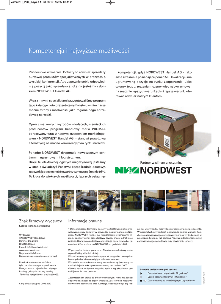 Vorsatz C_POL_Layout 1 23.08.12 15:35 Seite 2 Kompetencja i najwyższe możliwości Partnerstwo wzmacnia. Dotyczy to również sprzedaży i kompetencji, gdyż NORDWEST Handel AG - jako hurtowej produktów specjalistycznych w branżach o silne zrzeszenie posiadające ponad 500 lokalizacji - ma wysokiej konkurencji. Aby zapewnić sobie odpowied- ugruntowaną pozycję na rynku zaopatrzenia. Jako nią pozycję jako sprzedawca lokalny jesteśmy człon- członek tego zrzeszenia możemy więc nabywać towar kiem NORDWEST Handel AG. na znacznie lepszych warunkach - i lepsze warunki oferować również naszym klientom. Wraz z innymi specjalistami przygotowaliśmy program tego katalogu i oto prezentujemy Państwu w nim nasze mocne strony i możliwości jako regionalnego sprzedawcę narzędzi. Oprócz markowych wyrobów wiodących, niemieckich producentów program handlowy marki PROMAT, opracowany wraz z naszym zrzeszeniem marketingowym - NORDWEST Handel AG, - stanowi prawdziwą alternatywę na mocno konkurencyjnym rynku narzędzi. Ponadto NORDWEST dysponuje nowoczesnym centrum magazynowym i logistycznym. Dzięki tej efektywnej logistyce magazynowej jesteśmy Partner w silnym zrzeszeniu. w stanie świadczyć Państwu bezpośrednie dostawy, zapewniając dostępność towarów wynoszącą średnio 98%. To klucz do większych możliwości, lepszych osiągnięć Znak firmowy wydawcy Informacje prawne Katalog Technika narzędziowa Przedruk – również w skrócie – tylko za pisemną zgodą producenta. Uwaga: wraz z pojawieniem się tego katalogu, dotychczasowy katalog "Technika narzędziowa" traci ważność. Ceny obowiązują od 01.09.2012 W przypadku dostaw poza teren Niemiec czas dostawy może wynosić 48 godzin lub dłużej. Wszystkie ceny są niezobowiązujące. W przypadku cen wydrukowanych chodzi o nie wiążące zalecenia cenowe. Wszystkie wzmiankowane ceny rozumiane są jako ceny za sztukę lub jednostkę opakowania netto, bez podatku VAT. Obowiązująca w danym wypadku opłata wg aktualnych cen stali jest obliczana osobno. Z zastrzeżeniem prawa do zmian technicznych. Firma nie ponosi odpowiedzialności za błędy wydruku, jak również nieprawidłowe dane techniczne oraz ilustracje. Ilustracje mogą się róż- nić np. w przypadku modyfikacji produktów przez producenta. W pozostałych przypadkach obowiązują ogólne warunki handlowe autoryzowanego sprzedawcy, które są wydrukowane w niniejszym katalogu lub zostaną Państwu udostępnione przez autoryzowanego sprzedawcę przy zawieraniu umowy. Symbole umieszczone pod cenami: Czas dostawy z reguły 48 - 72 godziny* Czas dostawy z reguły 2 - 3 tygodnie* + Czas dostawy po wcześniejszym uzgodnieniu wersja VK 10/12 Wydawca: ©NORDWEST Handel AG Berliner Str. 26-36 D-58135 Hagen E-mail: [email protected] www.nordwest.com Segment działalności Budownictwo - rzemiosło - przemysł * Dane dotyczące terminów dostawy są traktowane jako przewidywane czasy dostawy w przypadku dostaw na terenie Niemiec. NORDWEST Handel AG współpracuje z uznanymi firmami spedycyjnymi, czas dostawy towaru może jednak ulec zmianie. Dłuższe czasy dostawy obowiązują np. w przypadku zamówień, które wpłyną do NORDWEST po godzinie 16:00. Vorsatz C_POL_Layout 1 23.08.12 15:35 Seite 3 SPIS TREŚCI Zapraszamy do zapoznania się z paletą produktów... Vorsatz C_POL_Layout 1 23.08.12 15:35 Seite 4 Indeks haseł Obróbka skrawaniem Technika mocowania Technika pomiarowa Technika szlifowania Narzędzia ręczne Lutowanie i spawanie Wyposażenie warsztatu Produkty techniczne Wyposażenie zakładu Narzędzia budowlane, materiały druciane, narzędzia ogrodowe BHP Narzędzia elektryczne i pneumatyczne Indeks numerów artykułów a Vorsatz C_POL_Layout 1 23.08.12 15:35 Seite 5 A-Z Tutaj znajdują się wszystkie produkty w kolejności alfabetycznej frezy, narzędzia do gwintowania, wiertła kręte HSS + VHM, brzeszczoty, narzynki, zestawy pogłębiaczy, rozwiertaki, narzędzia z płytkami wieloostrzowymi uchwyty wiertarskie, przegub magnesowy, zaciski szybkomocujące, imaki nożowe do szybkiej zmiany, imadła, uchwyty na narzędzia VDI, uchwyty narzędziowe taśmy miernicze, mikrometry kabłąkowe, szczelinomierze, czujniki zegarowe, kątowniki precyzyjne, poziomice szczotki druciane, ściernice lamelkowe, pilniki, trzpienie frezarskie, krążki ścierne na rzep, wiertła koronowe, piły otworowe, papier ścierny, krążki ścierne, ściernice trzpieniowe, tarcze do zdzierania, tarcze do cięcia szczypce tnące, młotki, nitownice, multimetry, klucze, imadła, narzędzia do śrub, wkrętów i nakrętek, próbniki napięcia, klucze nasadowe / zestawy kluczy nasadowych, narzędzia do instalacji sani- tarnych i grzewczych, szczypce, piły spawarki gazowe (E, WIG, MIG/MAG), urządzenia do lutowania, lut, palniki spawalnicze i części zamienne, akcesoria dla spawaczy, materiały dodatkowe do spawania elektropisy, zwijadła na kable żarówki, kreda do znakowania, skrzynki asortymentowe, stoły warsztatowe, wózki warsztatowe, torby narzędziowe / walizki na narzędzia aerozole, maty na stanowiska robocze, armatury, masy uszczelniające, pneumatyka, smarownice, taśmy do podnoszenia, kleje, smary, lejki warsztatowe, pasy zabezpieczające ładuśrodki wiążące olej/środki wiążące chemikalia, oczysz- nek czacze, wózki na węże, wanny ociekowe, drukarki etykiet, podnośniki dźwigniowe, drabiny, pojemniki wielozadaniowe, regały, krzesła, pojemniki transportowe, szafki na narzędzia narzędzia dla glazurników, urządzenia ogrodowe, bramy ogrodowe / parkany ogrodowe, kielnie, narzędzia malarskie, młotki murarskie, pace do zacierania, młotki brukarskie do rozłupywania, szpadle, narzędzia do układania, wiadra i kubły ochrona oczu, ochrona stóp, ochrona słuchu, ochrona rąk, ochrona skóry, ochrona głowy, wyposażenie ochronne zabezpieczające przed upadkiem, ścierki czyszczące odzież ochronna, odzież ostrzegawcza, wyposażenie pralni piły taśmowe, narzęd