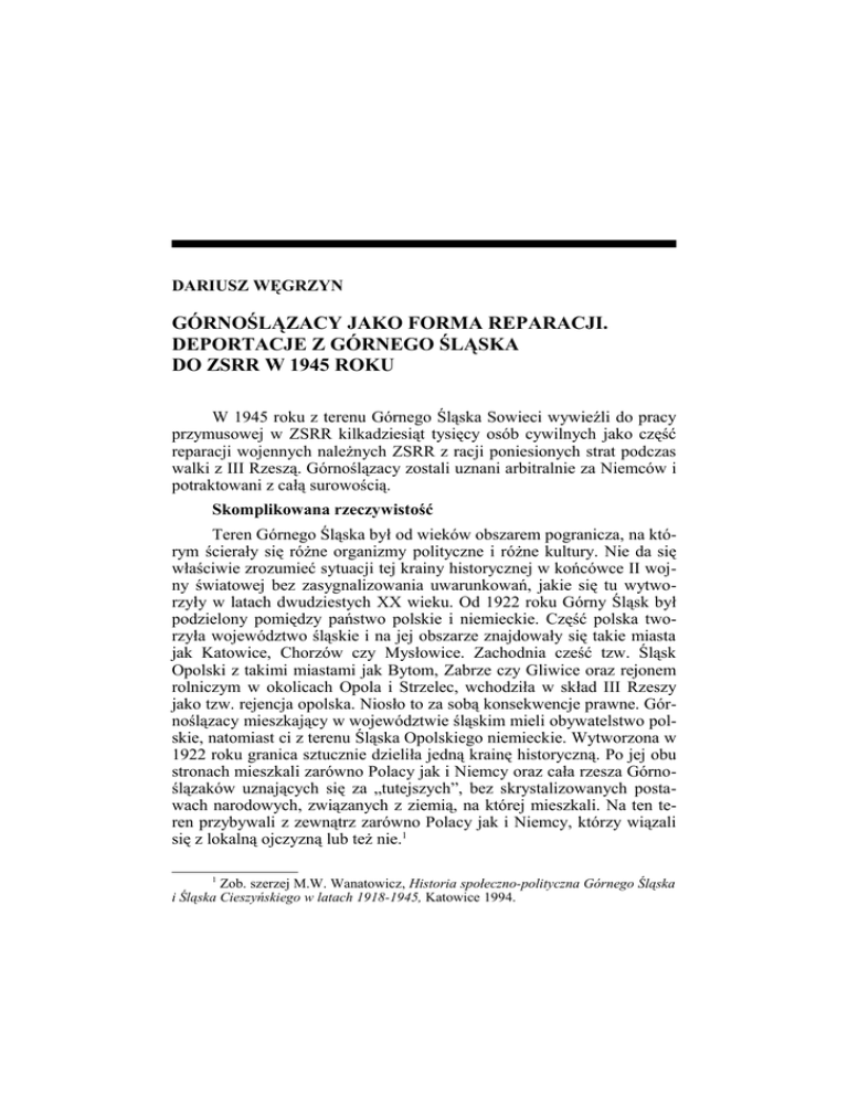 DARIUSZ WĘGRZYN GÓRNOŚLĄZACY JAKO FORMA REPARACJI. DEPORTACJE Z GÓRNEGO ŚLĄSKA DO ZSRR W 1945 ROKU W 1945 roku z terenu Górnego Śląska Sowieci wywieźli do pracy przymusowej w ZSRR kilkadziesiąt tysięcy osób cywilnych jako część reparacji wojennych należnych ZSRR z racji poniesionych strat podczas walki z III Rzeszą. Górnoślązacy zostali uznani arbitralnie za Niemców i potraktowani z całą surowością. Skomplikowana rzeczywistość Teren Górnego Śląska był od wieków obszarem pogranicza, na którym ścierały się różne organizmy polityczne i różne kultury. Nie da się właściwie zrozumieć sytuacji tej krainy historycznej w końcówce II wojny światowej bez zasygnalizowania uwarunkowań, jakie się tu wytworzyły w latach dwudziestych XX wieku. Od 1922 roku Górny Śląsk był podzielony pomiędzy państwo polskie i niemieckie. Część polska tworzyła województwo śląskie i na jej obszarze znajdowały się takie miasta jak Katowice, Chorzów czy Mysłowice. Zachodnia cześć tzw. Śląsk Opolski z takimi miastami jak Bytom, Zabrze czy Gliwice oraz rejonem rolniczym w okolicach Opola i Strzelec, wchodziła w skład III Rzeszy jako tzw. rejencja opolska. Niosło to za sobą konsekwencje prawne. Górnoślązacy mieszkający w województwie śląskim mieli obywatelstwo polskie, natomiast ci z terenu Śląska Opolskiego niemieckie. Wytworzona w 1922 roku granica sztucznie dzieliła jedną krainę historyczną. Po jej obu stronach mieszkali zarówno Polacy jak i Niemcy oraz cała rzesza Górnoślązaków uznających się za „tutejszych”, bez skrystalizowanych postawach narodowych, związanych z ziemią, na której mieszkali. Na ten teren przybywali z zewnątrz zarówno Polacy jak i Niemcy, którzy wiązali się z lokalną ojczyzną lub też nie.1 1 Zob. szerzej M.W. Wanatowicz, Historia społeczno-polityczna Górnego Śląska i Śląska Cieszyńskiego w latach 1918-1945, Katowice 1994. DARIUSZ WĘGRZYN 52 Wybuch II wojny światowej jeszcze bardziej skomplikował sytuację. Po pokonaniu II RP III Rzesza włączyła polską część Górnego Śląska do swojego terytorium i całkowicie sprzecznie z prawem międzynarodowym objęła tamtejszą ludność przymusem wpisania na niemiecką listę narodowościową [Deutsche Volksliste (DVL)] nadającą w różnej formie mieszkającym tam osobom obywatelstwo niemieckie.2 Był to wyraz przekonania włodarzy III Rzeszy, że obszar ten w okresie dwudziestolecia międzywojennego został tylko „częściowo spolonizowany” i można było tamtejszych Górnoślązaków „odzyskać dla niemczyzny”. Do jesieni 1943 roku z terenu polskiej części Górnego Śląska na DVL wpisano 1,29 miliona osób, co stanowiło 95% ogółu tamtejszych mieszkańców. Zdecydowana większość, bo ponad 70%, otrzymała III grupę DVL.3 Jedną z najistotniejszych konsekwencji tego faktu było powoływanie mężczyzn do służby w wojsku niemieckim. To z kolei miało wpływ na znajomość przez władze ZSRR problematyki DVL. Mianowicie Górnoślązacy jako żołnierze Wehrmachtu dostawali się do niewoli sowieckiej i władze ZSRR musiały posiadać wiedzę o tym, czym była niemiecka lista narodowościowa. Późniejsze potraktowanie wszystkich mieszkańców Górnego Śląska przez Sowietów jako Niemców miało czysto koniunkturalny charakter i związane było z pozyskaniem darmowej siły roboczej do pracy w łagrach umiejscowionych w ZSRR. Preludium 2 Niemiecka lista narodowościowa [Deutsche Volksliste (DVL)]. Została wprowadzona Zarządzeniem o niemieckiej liście narodowościowej i niemieckim obywatelstwie na wschodnich ziemiach wcielonych do Rzeszy z 4 III 1941 roku. Funkcjonowała na terenach włączonych do Rzeszy: Górnym Śląsku, części województwa krakowskiego, Wielkopolsce, części województwa łódzkiego, Pomorzu i Wolnym Mieście Gdańsku oraz części Mazowsza. Osoby, którym przyznawano DVL podzielono na następujące grupy: Grupa I – Niemcy aktywnie działający przed wojną w organizacjach niemieckich w Polsce demonstrujący swą przynależność do narodu niemieckiego. Grupa II – Niemcy, którzy nie wykazywali aktywności w przedstawionej wyżej materii, ale zachowali swą niemieckość. Osoby z tych dwóch grup mogły otrzymać pełne prawa obywatelskie. Ci którzy kwalifikowali się do grupy III mieli niemieckie pochodzenie, ale ulegli polonizacji; osoby, których współmałżonek był Niemcem; ludność innych narodowości skłaniająca się ku niemieckości (Ślązacy, Kaszubi, Mazurzy). Zakwalifikowani do tej grupy mogli otrzymać obywatelstwo niemieckie w drodze indywidualnego nadania na okres 10 lat. Do IV grupy zaliczono osoby pochodzenia niemieckiego, które uległy całkowitej polonizacji i przed wojną działały w polskich organizacjach i odnosiły się wrogo do niemczyzny. Zaszeregowani do tej kategorii w zasadzie nie mogli przebywać na ziemiach wcielonych i przewidywano ich przesiedlenie. S. Jankowiak, Deutsche Volksliste (DVL), Biuletyn IPN 9/2001, s. 11. Zob. szerzej: Z. Boda – Krężel, Sprawa Volkslisty na Górnym Śląsku. Koncepcje likwidacji problemu i ich realizacja, Opole 1978; L. Olejnik, Zdrajcy narodu? Losy volksdeuschów w Polsce po II wojnie światowej, Warszawa 2006 (tam najnowsza literatura tematu). 3 L. Olejnik, Zdrajcy narodu...., s. 31. Górnoślązacy jako forma reparacji. Deportacje z Górnego Śląska... 53 W styczniu 1945 roku wojska Armii Czerwonej ruszyły do ofensywy. Jednostki I i IV Frontu Ukraińskiego wkroczyły na obszary Górnego Śląska. W pierwszej części operacji, do 7 lutego 1945 roku, Sowieci opanowali tereny po Odrę. Z kolei w ramach tzw. operacji opolskiej (15-31 marca 1945 roku) zajęto pozostałą część Śląska Opolskiego z wyjątkiem południowych skrawków powiatów grodkowskiego i nyskiego.4 Jednostki Armii Czerwonej, które w wyniku tych działań wojennych weszły na Górny Śląsk, były przekonane, że wkraczają na tereny niemieckie.