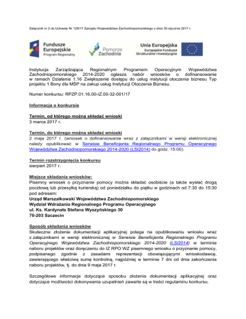 Załącznik nr 2 do Uchwały Nr 129/17 Zarządu Województwa Zachodniopomorskiego z dnia 30 stycznia 2017 r. Instytucja Zarządzająca Regionalnym Programem Operacyjnym Województwa Zachodniopomorskiego 2014-2020 ogłasza nabór wniosków o dofinansowanie w ramach Działania 1.16 Zwiększenie dostępu do usług instytucji otoczenia biznesu Typ projektu 1 Bony dla MŚP na zakup usług Instytucji Otoczenia Biznesu. Numer konkursu: RPZP.01.16.00-IZ.00-32-001/17 Informacja o konkursie Termin, od którego można składać wnioski 3 marca 2017 r. Termin, do którego można składać wnioski 2 maja 2017 r. (wniosek o dofinansowanie wraz z załącznikami w wersji elektronicznej należy opublikować w Serwisie Beneficjenta Regionalnego Programu Operacyjnego Województwa Zachodniopomorskiego 2014-2020 (LSI2014) do godz. 15:00). Termin rozstrzygnięcia konkursu sierpień 2017 r. Miejsce składania wniosków: Pisemny wniosek o przyznanie pomocy można składać osobiście (a także wysłać drogą pocztową lub przesyłką kurierską) od poniedziałku do piątku w godzinach od 7:30 do 15:30 pod adresem: Urząd Marszałkowski Województwa Zachodniopomorskiego Wydział Wdrażania Regionalnego Programu Operacyjnego ul. Ks. Kardynała Stefana Wyszyńskiego 30 70-203 Szczecin Sposób składania wniosków Skuteczne złożenie dokumentacji aplikacyjnej polega na opublikowaniu wniosku wraz z załącznikami w wersji elektronicznej w Serwisie Beneficjenta Regionalnego Programu Operacyjnego Województwa Zachodniopomorskiego 2014-2020 (LSI2014) w terminie naboru projektów oraz doręczeniu do IZ RPO WZ pisemnego wniosku o przyznanie pomocy, podpisanego zgodnie z zasadami reprezentacji obowiązującymi wnioskodawcę, zawierającego właściwą sumę kontrolną, najpóźniej w terminie 7 dni od dnia zakończenia naboru projektów, tj. do dnia 9 maja 2017 r. Szczegółowe informacje dotyczące sposobu złożenia dokumentacji aplikacyjnej oraz dotyczące możliwości dokonywania uzupełnień zawarte są w treści regulaminu konkursu. Kto może składać wnioski? W ramach Działania 1.16 podmiotami uprawnionymi do ubiegania się o dofinansowanie są Instytucje Otoczenia Biznesu zgodnie z zapisami regulaminu konkursu, będące Grantodawcami w ramach realizacji projektu grantowego. Na co można otrzymać dofinansowanie? 1. 2. 3. 4. W ramach konkursu możliwe jest dofinansowanie 1 typu projektów – Bony dla MŚP na zakup usług Instytucji Otoczenia Biznesu. Konkurs realizowany jest w formule projektu grantowego. Projektem grantowym jest projekt, którego beneficjent (Grantodawca) udziela grantów (bonów) na realizację zadań służących osiągnięciu celu tego projektu przez Grantobiorców. Grantodawca w ramach konkursu udziela grantu na zakup przez MŚP wysokiej jakości, specjalistycznych usług doradczych w zakresie wsparcia procesów innowacji w przedsiębiorstwach świadczonych przez Instytucje Otoczenia Biznesu, tj. w szczególności: a) doradztwo w zakresie transferu technologii, b) doradztwo w zakresie tworzenia i realizacji strategii ochrony własności intelektualnej w MŚP (w tym m.in. opracowanie strategii ochrony własności intelektualnej, usługi rzeczników patentowych wraz z asystą przy ochronie praw własności przemysłowej, badanie czystości i zdolności patentowej, audyty prawne w zakresie ustalania przynależności praw i regulowania stosunków prawnych w tym zakresie), c) doradztwo w zakresie kojarzenia partnerów gospodarczych i jednostek naukowych do współpracy w zakresie B+R, w tym wsparcie w tworzeniu konsorcjów naukowo–przemysłowych (w zakresie umów/porozumień o współpracy, schematów współpracy, zabezpieczania praw majątkowych), d) doradztwo w zakresie wprowadzania nowych modeli biznesowych, nowych produktów i usług (w tym m. in. analizy rynkowe, badania marketingowe, analizy FTO), e) doradztwo w zakresie jakości (projektowanie, wdrażanie i doskonalenie systemów zarządzania, certyfikacja zgodności dla wyrobów, usług, surowców, maszyn i urządzeń, aparatury kontrolno–pomiarowej lub kwalifikacji personelu w celu opracowania bardziej efektywnych produktów procesów i usług), f) doradztwo w zakresie korzystania z finansowania zewnętrznego, w szczególności dla projektów związanych z transferem i komercjalizacją technologii (m.in. przygotowanie biznes planów i teaserów inwestycyjnych, doradztwo prawne i biznesowe w negocjacjach z finansującymi), g) doradztwo w zakresie wdrażania ekoinnowacji i efektywności zasobów, h) doradztwo w zakresie wspomagania innowacji w sektorze usług i projektowania, i) doradztwo w zakresie opracowania strategii ekspansji na rynki zagraniczne – wyłącznie dla przedsiębiorstw działających w zakresie inteligentnych specjalizacji regionu. Kryteria wyboru projektów Stanowią załącznik do Regulaminu konkursu Finanse: Grantodawca: 1. Maksymalny poziom dofinansowania wydatków kwalifikowalnych projektu ze środków EFRR wynosi: 85 % wydatków kwalifikowalnych projektu grantowego. 2. Minimalny wkład własny wynosi: 15% kwoty wydatków kwalifikowalnych projektu grantowego. Grantobiorca: 1. Maksymalny poziom dofinansowania wydatków kwalifikowalnych projektu ze środków EFRR wynosi: 50 % wydatków kwalifikowalnych specjalistycznej usługi doradczej. 2. Minimalny wkład własny wynosi: 50 % wydatków kwalifikowalnych specjalistycznej usługi doradczej. 3. Maksymalna kwota dofinansowania dla jednego Grantobiorcy wynosi: 50 000,00 zł. 4. Minimalna wartość całkowitych wydatków kwalifikowalnych specjalistycznej usługi doradczej wynosi: 5 000,00 zł. Ogólna pula środków przeznaczona na dofinansowanie projektów 11 500 000,00 zł (słownie: jedenaście milionów pięćset tysięcy złotych). Niezbędne dokumenty: Regulamin konkursu (załącznik) Załączniki do regulaminu konkursu Inne ważne informacje Środki odwoławcze przysługujące składającemu wniosek Szczegółowe informacje dotyczące procedury odwoławczej 