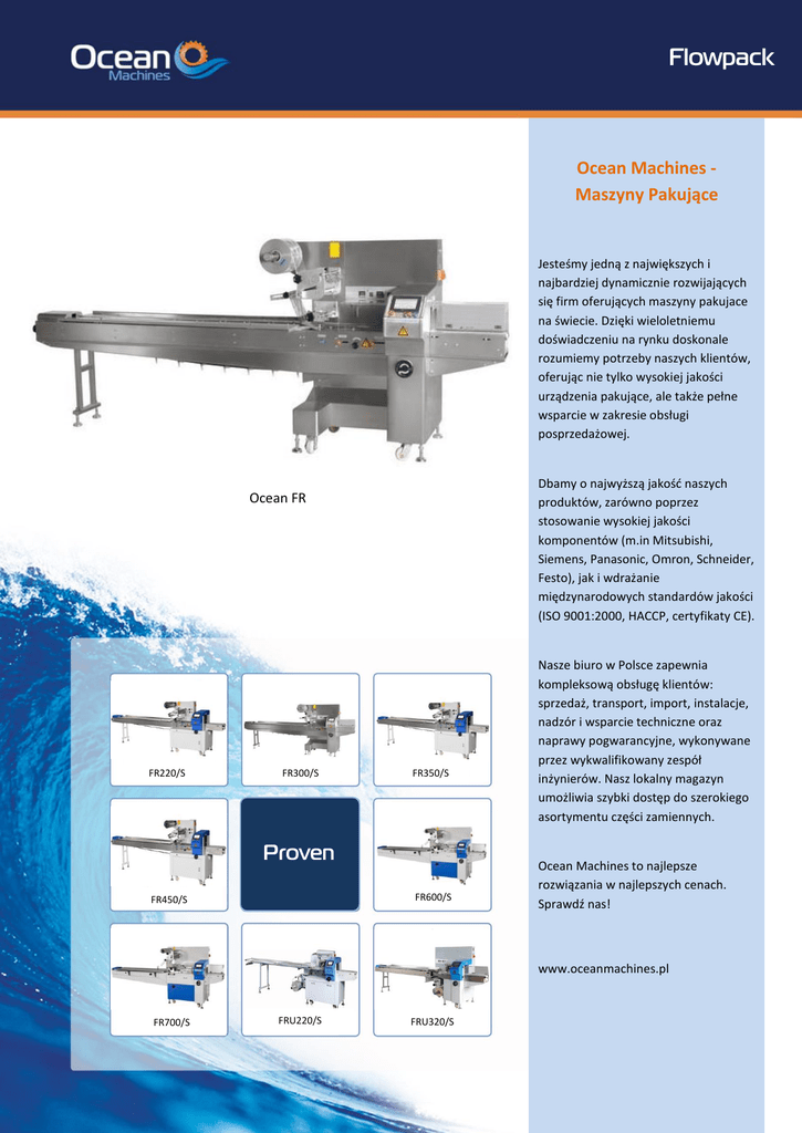 Flowpack Ocean Machines Maszyny Pakujące Jesteśmy jedną z największych i najbardziej dynamicznie rozwijających się firm oferujących maszyny pakujace na świecie. Dzięki wieloletniemu doświadczeniu na rynku doskonale rozumiemy potrzeby naszych klientów, oferując nie tylko wysokiej jakości urządzenia pakujące, ale także pełne wsparcie w zakresie obsługi posprzedażowej. Dbamy o najwyższą jakość naszych produktów, zarówno poprzez stosowanie wysokiej jakości komponentów (m.in Mitsubishi, Siemens, Panasonic, Omron, Schneider, Festo), jak i wdrażanie międzynarodowych standardów jakości (ISO 9001:2000, HACCP, certyfikaty CE). Ocean FR FR220/S FR300/S FR350/S Proven FR600/S FR450/S Nasze biuro w Polsce zapewnia kompleksową obsługę klientów: sprzedaż, transport, import, instalacje, nadzór i wsparcie techniczne oraz naprawy pogwarancyjne, wykonywane przez wykwalifikowany zespół inżynierów. Nasz lokalny magazyn umożliwia szybki dostęp do szerokiego asortymentu części zamiennych. Ocean Machines to najlepsze rozwiązania w najlepszych cenach. Sprawdź nas! www.oceanmachines.pl FR700/S FRU220/S WC FRU320/S RS - Flip Flowpack Specyfikacja FR220/S FR300/S FR350/S FR450/S FR220 / FR220S (Servo) FR300 / FR300S (Servo) FR350 / FR350S (Servo) FR450 / FR450S (Servo) Maksymalna prędkość 200/min / 230min 200/min / 230/min 200/min / 230/min 200/min / 230/min Maksymalna szerokość folii 220mm / 220mm 280mm / 280mm 350mm / 350mm 430mm / 430mm 60-170mm / 50-6000mm 80-230mm / 60-6000mm 80-230mm / 80-6000mm 80-230mm / 80-6000mm Szerokość produktu 30-100 / 35 - 100 35-140mm / 35-140mm 50-160mm / 50-160mm 50-180mm / 50-180mm Maksymalna wysokość produktu 5-35mm / 5-35mm 5-55mm / 5-55mm 5-60mm / 5-60mm 5-65mm / 5-65mm 300mm / 300mm 300mm / 300mm 300mm / 300mm 300mm / 300mm Zapotrzebowanie w energię 220V, 50/60Hz, 3.2kW/ 220V, 50/60Hz, 4.1kW 220V, 50/60Hz, 3.3kW / 220V, 50/60Hz, 4.1kW 220V, 50/60Hz, 5.15kW / 220V, 50/60Hz, 6.15kW 220V, 50/60Hz, 5.24kW / 220V, 50/60Hz, 6.15kW Wymiary (DxSxW) 3890x910x1390mm 3910x820x1520mm 3940x1010x1400mm 4130x940x1520mm 495kg / 440kg 551kg / 520kg 530kg / 490kg 644kg / 600kg FR600/S FR700S FRU220/S FRU320/S FR600 / FR600S (Servo) FR700S FRU220 / FRU220S (Servo) FRU320 / FRU320S (Servo) Maksymalna prędkość 150/min / 150/min 150/min 200/min / 230min 200/min / 230/min Maksymalna szerokość folii 600mm / 600mm 700mm 220mm / 220mm 320mm / 320mm 120-450mm / 120-6000mm 150-6000mm 65-170mm / 50-6000mm 80-230mm / 50-6000mm 50-250mm / 80-250mm 100-300mm 30-100mm / 30-100mm 35-150mm / 30-100mm 5-80mm / 5-80mm 5-100mm 5-35mm / 5-35mm 5-55mm / 5-55mm 300mm / 300mm 300mm 300mm / 300mm 300mm / 300mm Zapotrzebowanie w energię 220V, 50/60Hz, 3.5kW/ 220V, 50/60Hz, 4.5kW 220V, 50/60Hz, 4.5kW 220V, 50/60Hz, 2.4kW / 220V, 50/60Hz, 3.9kW 220V, 50/60Hz, 3.2kW / 220V, 50/60Hz, 3.9kW Wymiary (DxSxW) 4040x1020x1535mm 4130x1180x1520mm 4020x920x1340mm 4240x980x1340mm 920kg / 890kg 1020kg 440kg / 400kg 485kg / 430kg Model Długość produktu Maksymalna średnica folii Waga Model Długość produktu Szerokość produktu Maksymalna wysokość produktu Maksymalna średnica folii Waga