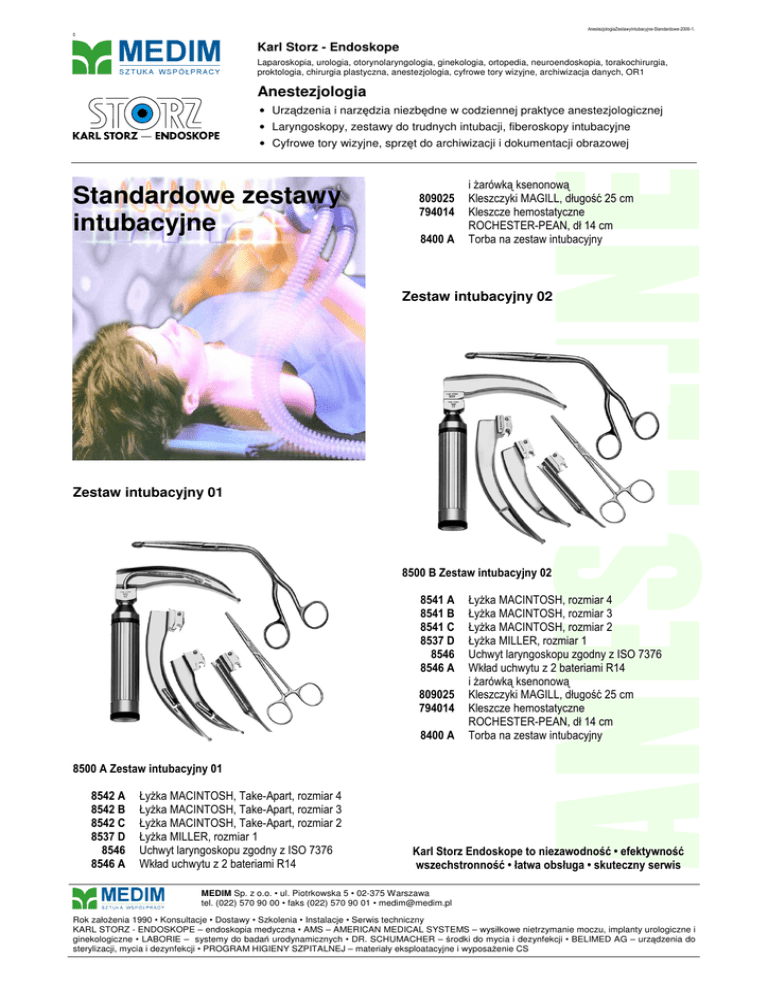 AnestezjologiaZestawyIntubacyjne-Standardowe-2006-1. 0 Karl Storz - Endoskope Laparoskopia, urologia, otorynolaryngologia, ginekologia, ortopedia, neuroendoskopia, torakochirurgia, proktologia, chirurgia plastyczna, anestezjologia, cyfrowe tory wizyjne, archiwizacja danych, OR1 Anestezjologia • Urządzenia i narzędzia niezbędne w codziennej praktyce anestezjologicznej • Laryngoskopy, zestawy do trudnych intubacji, fiberoskopy intubacyjne Standardowe zestawy intubacyjne 809025 794014 8400 A i żarówką ksenonową Kleszczyki MAGILL, długość 25 cm Kleszcze hemostatyczne ROCHESTER-PEAN, dł 14 cm Torba na zestaw intubacyjny Zestaw intubacyjny 02 Zestaw intubacyjny 01 8500 B Zestaw intubacyjny 02 8541 A 8541 B 8541 C 8537 D 8546 8546 A 809025 794014 8400 A 8500 A Zestaw intubacyjny 01 8542 A 8542 B 8542 C 8537 D 8546 8546 A Łyżka MACINTOSH, Take-Apart, rozmiar 4 Łyżka MACINTOSH, Take-Apart, rozmiar 3 Łyżka MACINTOSH, Take-Apart, rozmiar 2 Łyżka MILLER, rozmiar 1 Uchwyt laryngoskopu zgodny z ISO 7376 Wkład uchwytu z 2 bateriami R14 ANEST ANESTLINE LINE • Cyfrowe tory wizyjne, sprzęt do archiwizacji i dokumentacji obrazowej Łyżka MACINTOSH, rozmiar 4 Łyżka MACINTOSH, rozmiar 3 Łyżka MACINTOSH, rozmiar 2 Łyżka MILLER, rozmiar 1 Uchwyt laryngoskopu zgodny z ISO 7376 Wkład uchwytu z 2 bateriami R14 i żarówką ksenonową Kleszczyki MAGILL, długość 25 cm Kleszcze hemostatyczne ROCHESTER-PEAN, dł 14 cm Torba na zestaw intubacyjny Karl Storz Endoskope to niezawodność • efektywność wszechstronność • łatwa obsługa • skuteczny serwis MEDIM Sp. z o.o. • ul. Piotrkowska 5 • 02-375 Warszawa tel. (022) 570 90 00 • faks (022) 570 90 01 • [email protected] Rok założenia 1990 • Konsultacje • Dostawy • Szkolenia • Instalacje • Serwis techniczny KARL STORZ - ENDOSKOPE – endoskopia medyczna • AMS – AMERICAN MEDICAL SYSTEMS – wysiłkowe nietrzymanie moczu, implanty urologiczne i ginekologiczne • LABORIE – systemy do badań urodynamicznych • DR. SCHUMACHER – środki do mycia i dezynfekcji • BELIMED AG – urządzenia do sterylizacji, mycia i dezynfekcji • PROGRAM HIGIENY SZPITALNEJ – materiały eksploatacyjne i wyposażenie CS AnestezjologiaZestawyIntubacyjne-Standardowe-2006-1. 0 Możliwości zasilania laryngoskopów: 8500 C Zestaw intubacyjny 03 – Pediatryczny 8537 C 8537 D 8537 E 8541 C 8541 D 8541 E 8547 8547 A 809020 794014 8400 A Łyżka MILLER, rozmiar 2 Łyżka MILLER, rozmiar 1 Łyżka MILLER, rozmiar 0 Łyżka MACINTOSH, rozmiar 2 Łyżka MACINTOSH, rozmiar 1 Łyżka MACINTOSH, rozmiar 0 Uchwyt laryngoskopu zgodny z ISO 7376 Wkład uchwytu z 2 bateriami AA i żarówką ksenonową Kleszczyki MAGILL, długość 20 cm Kleszcze hemostatyczne ROCHESTER-PEAN, dł 14 cm Torba na zestaw intubacyjny 8546 A ANEST ANESTLINE LINE Zestaw intubacyjny 03 – Pediatryczny 8546 BB 8547 A 8547 B 8546 LB 8546 A 8546 BB 8547 A 8547 B 8546 LB 8546 R Wkład uchwytu z 2 bateriami R14 i żarówką ksenonową Akumulator do uchwytu 8546 z żarówką ksenonową Wkład uchwytu z 2 bateriami AA i żarówką ksenonową Akumulator do uchwytu 8547 z żarówką ksenonową Ładowarka indukcyjna akumulatorów Redukcja do ładowania akumulatorów 8547 B Karl Storz Endoskope to niezawodność • efektywność wszechstronność • łatwa obsługa • skuteczny serwis MEDIM Sp. z o.o. • ul. Piotrkowska 5 • 02-375 Warszawa tel. (022) 570 90 00 • faks (022) 570 90 01 • [email protected] Rok założenia 1990 • Konsultacje • Dostawy • Szkolenia • Instalacje • Serwis techniczny KARL STORZ - ENDOSKOPE – endoskopia medyczna • AMS – AMERICAN MEDICAL SYSTEMS – wysiłkowe nietrzymanie moczu, implanty urologiczne i ginekologiczne • LABORIE – systemy do badań urodynamicznych • DR. SCHUMACHER – środki do mycia i dezynfekcji • BELIMED AG – urządzenia do sterylizacji, mycia i dezynfekcji • PROGRAM HIGIENY SZPITALNEJ – materiały eksploatacyjne i wyposażenie CS