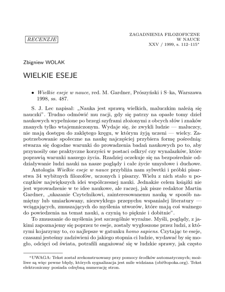 RECENZJE ZAGADNIENIA FILOZOFICZNE W NAUCE XXV / 1999, s. 112–115∗ Zbigniew WOLAK WIELKIE ESEJE • Wielkie eseje w nauce, red. M. Gardner, Prószyński i S–ka, Warszawa 1998, ss. 487. S. J. Lec napisał: „Nauka jest sprawą wielkich, maluczkim należą się nauczki”. Trudno odmówić mu racji, gdy się patrzy na opasłe tomy dzieł naukowych wypełnione po brzegi szyframi złożonymi z obcych słów i znaków znanych tylko wtajemniczonym. Wydaje się, że zwykli ludzie — maluczcy, nie mają dostępu do zaklętego kręgu, w którym żyją uczeni — wielcy. Zapotrzebowanie społeczne na naukę najczęściej przybiera formę pośrednią: stwarza się dogodne warunki do prowadzenia badań naukowych po to, aby przynosiły one praktyczne korzyści w postaci odkryć czy wynalazków, które poprawią warunki naszego życia. Rzadziej oczekuje się na bezpośrednie oddziaływanie ludzi nauki na nasze poglądy i całe życie umysłowe i duchowe. Antologia Wielkie eseje w nauce przybliża nam sylwetki i próbki pisarstwa 34 wybitnych filozofów, uczonych i pisarzy. Wielu z nich stało u początków największych idei współczesnej nauki. Jednakże celem książki nie jest wprowadzenie w te idee naukowe, ale raczej, jak pisze redaktor Martin Gardner, „ukazanie Czytelnikowi, zainteresowanemu nauką w sposób namiętny lub umiarkowany, niezwykłego przepychu wspaniałej literatury — wciągających, zmuszających do myślenia utworów, które mają coś ważnego do powiedzenia na temat nauki, a czynią to pięknie i dobitnie”. To zmuszanie do myślenia jest szczególnie wyraźne. Myśli, poglądy, z jakimi zapoznajemy się poprzez te eseje, zostały wygłoszone przez ludzi, z którymi kojarzymy to, co najlepsze w gatunku homo sapiens. Czytając te eseje, czasami jesteśmy zadziwieni do jakiego stopnia ci ludzie, wydawać by się mogło, odcięci od świata, potrafili angażować się w ludzkie sprawy, jak często ∗ UWAGA: Tekst został zrekonstruowany przy pomocy środków automatycznych; możliwe są więc pewne błędy, których sygnalizacja jest mile widziana ([email protected]). Tekst elektroniczny posiada odrębną numerację stron. 2 Zbigniew WOLAK mogą nas uczyć mądrości życia. Jednakże nierzadko gotowi jesteśmy sprzeciwiać się temu, co głoszą. Podejrzewamy, że i oni popełniają błędy, a czasami wypowiadają się w kwestiach, które wykraczają poza zakres ich kompetencji. To także jest pouczające. Omylność mądrzejszych od nas uświadamia nam i naszą omylność, ale też mądrość tych, których czasem podejrzewaliśmy tylko o posiadanie wiedzy, przypomina nam o tym, by nie zamykać się nigdy w kręgu swoich poglądów. To, o czym napisałem, sprawia, że książkę czyta się rzeczywiście z pasją, ciągle napotykamy na nowe i niespodziewane idee. Na przykład poznajemy kręte drogi teologii naturalnej i, jeśli można tak powiedzieć, anty–teologii naturalnej. Obie bowiem stały wobec świata, zwłaszcza świata ożywionego, pełnego piękna, instynktownej mądrości i poświęcenia, a jednocześnie pełnego okrucieństwa i cierpienia. Ta ambiwalencja pojawiała się nie tylko wśród różnych myślicieli, ale także u jednych i tych samych w różnych okresach ich działalności. Na przykład, gdy Darwin podróżował na statku „Beagle” jego skłonność do cytowania Pisma świętego stała się przedmiotem oficerskich docinków. Później jednakże pojawiło się zwątpienie. Pisał: „Wyznaję, że nie umiem dostrzec dookoła nas celowości i dobrodziejstw tak wyraźnie jak inni i jak bym sam sobie tego życzył. Wydaje mi się, że jest zbyt wiele nieszczęść na tym świecie. Nie mogę uwierzyć, aby miłosierny i wszechmocny Bóg miał celowo stworzyć gąsieniczniki z osobliwą zaiste intencją, aby żywiły się one żywym ciałem gąsienic; albo kota, aby musiał igrać z myszą” (s. 58). To, co dla Williama Kirbiego było przejawem mądrości Stwórcy, dla Darwina było powodem zwątpienia w Jego dobroć i wszechmoc, a może nawet w Jego istnienie. Dziś jesteśmy nieco mądrzejsi, trochę dzięki rozsterkom, jakie przeżywali ludzie pokolenia Darwina i ich bliscy potomkowie. Lepiej rozumiemy to, co przypomniał S. J. Gould, że nie wszystkie odpowiedzi na nasze pytania potrafimy znaleźć w przyrodzie: „Natura nie dostarczy gotowych do odczytania odpowiedzi, nie wynikną one i nie mogą wyniknąć z naukowych danych” (s. 59). Wielu autorów, których eseje umieszczono w omawianej antologii, przedstawiło ciekawe idee również w dziedzinach, w których nie byli specjalistami. Na przykład K. G. Chesterton pomysłowo opisał różnicę między dedukcją i indukcją przy użyciu metafory baśni. Lektura Wielkich esejów w nauce pozwala nam z pewnością uświadomić sobie różne aspekty poznania naukowego. Jeden z nich to piękno odkrywane przez naukę, o którym pisał I. Asimow, użalając się nad losem poety Walta Whitmana: „biedny poeta nigdy nie miał okazji dowiedzieć się, jak śmiesznie WIELKIE ESEJE 3 małą i ograniczoną część piękna mógł obserwować, kiedy «patrzył w doskonałą ciszę gwiazd»” (s. 202). Drugi ważny aspekt to świadomość tego, że są rzeczy, których nie może poznać ani uczony, ani nikt inny. Obrazowo wyraża to anegdota przytoczona przez W. Jamesa za Carlem Sandburgiem: „Biały człowiek narysował na piasku małe kółko i powiedział do czerwonego człowieka: «Oto, co wiedzą Indianie»; po czym, rysując duże kółko wokół tego małego, dodał: «Oto, co wie biały człowiek». Indianin wziął patyk i zakreślił ogromny pierścień wokół obu kółek: «Tutaj biały człowiek i czerwony człowiek nie wiedzą nic»” (s. 69). Niezależnie od tego, jak rozdzielamy wielkie i małe koła wiedzy i mądrości pomiędzy siebie i innych, zawsze pozostanie coś, o czym nie wiemy nic. Można z pewnością polecić książkę Wielkie eseje w nauce zarówno jako zbiór ciek