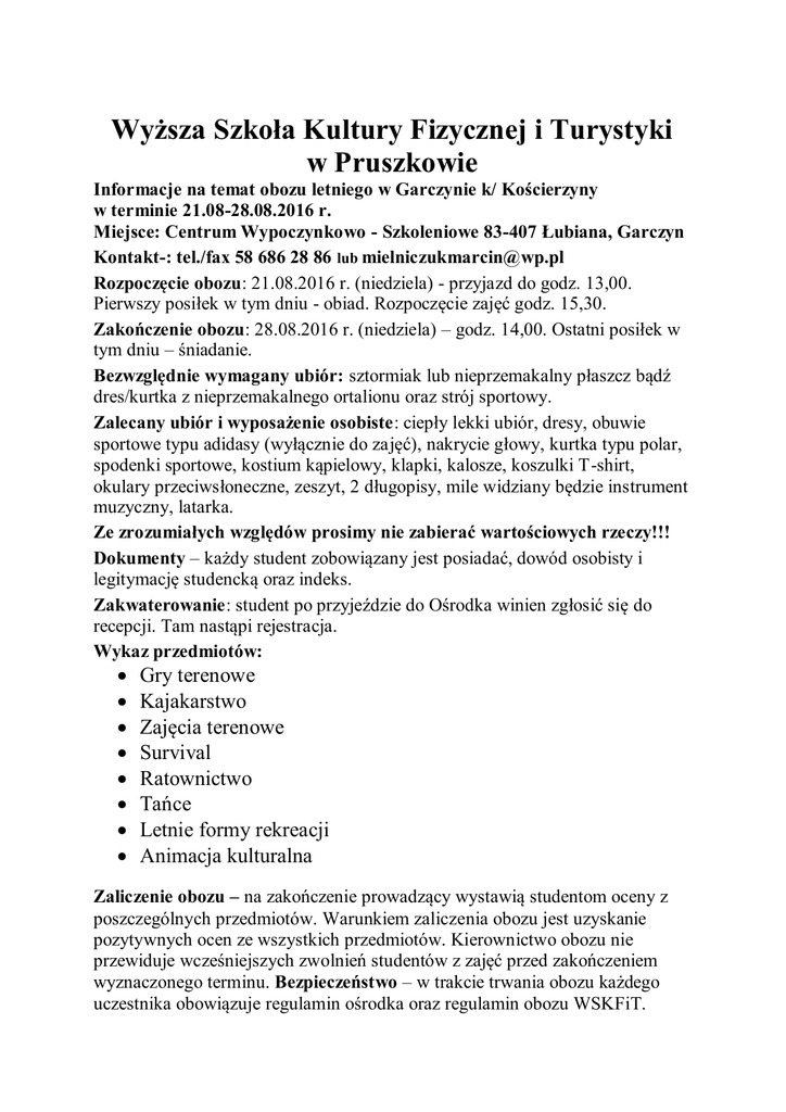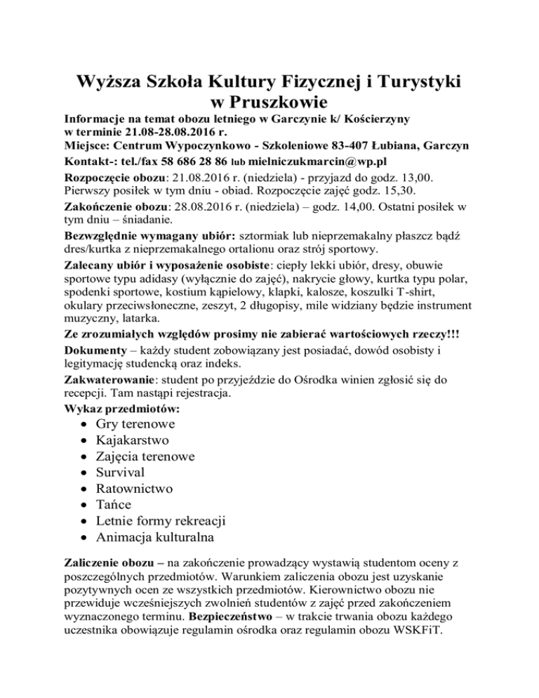 Wyższa Szkoła Kultury Fizycznej i Turystyki w Pruszkowie Informacje na temat obozu letniego w Garczynie k/ Kościerzyny w terminie 21.08-28.08.2016 r. Miejsce: Centrum Wypoczynkowo - Szkoleniowe 83-407 Łubiana, Garczyn Kontakt-: tel./fax 58 686 28 86 lub [email protected] Rozpoczęcie obozu: 21.08.2016 r. (niedziela) - przyjazd do godz. 13,00. Pierwszy posiłek w tym dniu - obiad. Rozpoczęcie zajęć godz. 15,30. Zakończenie obozu: 28.08.2016 r. (niedziela) – godz. 14,00. Ostatni posiłek w tym dniu – śniadanie. Bezwzględnie wymagany ubiór: sztormiak lub nieprzemakalny płaszcz bądź dres/kurtka z nieprzemakalnego ortalionu oraz strój sportowy. Zalecany ubiór i wyposażenie osobiste: ciepły lekki ubiór, dresy, obuwie sportowe typu adidasy (wyłącznie do zajęć), nakrycie głowy, kurtka typu polar, spodenki sportowe, kostium kąpielowy, klapki, kalosze, koszulki T-shirt, okulary przeciwsłoneczne, zeszyt, 2 długopisy, mile widziany będzie instrument muzyczny, latarka. Ze zrozumiałych względów prosimy nie zabierać wartościowych rzeczy!!! Dokumenty – każdy student zobowiązany jest posiadać, dowód osobisty i legitymację studencką oraz indeks. Zakwaterowanie: student po przyjeździe do Ośrodka winien zgłosić się do recepcji. Tam nastąpi rejestracja. Wykaz przedmiotów: Gry terenowe Kajakarstwo Zajęcia terenowe Survival Ratownictwo Tańce Letnie formy rekreacji Animacja kulturalna Zaliczenie obozu – na zakończenie prowadzący wystawią studentom oceny z poszczególnych przedmiotów. Warunkiem zaliczenia obozu jest uzyskanie pozytywnych ocen ze wszystkich przedmiotów. Kierownictwo obozu nie przewiduje wcześniejszych zwolnień studentów z zajęć przed zakończeniem wyznaczonego terminu. Bezpieczeństwo – w trakcie trwania obozu każdego uczestnika obowiązuje regulamin ośrodka oraz regulamin obozu WSKFiT.