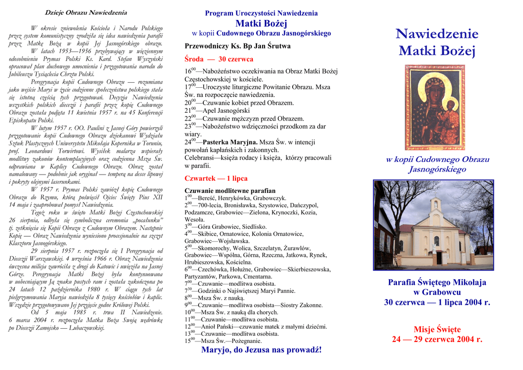 Dzieje Obrazu Nawiedzenia W okresie zniewolenia Kościoła i Narodu Polskiego przez system komunistyczny zrodziła się idea nawiedzenia parafii przez Matkę Bożą w kopii Jej Jasnogórskiego obrazu. W latach 1953—1956 przebywający w więziennym odosobnieniu Prymas Polski Ks. Kard. Stefan Wyszyński opracował plan duchowego umocnienia i przygotowania narodu do Jubileuszu Tysiąclecia Chrztu Polski. Peregrynacja kopii Cudownego Obrazu — rozumiana jako wejście Maryi w życie codzienne społeczeństwa polskiego stała się istotną częścią tych przygotowań. Decyzja Nawiedzenia wszystkich polskich diecezji i parafii przez kopię Cudownego Obrazu została podjęta 11 kwietnia 1957 r. na 45 Konferencji Episkopatu Polski. W lutym 1957 r. OO. Paulini z Jasnej Góry powierzyli przygotowanie kopii Cudownego Obrazu dziekanowi Wydziału Sztuk Plastycznych Uniwersytetu Mikołaja Kopernika w Toruniu, prof. Leonardowi Torwirtowi. Wysiłek malarza wspierały modlitwy zakonów kontemplacyjnych oraz codzienna Msza Św. odprawiana w Kaplicy Cudownego Obrazu. Obraz został namalowany — podobnie jak oryginał — temperą na desce lipowej i pokryty olejnymi laserunkami. W 1957 r. Prymas Polski zawiózł kopię Cudownego Obrazu do Rzymu, którą poświęcił Ojciec Święty Pius XII 14 maja i zaaprobował pomysł Nawiedzenia. Tegoż roku w święto Matki Bożej Częstochowskiej 26 sierpnia, odbyła się symboliczna ceremonia „pocałunku” tj. zetknięcia się Kopii Obrazu z Cudownym Obrazem. Następnie Kopię — Obraz Nawiedzenia wyniesiono procesjonalnie na szczyt Klasztoru Jasnogórskiego. 29 sierpnia 1957 r. rozpoczęła się I Peregrynacja od Diecezji Warszawskiej. 4 września 1966 r. Obraz Nawiedzenia ówczesna milicja zawróciła z drogi do Katowic i uwięziła na Jasnej Górze. Peregrynacja Matki Bożej była kontynuowana w uobecniającym Ją znaku pustych ram i została zakończona po 24 latach 12 października 1980 r. W ciągu tych lat pielgrzymowania Maryja nawiedziła 8 tysięcy kościołów i kaplic. Wszędzie przygotowywano Jej przyjęcie godne Królowej Polski. Od 5 maja 1985 r. trwa II Nawiedzenie. 6 marca 2004 r. rozpoczęła Matka Boża Swoją wędrówkę po Diecezji Zamojsko — Lubaczowskiej. Program Uroczystości Nawiedzenia Matki Bożej w kopii Cudownego Obrazu Jasnogórskiego Przewodniczy Ks. Bp Jan Śrutwa Środa — 30 czerwca 1600—Nabożeństwo oczekiwania na Obraz Matki Bożej Częstochowskiej w kościele. 1700—Uroczyste liturgiczne Powitanie Obrazu. Msza Św. na rozpoczęcie nawiedzenia. 2000—Czuwanie kobiet przed Obrazem. 2100—Apel Jasnogórski 2200—Czuwanie mężczyzn przed Obrazem. 2300—Nabożeństwo wdzięczności przodkom za dar wiary. 2400—Pasterka Maryjna. Msza Św. w intencji powołań kapłańskich i zakonnych. Celebransi—księża rodacy i księża, którzy pracowali w parafii. Czwartek — 1 lipca Nawiedzenie Matki Bożej w kopii Cudownego Obrazu Jasnogórskiego Czuwanie modlitewne parafian 100—Bereść, Henrykówka, Grabowczyk. 200—700-lecia, Bronisławka, Szystowice, Dańczypol, Podzamcze, Grabowiec—Zielona, Krynoczki, Kozia, Wesoła. 300—Góra Grabowiec, Siedlisko. 400—Skibice, Ornatowice, Kolonia Ornatowice, Grabowiec—Wojsławska. 500—Skomorochy, Wolica, Szczelatyn, Żurawlów, Grabowiec—Wspólna, Górna, Rzeczna, Jatkowa, Rynek, Hrubieszowska, Kościelna. 600—Czechówka, Hołużne, Grabowiec—Skierbieszowska, Partyzantów, Parkowa, Cmentarna. 700—Czuwanie—modlitwa osobista. 730—Godzinki o Najświętszej Maryi Pannie. 800—Msza Św. z nauką. 900—Czuwanie—modlitwa osobista—Siostry Zakonne. 1000—Msza Św. z nauką dla chorych. 1100—Czuwanie—modlitwa osobista. 1200—Anioł Pański—czuwanie matek z małymi dziećmi. 1300—Czuwanie—modlitwa osobista. 1500—Msza Św.—Pożegnanie. Maryjo, do Jezusa nas prowadź! Parafia Świętego Mikołaja w Grabowcu 30 czerwca — 1 lipca 2004 r. Misje Święte 24 — 29 czerwca 2004 r. Program Misji przed Nawiedzeniem Matki Bożej w kopii Obrazu Jasnogórskiego Czwartek — 24 czerwca Rozpoczęcie Misji Świętych Hymn do Ducha Św. 800—Msza Św. z nauką dla wszystkich wiernych. (Skomorochy Duże) 900—Msza Św. z nauką dla wszystkich wiernych. 1100—Msza Św. z nauką dla dzieci szkolnych. 1200—Msza Św. z nauką dla wszystkich wiernych. (Ornatowice) 1500—Msza Św. z nauką ogólną. 1700—Nauka stanowa dla kobiet, matek. 1800—Msza Św. 1830—Nauka stanowa dla mężczyzn. 2000—Msza Św. dla młodzieży i nauka stanowa. 2100—Apel Jasnogórski 2100—Apel Jasnogórski—Ornatowice (Na apele przychodzimy całymi rodzinami) Piątek — 25 czerwca 800—Msza Św. z nauką dla dzieci i młodzieży szkolnej. Zakończenie roku szkolnego. 900—Msza Św. z nauką dla wszystkich wiernych. 1100—Msza Św. z nauką dla rodziców. Nabożeństwo błogosławienia niemowlaków i maluchów. 1200—Msza Św. z nauką dla wszystkich wiernych. (Ornatowice) 1500—Msza Św. z nauką ogólną. 1700—Nauka stanowa dla kobiet, matek. 1800—Msza Św. z nauką dla wszystkich wiernych. 1900—Nauka stanowa dla mężczyzn. 2000—Msza Św. dla młodzieży i nauka stanowa. 2100—Apel Jasnogórski 2100—Apel Jasnogórski—Skomorochy Duże Kościół filialny w Skomorochach Dużych Sobota — 26 czerwca 00 8 —Msza Św. z nauką dla wszystkich wiernych. (Skomorochy Duże) 900—Msza Św. z nauką dla wszystkich wiernych. 1100—Msza Św. z nauką dla wszystkich wiernych. Nabożeństwo dla chorych, starszych, cierpiących. 1200—Msza Św. z nauką dla wszystkich wiernych. (Ornatowice) 1500—Msza Św. z nauką dla dzieci szkolnych. 1800—Msza Św. z nauką dla wszystkich. Nabożeństwo przebłagalne za grzechy. 2000—Msza Św. dla młodzieży i nauka stanowa. 2100—Apel Jasnogórski 2100—Apel Jasnogórski—Ornatowice Niedziela — 27 czerwca Dzień spowiedzi 830—Msza Św. z nauką dla wszystkich wiernych. 900—Msza Św. z nauką dla wszystkich wiernych. (