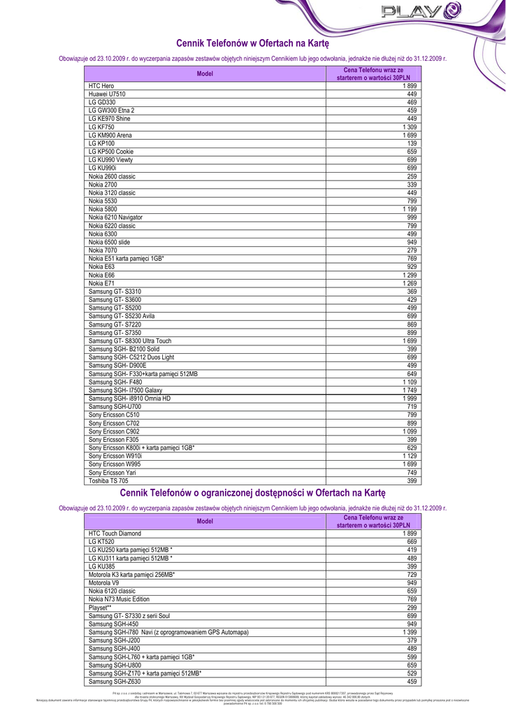 Cennik Telefonów w Ofertach na Kartę Obowiązuje od 23.10.2009 r. do wyczerpania zapasów zestawów objętych niniejszym Cennikiem lub jego odwołania, jednakże nie dłużej niż do 31.12.2009 r. Model HTC Hero Huawei U7510 LG GD330 LG GW300 Etna 2 LG KE970 Shine LG KF750 LG KM900 Arena LG KP100 LG KP500 Cookie LG KU990 Viewty LG KU990i Nokia 2600 classic Nokia 2700 Nokia 3120 classic Nokia 5530 Nokia 5800 Nokia 6210 Navigator Nokia 6220 classic Nokia 6300 Nokia 6500 slide Nokia 7070 Nokia E51 karta pamięci 1GB* Nokia E63 Nokia E66 Nokia E71 Samsung GT- S3310 Samsung GT- S3600 Samsung GT- S5200 Samsung GT- S5230 Avila Samsung GT- S7220 Samsung GT- S7350 Samsung GT- S8300 Ultra Touch Samsung SGH- B2100 Solid Samsung SGH- C5212 Duos Light Samsung SGH- D900E Samsung SGH- F330+karta pamięci 512MB Samsung SGH- F480 Samsung SGH- I7500 Galaxy Samsung SGH- i8910 Omnia HD Samsung SGH-U700 Sony Ericsson C510 Sony Ericsson C702 Sony Ericsson C902 Sony Ericsson F305 Sony Ericsson K800i + karta pamięci 1GB* Sony Ericsson W910i Sony Ericsson W995 Sony Ericsson Yari Toshiba TS 705 Cena Telefonu wraz ze starterem o wartości 30PLN 1 899 449 469 459 449 1 309 1 699 139 659 699 699 259 339 449 799 1 199 999 799 499 949 279 769 929 1 299 1 269 369 429 499 699 869 899 1 699 399 699 499 649 1 109 1 749 1 999 719 799 899 1 099 399 629 1 129 1 699 749 399 Cennik Telefonów o ograniczonej dostępności w Ofertach na Kartę Obowiązuje od 23.10.2009 r. do wyczerpania zapasów zestawów objętych niniejszym Cennikiem lub jego odwołania, jednakże nie dłużej niż do 31.12.2009 r. Cena Telefonu wraz ze Model starterem o wartości 30PLN HTC Touch Diamond 1 899 LG KT520 669 LG KU250 karta pamięci 512MB * 419 LG KU311 karta pamięci 512MB * 489 LG KU385 399 Motorola K3 karta pamięci 256MB* 729 Motorola V9 949 Nokia 6120 classic 659 Nokia N73 Music Edition 769 Playset** 299 Samsung GT- S7330 z serii Soul 699 Samsung SGH-i450 949 Samsung SGH-i780 Navi (z oprogramowaniem GPS Automapa) 1 399 Samsung SGH-J200 379 Samsung SGH-J400 489 Samsung SGH-L760 + karta pamięci 1GB* 599 Samsung SGH-U800 659 Samsung SGH-Z170 + karta pamięci 512MB* 529 Samsung SGH-Z630 459 P4 sp. z o.o. z siedzibą i adresem w Warszawie, ul. Taśmowa 7, 02-677 Warszawa wpisana do rejestru przedsiębiorców Krajowego Rejestru Sądowego pod numerem KRS 0000217207, prowadzonego przez Sąd Rejonowy dla miasta stołecznego Warszawy, XIII Wydział Gospodarczy Krajowego Rejestru Sądowego, NIP 951-21-20-077, REGON 015808609, której kapitał zakładowy wynosi: 46 342 000,00 złotych. Niniejszy dokument zawiera informacje stanowiące tajemnicę przedsiębiorstwa Grupy P4, których rozpowszechnianie w jakiejkolwiek formie bez pisemnej zgody właściciela jest zabronione do momentu ich oficjalnej publikacji. Osoba która weszła w posiadanie tego dokumentu przez przypadek lub pomyłkę proszona jest o niezwłoczne powiadomienie P4 sp. z o.o. tel. 0 790 500 500 Sony Ericsson P1i + karta pamięci 512 MB* Sony Ericsson T650i Sony Ericsson W660i Sony Ericsson W880i Toshiba G500 1 349 649 639 799 759 Opłata za Telefony podana jest w złotych i zawiera podatek VAT. *Karty pamięci są dostępne w wybranych zestawach Telefonów do wyczerpania stanów magazynowych kart pamięci. **Playset dostępny ze starterem o wartości 9PLN w Ofercie Promocyjnej Playset w cenie 199 PLN Blokada SIM LOCK: 1. W przypadku gdy oferowany w ramach Oferty Play Telefon będzie posiadał blokadę SIM Lock, Abonent może żądać usunięcia tej blokady w każdym czasie w Punktach Sprzedaży P4. Blokada SIM Lock usuwana jest bezpłatnie w ramach istniejących możliwości technicznych. 2. W przypadku usunięcia blokady SIM Lock poza Punktem Sprzedaży P4 w sposób nie uzgodniony z P4 Abonent może stracić prawo do bezpłatnej obsługi serwisowej Modemu w ramach gwarancji, rękojmi lub uprawnień z tytułu niezgodności z umową, jeżeli wada / niezgodność z umową powstała na skutek usunięcia blokady SIM Lock. Promocyjne ceny Telefonów: 3. Przy zakupie startera o wartości 30PLN w ramach Ofert na Kartę, Abonent ma możliwość zakupu Telefonu na warunkach cenowych określonych w niniejszym Cenniku Telefonów. 4. P4 zastrzega, iż dostępność poszczególnych modeli Telefonów uzależniona jest od aktualnych stanów magazynowych Punktów Sprzedaży P4. PRAWO DO BŁĘDÓW W DRUKU ZASTRZEŻONE P4 sp. z o.o. z siedzibą i adresem w Warszawie, ul. Taśmowa 7, 02-677 Warszawa wpisana do rejestru przedsiębiorców Krajowego Rejestru Sądowego pod numerem KRS 0000217207, prowadzonego przez Sąd Rejonowy dla miasta stołecznego Warszawy, XIII Wydział Gospodarczy Krajowego Rejestru Sądowego, NIP 951-21-20-077, REGON 015808609, której kapitał zakładowy wynosi: 46 342 000,00 złotych. Niniejszy dokument zawiera informacje stanowiące tajemnicę przedsiębiorstwa Grupy P4, których rozpowszechnianie w jakiejkolwiek formie bez pisemnej zgody właściciela jest zabronione do momentu ich oficjalnej publikacji. Osoba która weszła w posiadanie tego dokumentu przez przypadek lub pomyłkę proszona jest o niezwłoczne powiadomienie P4 sp. z o.o. tel. 0 790 500 500