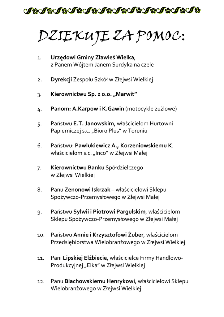 DZIEKUJE ZA POMOC: 1. Urzędowi Gminy Zławieś Wielka, z Panem Wójtem Janem Surdyka na czele 2. Dyrekcji Zespołu Szkół w Złejwsi Wielkiej 3. Kierownictwu Sp. z o.o. „Marwit” 4. Panom: A.Karpow i K.Gawin (motocykle żużlowe) 5. Państwu E.T. Janowskim, właścicielom Hurtowni Papierniczej s.c. „Biuro Plus” w Toruniu 6. Państwu: Pawlukiewicz A., Korzeniowskiemu K. właścicielom s.c. „Inco” w Złejwsi Małej 7. Kierownictwu Banku Spółdzielczego w Złejwsi Wielkiej 8. Panu Zenonowi Iskrzak – właścicielowi Sklepu Spożywczo-Przemysłowego w Złejwsi Małej 9. Państwu Sylwii i Piotrowi Pargulskim, właścicielom Sklepu Spożywczo-Przemysłowego w Złejwsi Małej 10. Państwu Annie i Krzysztofowi Żuber, właścicielom Przedsiębiorstwa Wielobranżowego w Złejwsi Wielkiej 11. Pani Lipskiej Elżbiecie, właścicielce Firmy HandlowoProdukcyjnej „Elka” w Złejwsi Wielkiej 12. Panu Blachowskiemu Henrykowi, właścicielowi Sklepu Wielobranżowego w Złejwsi Wielkiej 13. Pani Mądrzejewskiej Antoninie, właścicielce Sklepu Wielobranżowego „Ania” w Złejwsi Wielkiej 14. Pani Walkowiak Annie , właścicielce Sklepu Wielobranżowego w Pędzewie 15. Państwu Cieśla, właścicielom Piekarni naZakwasie.pl w Złejwsi Małej 16. Panu T. Śliwa, właścicielowi FPHU „Mr. Max” w Toporzysku 17. Panu Z. Cybulskiemu, właścicielowi Restauracji „Leśniczanka” w Górsku 18. Panu Tomaszowi Rutkowskiemu, właścicielowi sklepu ze sprzętem Ivena 19. Panu Owieśnemu, właścicielowi „sceny artystycznej” 20. Panu Markowi Siniło, właścicielowi Hurtowni Słodyczy „MW-SOFT” z Tucholi, z siedzibą w Złejwsi Wielkiej 21. Właścicielom Sklepu „Kompan” w Złejwsi Wielkiej 22. Właścicielom Spółki z o.o. „Hacom Polyester” w Złejwsi Małej 23. Duetowi muzycznemu p. Orłowskich 24. Kołu Gospodyń Wiejskich z Gutowa 25. Kołu Gospodyń Wiejskich z Pędzewa 26. Kołu Gospodyń Wiejskich ze Złejwsi Wielkiej 27. Pani Angelice Galczak (malowanie twarzy) 28. Członkom HDK 29. Panu Grześkowiak (wata cukrowa) 30. Panu Kelakowi (przejazd bryczką) 31. Scholce Parafialnej i Grupom Wokalnym 32. Panom: Markowi Zawiszewskiemu, Januszowi Lemke i Zdzisławowi Młodeckiemu (konkursy sportowe) 33. Panu Janowi Armińskiemu (hydraulika) 34. Pani Ewelinie Łuczak (zakład fryzjerski) 35. Pani Katarzynie Bełza (sklep z firanami) 36. Właścicielom Hurtowni Papierniczej w Czarnowie 37. Pani A. Gil (kiosk ruch) 38. Pani D. Krużewskiej (kwiaty) 39. Pani Kwiatkowskiej (fryzjer) 40. Państwu Parzych 41. Państwu Trzcińskim (warzywniak) 42. Państwu Wrzeszykowskim 43. Państwu Wicik (serwis klimatyzacji) 44. Pani Paulinie Zakierskiej (busparty) 45. Właścicielom różnorodnych stoisk i atrakcji 46. MOTOCYKLISTOM 47. Paniom, które przygotowały wypieki: p. Ani Lofek, p.Ewie Łobaczewskiej, p. Ali Armińskiej, p. Basi Zamorowskiej, p. Otylii Hubner, p. Danucie Ordak, p. Bogusi Kubiak, p. Danucie Hamerla, p. Ewie i Agnieszce Urbańskim, p. Galczak Annie, p. Jurak Krystynie, p. Łatka Agnieszce, p. Bida Urszuli, p. Smal Aleksandrze, p. Pytel Małgorzacie, p. Tomala Urszuli, p. Cimoch Katarzynie, p. Czarneckiej Justynie, p. Miłek Krystynie 48. Włascicielom stoisk w Pasażu Handlowym w Złejwsi W.: Michalskiej Barbarze Kozłowskiej Magdalenie Jakubczak Edycie Falkowskiej Justynie Gajownik Agacie Sondej Annie Worach Katarzynie 49. Osobom, które przekazały środki finansowe: Państwu Drewnowskim Panu Jakubowi Górskiemu Panu Henrykowi Blachowskiemu Państwu Piotrowskim Kołu Gospodyń Wiejskich ze Złejwsi Państwu Kwiatkowskim 50. Parafianom, którzy przekazali gadżety na loterię fantową i przygotowali artykuły spożywcze 51. Lokalnym służbom mundurowym: Straży Pożarnej i Policji 52. Radzie Parafialnej , Sympatykom naszej Parafii i Wszystkim wyżej nie wymienionym!