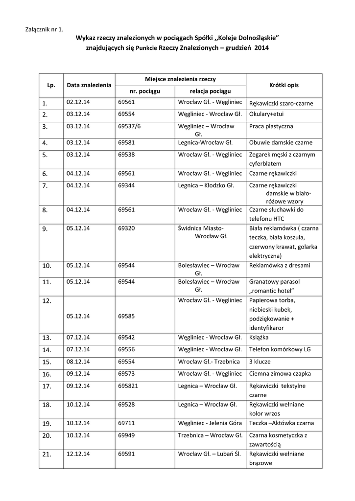 Załącznik nr 1. Wykaz rzeczy znalezionych w pociągach Spółki ,,Koleje Dolnośląskie” znajdujących się Punkcie Rzeczy Znalezionych – grudzień 2014 Lp. Data znalezienia Miejsce znalezienia rzeczy nr. pociągu relacja pociągu Krótki opis 1. 02.12.14 69561 Wrocław Gł. - Węgliniec Rękawiczki szaro-czarne 2. 03.12.14 69554 Węgliniec - Wrocław Gł. Okulary+etui 3. 03.12.14 69537/6 Praca plastyczna 4. 03.12.14 69581 Węgliniec – Wrocław Gł. Legnica-Wrocław Gł. 5. 03.12.14 69538 Wrocław Gł. - Węgliniec 6. 04.12.14 69561 Wrocław Gł. - Węgliniec Zegarek męski z czarnym cyferblatem Czarne rękawiczki 7. 04.12.14 69344 Legnica – Kłodzko Gł. 8. 04.12.14 69561 Wrocław Gł. - Węgliniec 9. 05.12.14 69320 Świdnica MiastoWrocław Gł. 10. 05.12.14 69544 11. 05.12.14 69544 Bolesławiec – Wrocław Gł. Bolesławiec – Wrocław Gł. Obuwie damskie czarne Czarne rękawiczki damskie w białoróżowe wzory Czarne słuchawki do telefonu HTC Biała reklamówka ( czarna teczka, biała koszula, czerwony krawat, golarka elektryczna) Reklamówka z dresami 05.12.14 69585 13. 07.12.14 69542 Węgliniec - Wrocław Gł. Granatowy parasol „romantic hotel” Papierowa torba, niebieski kubek, podziękowanie + identyfikaror Książka 14. 07.12.14 69556 Węgliniec - Wrocław Gł. Telefon komórkowy LG 15. 08.12.14 69554 Wrocław Gł.- Trzebnica 3 klucze 16. 09.12.14 69573 Wrocław Gł. - Węgliniec Ciemna zimowa czapka 17. 09.12.14 695821 Legnica – Wrocław Gł. 18. 10.12.14 69528 Legnica – Wrocław Gł. 19. 10.12.14 69711 Węgliniec - Jelenia Góra Rękawiczki tekstylne czarne Rękawiczki wełniane kolor wrzos Teczka –Aktówka czarna 20. 10.12.14 69949 21. 12.12.14 69591 Trzebnica – Wrocław Gł. Czarna kosmetyczka z zawartością Wrocław Gł. – Lubań Śl. Rękawiczki wełniane brązowe Wrocław Gł. - Węgliniec 12. 12.12.14 69585 24. 14.12.14 14.12.14 69591 69881 25. 15.12.14 69567 Wrocław Gł. - Węgliniec 26. 15.12.14 69881 Wrocław Gł. – Wałbrzych Gł. 27. 15.12.14 76355 Zielona Góra - Jelenia Góra 28. 16.12.14 69865 Wrocław Gł. – Szklarska Poręba Grn. 29. 17.12.14 69951 Wrocław Gł. - Trzebnica 30. 17.12.14 69573 Wrocław Gł. - Węgliniec 31. 17.12.14 69567 Wrocław Gł. - Węgliniec 32. 18.12.14 69522 Węgliniec - Wrocław Gł. 18.12.14 69881 34. 19.12.2014 69801 Czapka czarna z daszkiem 35. 19.12.14 69587 Wrocław Gł. – Wałbrzych Gł. Wrocław Gł.Dzierżoniów Śl. Wrocław Gł. - Węgliniec 36. 20,12,14 69801 37. 20.12.14 69542 Czarny plecak 38. 20.12.14 69598 Wrocław Gł. – Dzierżoniów Śl. Węgliniec – Wrocław Gł. Zgorzelec - Węgliniec 39. 21.12.14 69569 Wrocław Gł. - Zgorzelec 40. 22.12.14 69567 Wrocław Gł. - Węgliniec 41. 23.12.14 69534 Węgliniec - Wrocław Gł. 42. 25.12.4 69536 Węgliniec - Wrocław Gł. 43. 26.12.14 69567 Wrocław Gł. - Węgliniec 22. Wrocław Gł. - Węgliniec Wrocław Gł. – Lubań Śl. 23. Wrocław Gł. – Wałbrzych Gł. 33. Szary plecak z czarnymi ,identyfikator, opalarka elektryczna Czarna czapka OBEY Czarny plecak odzież + kosmetyki Czarne damskie rękawiczki Mała torba podróżna brązowa (ubrania ładowarka, perfumy) Buty sportowe niebieskoczerwone Reklamówka biała ze strojem gimnastycznym Projekt inżynierski Legitymacja szkolna + bilet Reklamówka jednorazowa z odzieżą i katalogiem NATURA TOUR OKULARY W METALOWEJ OPRAWCE. MAŁY SREBRNY KLUCZ Plecak zielono-czarny zawartość: ubrania+ kosmetyki Okulary „filmann” Czerwony metalowy termos, damski szal Telefon komórkowy. Książka ,,Kapitan na służbie’’+okulary Kurtka męska szara z pasami na rękawach. Czerwona poduszka (jasiek) z logo firmy. Plecak niebiesko szary NIKE w środku gra elektroniczna 44. 27.12.14 69554 Węgliniec - Wrocław Gł. 45. 27.12.14 69573 Wrocław Gł. - Węgliniec 46. 28.12.14 69593 Wrocław Gł. - Węgliniec 47. 29.12.14 69883 Wrocław Gł. – Jelenia Góra 48. 30.12.14 69865 49. 31.12.14 69585 Wrocław Gł. – Szklarka Poręba Grn. Wrocław Gł. - Węgliniec 50. 31.12.14 69828 51. 31.12.2014 69583 Szklarska Poręba Grn. – Wrocław Gł. Wrocław Gł. - Węgliniec szalik w kratę i butelka wódki Portfel czarny, legitymacja MAŁY ZIELONY PLECAK , DEZODORANT Szara torba(ubrania ,klapki, kosmetyki, golarka elektryczna) Telefon komórkowy Buty damskie czarno – złote + baletki Czapka szara damska Kalkulator